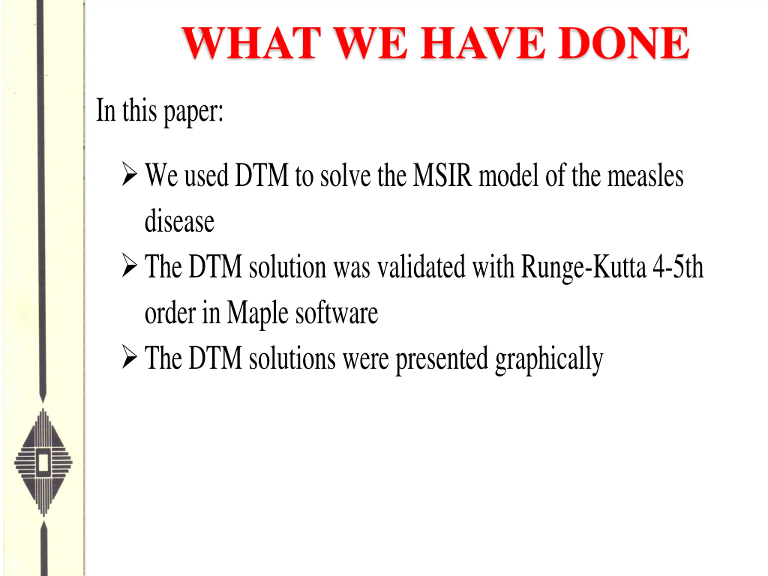 WHAT WE HAVE DONE In this paper: We used DTM to solve the MSIR model of the measles disease The DTM solution was validated with Runge-Kutta 4-5th order in Maple software The DTM solutions were presented graphically