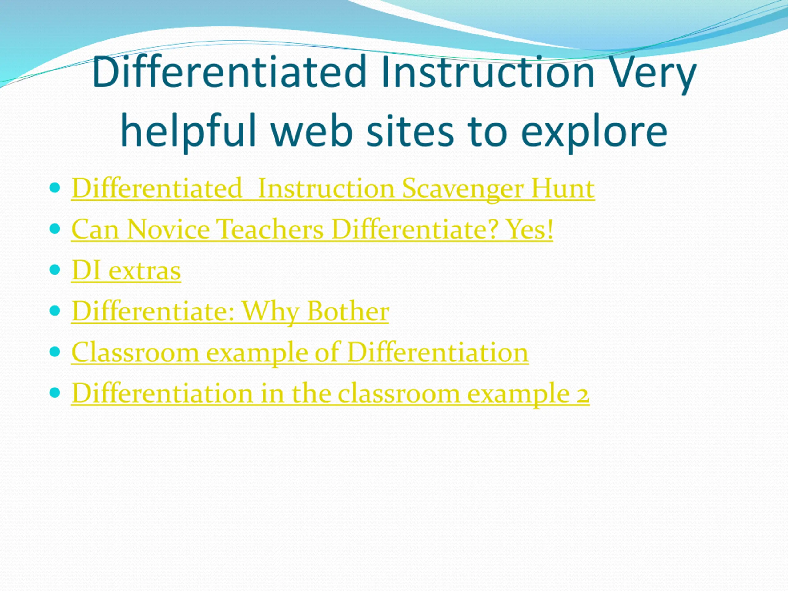 Differentiated Instruction Very helpful web sites to explore Differentiated Instruction Scavenger Hunt Can Novice Teachers Differentiate? Yes! DI extras Differentiate: Why Bother Classroom example of Differentiation Differentiation in the classroom example 2