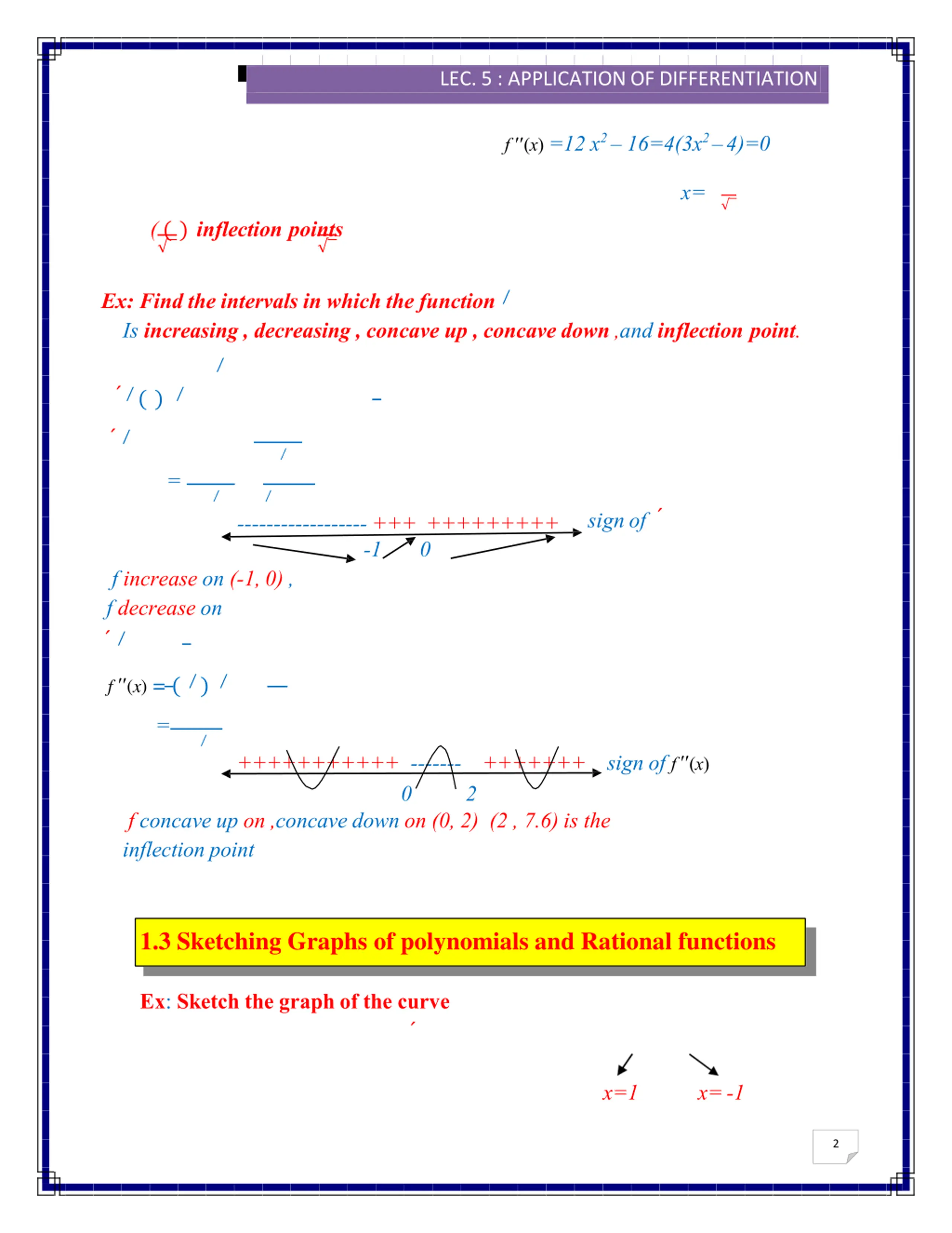 2016/2017 LEC. 5 : APPLICATION OFDIFFERENTIATION f (x) =12 x2 16=4(3x2 4)=0 x= ( ( ) inflection points Ex: Find the intervals in which the function Is increasing , decreasing , concave up , concave down ,and inflection point. ( ) = sign of ------------------ +++ +++++++++ -1 f increase on (-1, 0) , f decrease on 0 f (x) = ( ) = sign of f (x) +++++++++++ ------- +++++++ 0 2 f concave up on ,concave down on (0, 2) (2 , 7.6) is the inflection point 1.3 Sketching Graphs of polynomials and Rational functions Ex: Sketch the graph of the curve x=1 x=-1 2