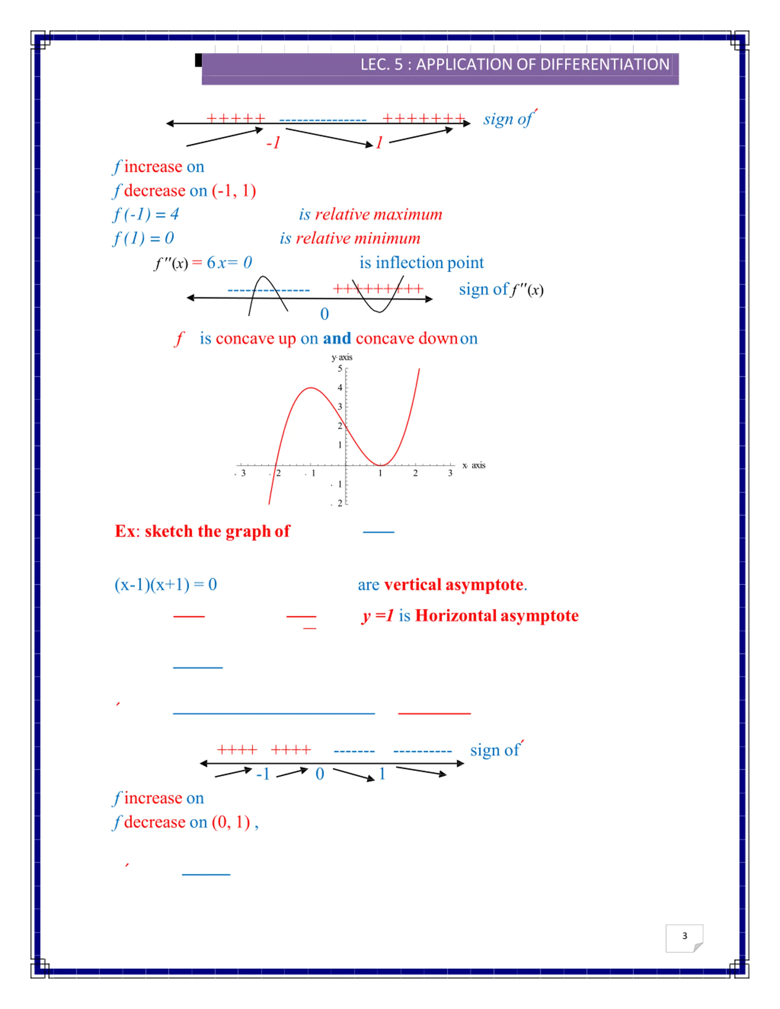 2016/2017 LEC. 5 : APPLICATION OFDIFFERENTIATION sign of +++++ --------------- +++++++ -1 1 f increase on f decrease on (-1, 1) f (-1) =4 f (1) =0 f (x) = 6x= 0 is relative maximum is relative minimum is inflectionpoint -------------- +++++++++ 0 is concave up on and concave downon y axis 5 sign of f (x) f 4 3 2 1 x axis 3 2 1 1 2 3 1 2 Ex: sketch the graphof (x-1)(x+1) = 0 are vertical asymptote. y =1 is Horizontalasymptote ---------- sign of ++++ ++++ -1 ------- 1 0 f increase on f decrease on (0, 1) , 3