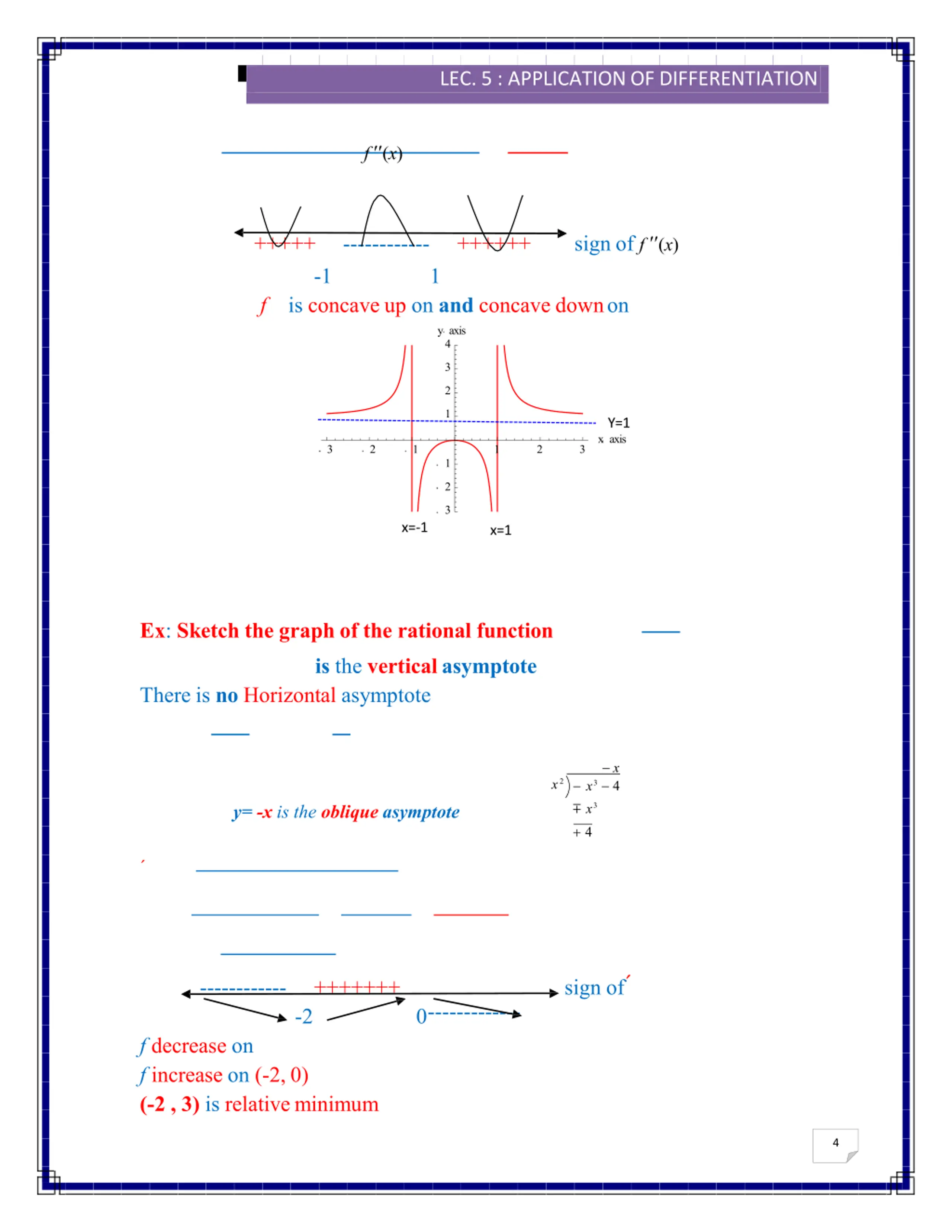 2016/2017 LEC. 5 : APPLICATION OFDIFFERENTIATION f (x) sign of f (x) +++++ ------------ ++++++ -1 1 f is concave up on and concave downon y axis 4 3 2 1 Y=1 x axis 3 2 1 1 2 3 1 2 3 x=-1 x=1 Ex: Sketch the graph of the rational function is the verticalasymptote There is no Horizontal asymptote x x2 x3 4 x3 + 4 y= -x is the oblique asymptote sign of ------------ +++++++ ------------- -2 0 f decrease on f increase on (-2, 0) (-2 , 3) is relativeminimum 4