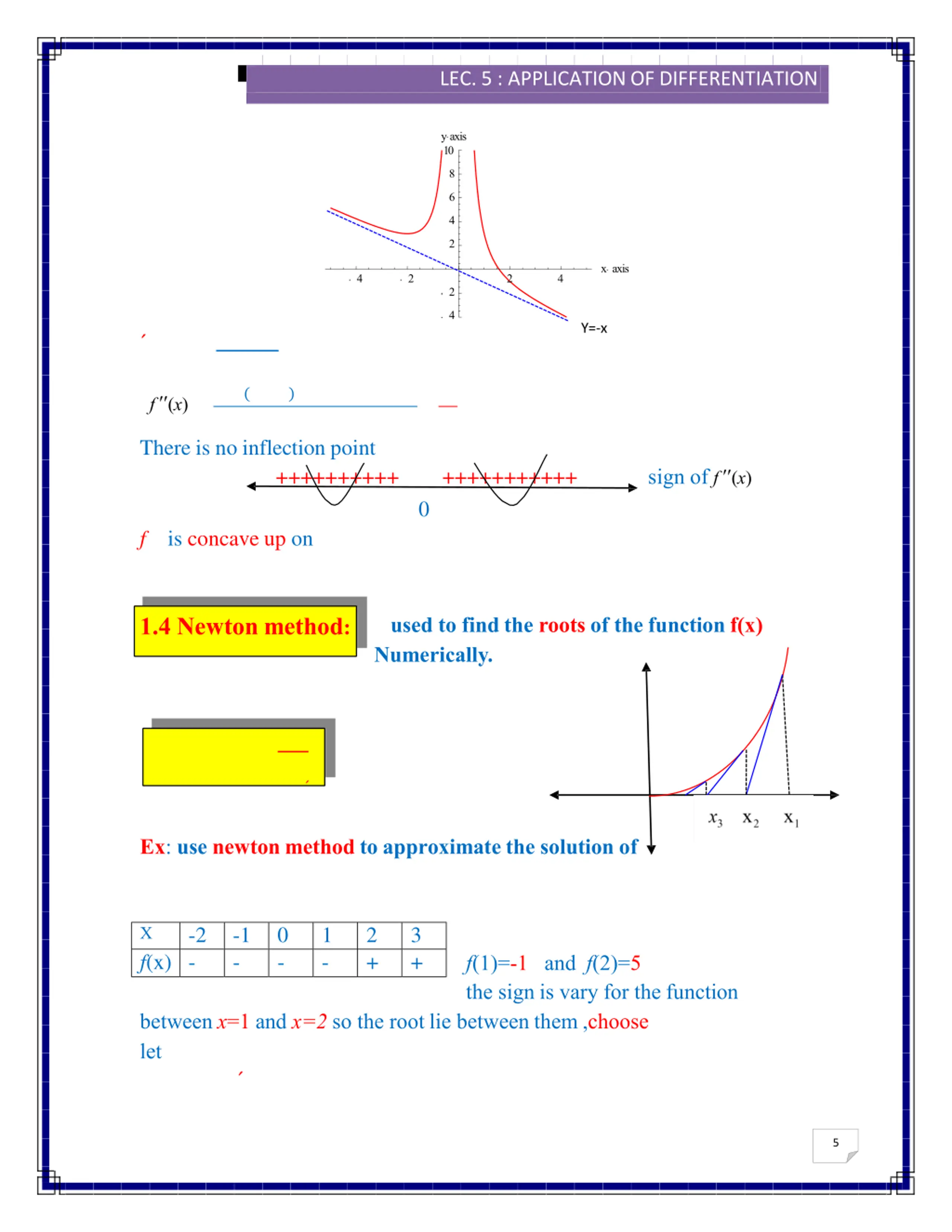 2016/2017 LEC. 5 : APPLICATION OFDIFFERENTIATION y axis 10 8 6 4 2 x axis 4 4 2 2 2 4 Y=-x ( ) f (x) There is no inflection point sign of f (x) ++++++++++ +++++++++++ 0 is concave up on f 1.4 Newton method: used to find the roots of the function f(x) Numerically. Ex: use newton method to approximate the solution of -2 -1 - 0 - 1 - 2 + 3 + X f(x) - f(1)=-1 and f(2)=5 the sign is vary for the function between x=1 and x=2 so the root lie between them ,choose let 5