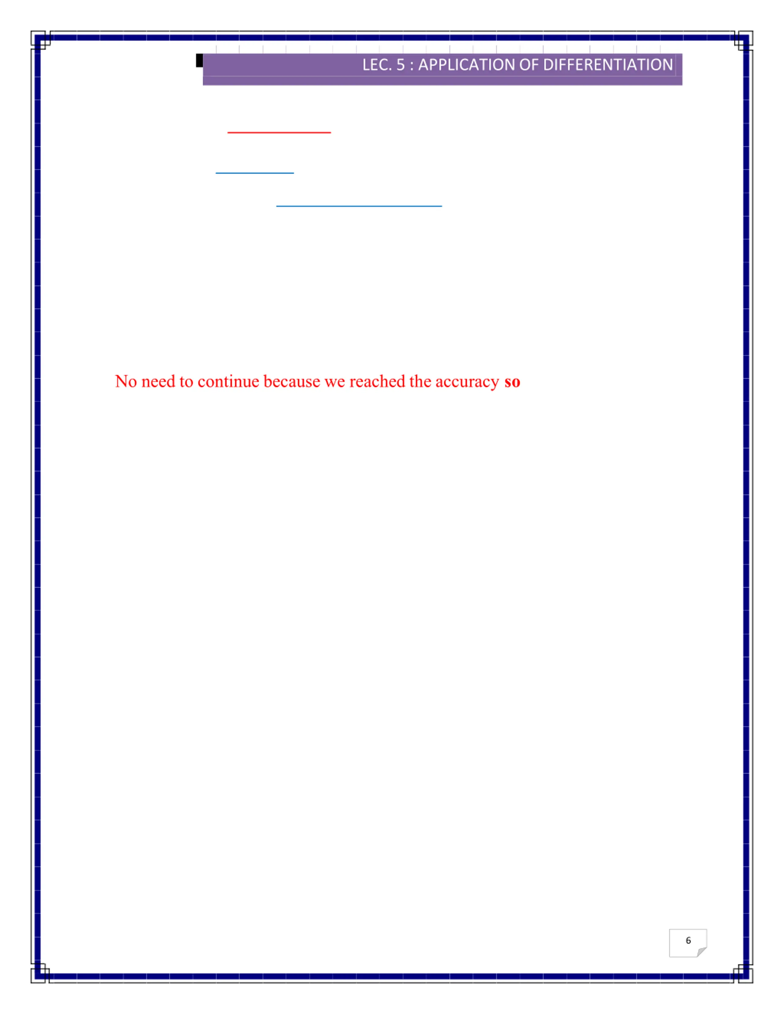 2016/2017 LEC. 5 : APPLICATION OFDIFFERENTIATION No need to continue because we reached the accuracy so 6