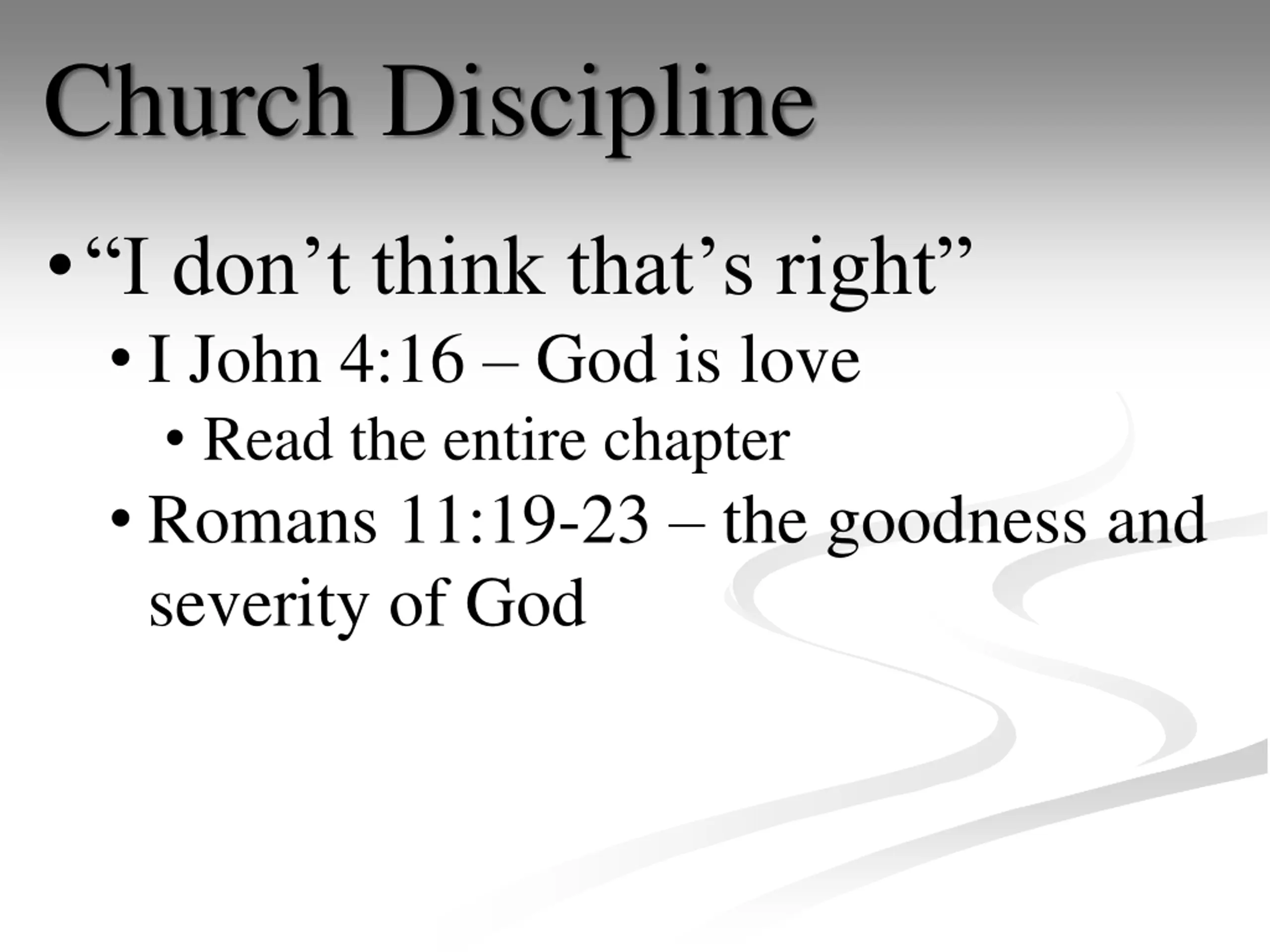 Church Discipline I don t think that s right I John 4:16 God is love Read the entire chapter Romans 11:19-23 the goodness and severity of God