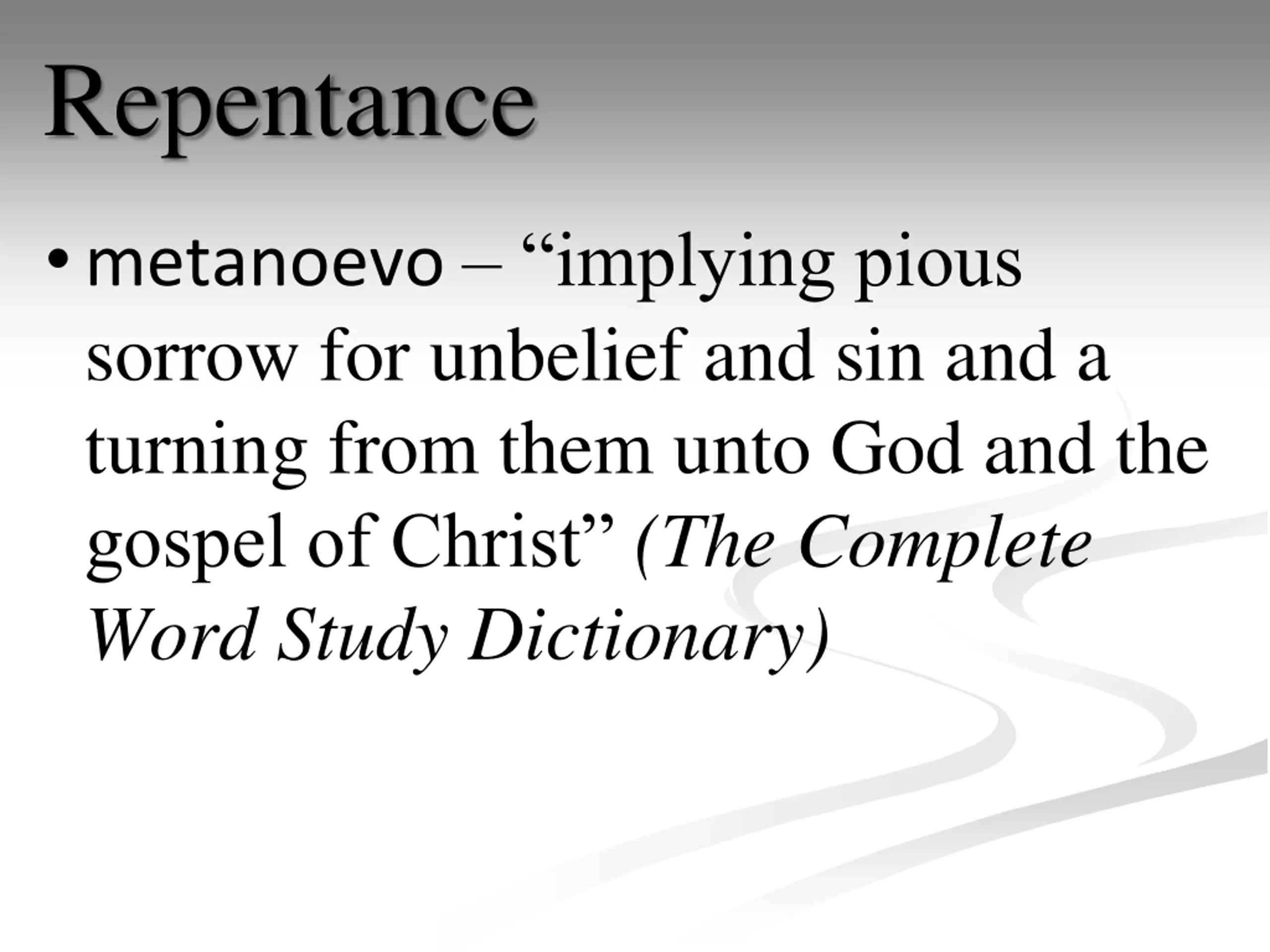 Repentance metanoevo implying pious sorrow for unbelief and sin and a turning from them unto God and the gospel of Christ (The Complete Word Study Dictionary)