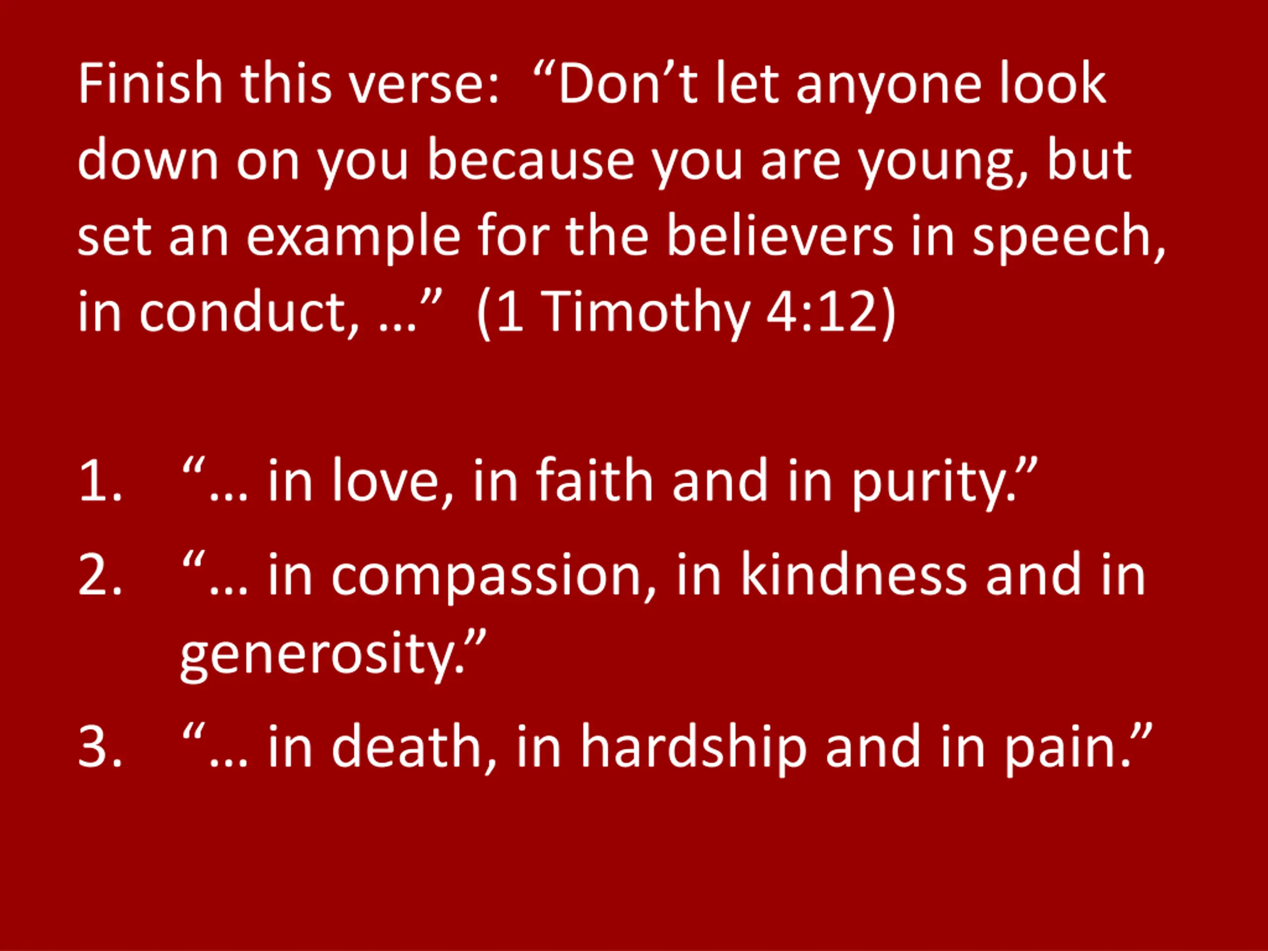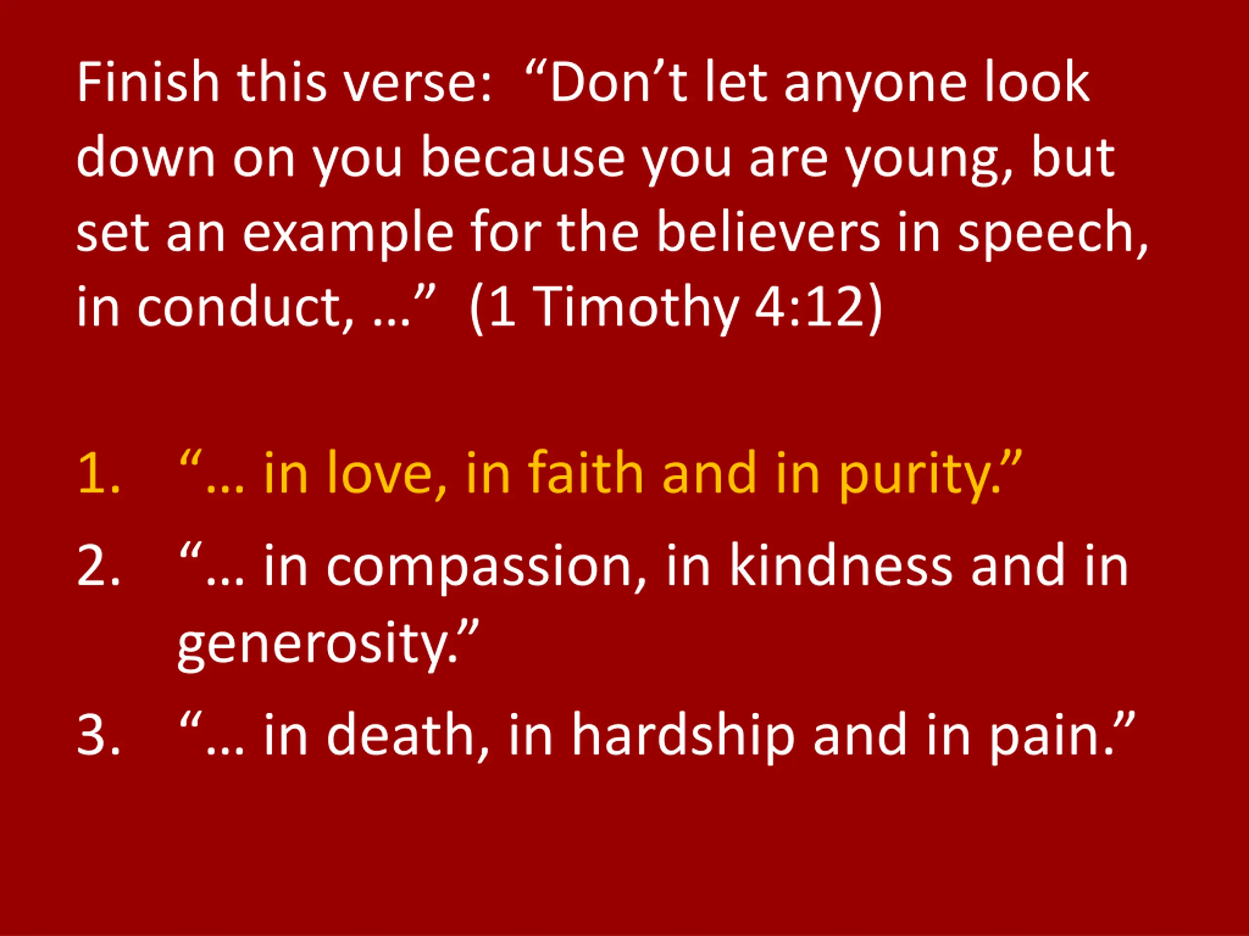 Finish this verse: Dont let anyone look down on you because you are young, but set an example for the believers in speech, in conduct, (1 Timothy 4:12) 1. in love, in faith and in purity. 2. in compassion, in kindness and in generosity. 3. in death, in hardship and in pain.
