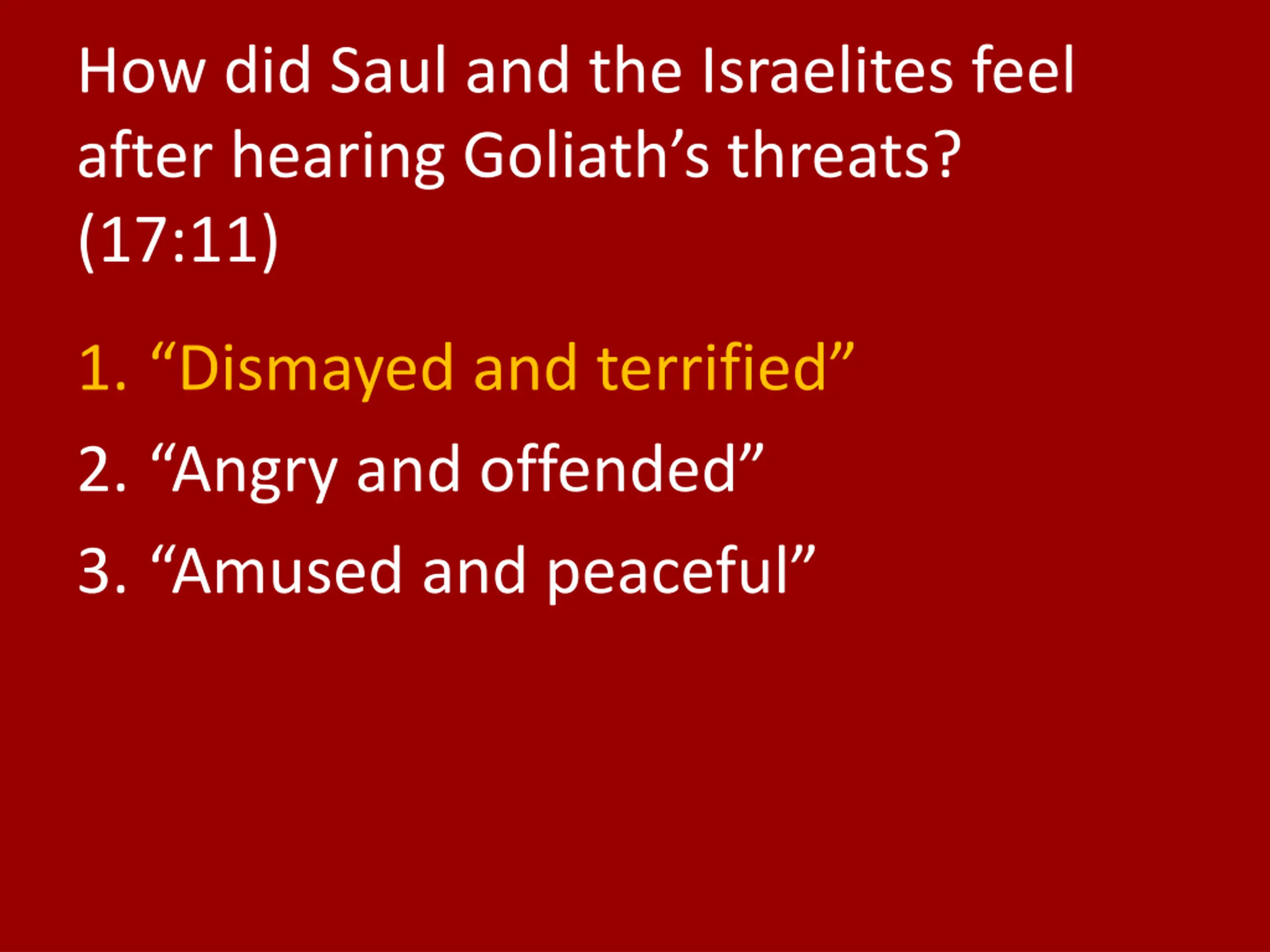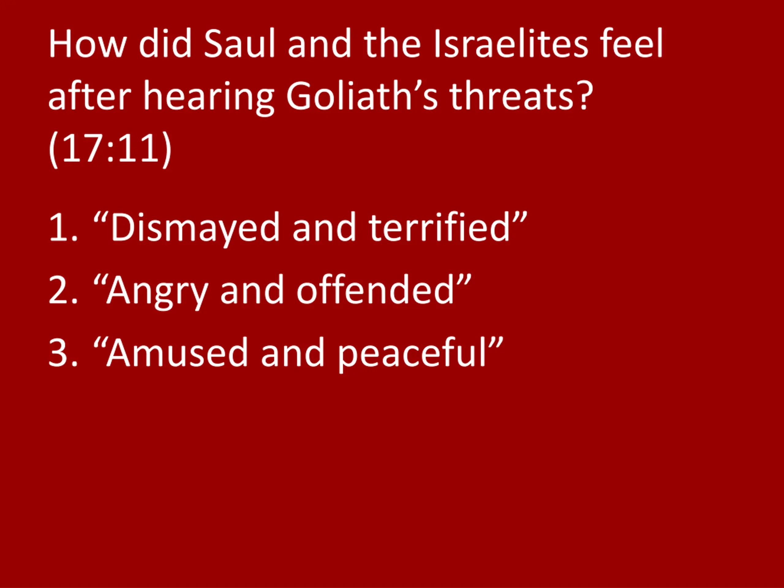 How did Saul and the Israelites feel after hearing Goliath s threats? (17:11) 1. Dismayed and terrified 2. Angry and offended 3. Amused and peaceful