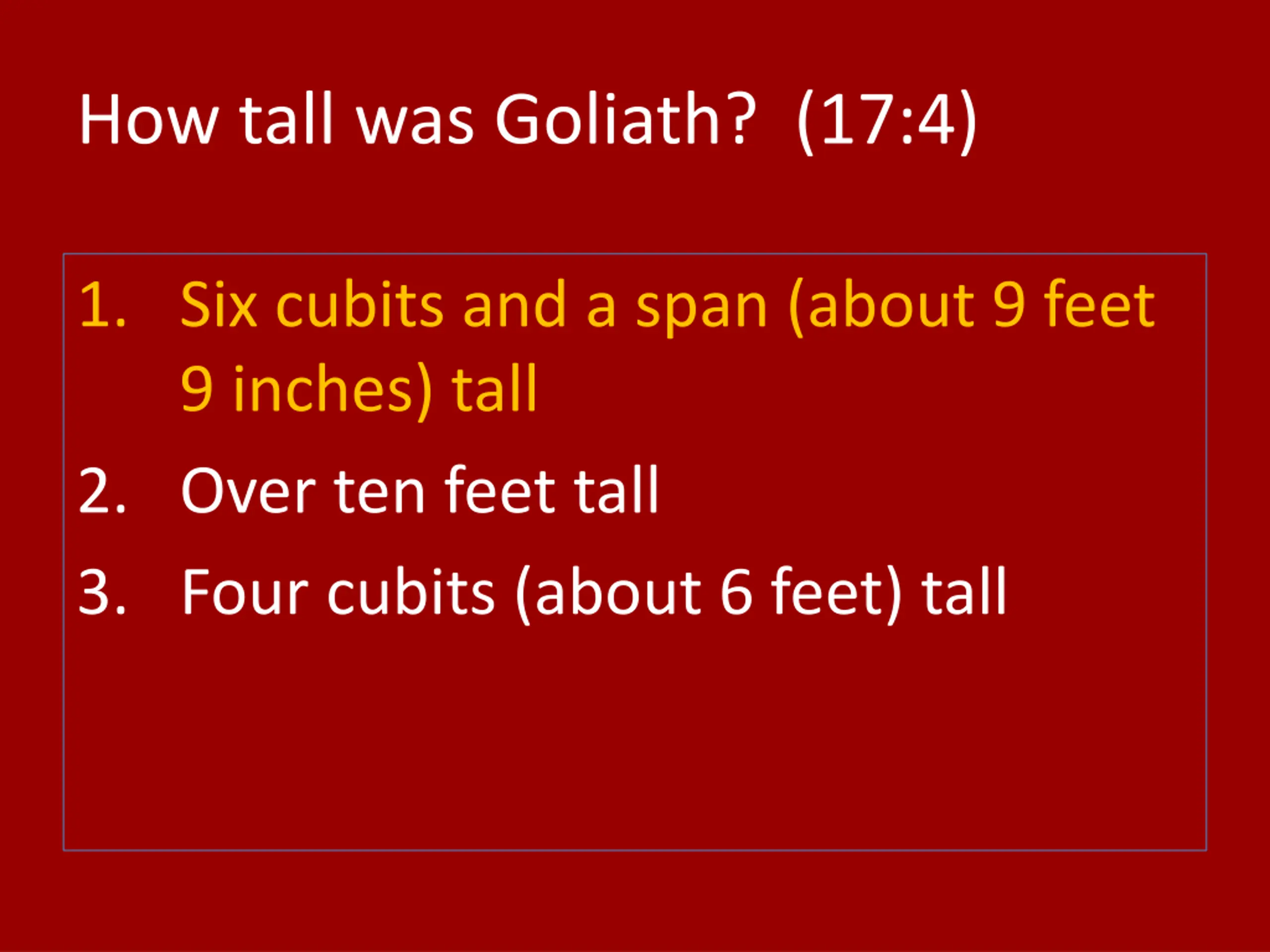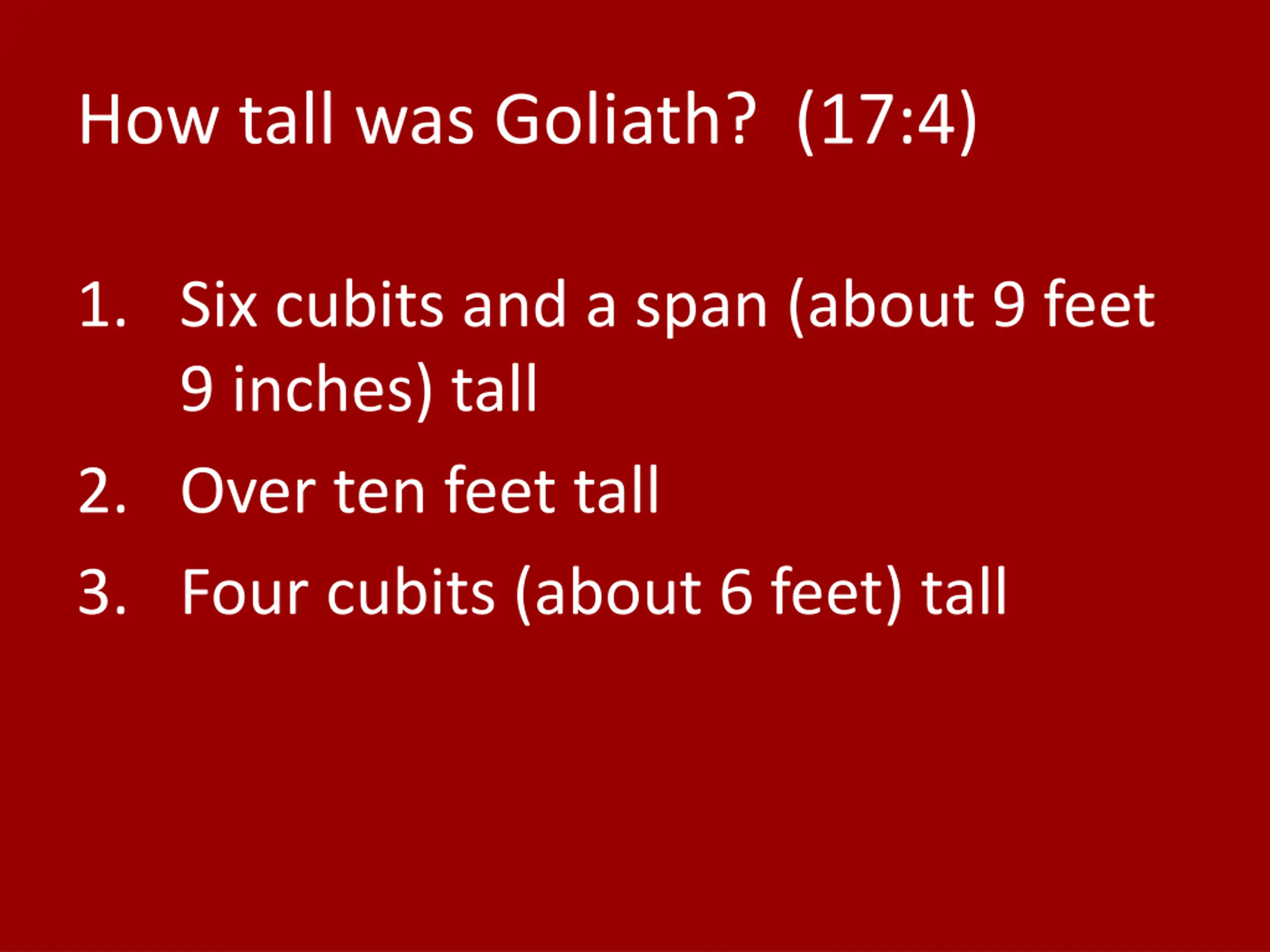 How tall was Goliath? (17:4) 1. Six cubits and a span (about 9 feet 9 inches) tall 2. Over ten feet tall 3. Four cubits (about 6 feet) tall