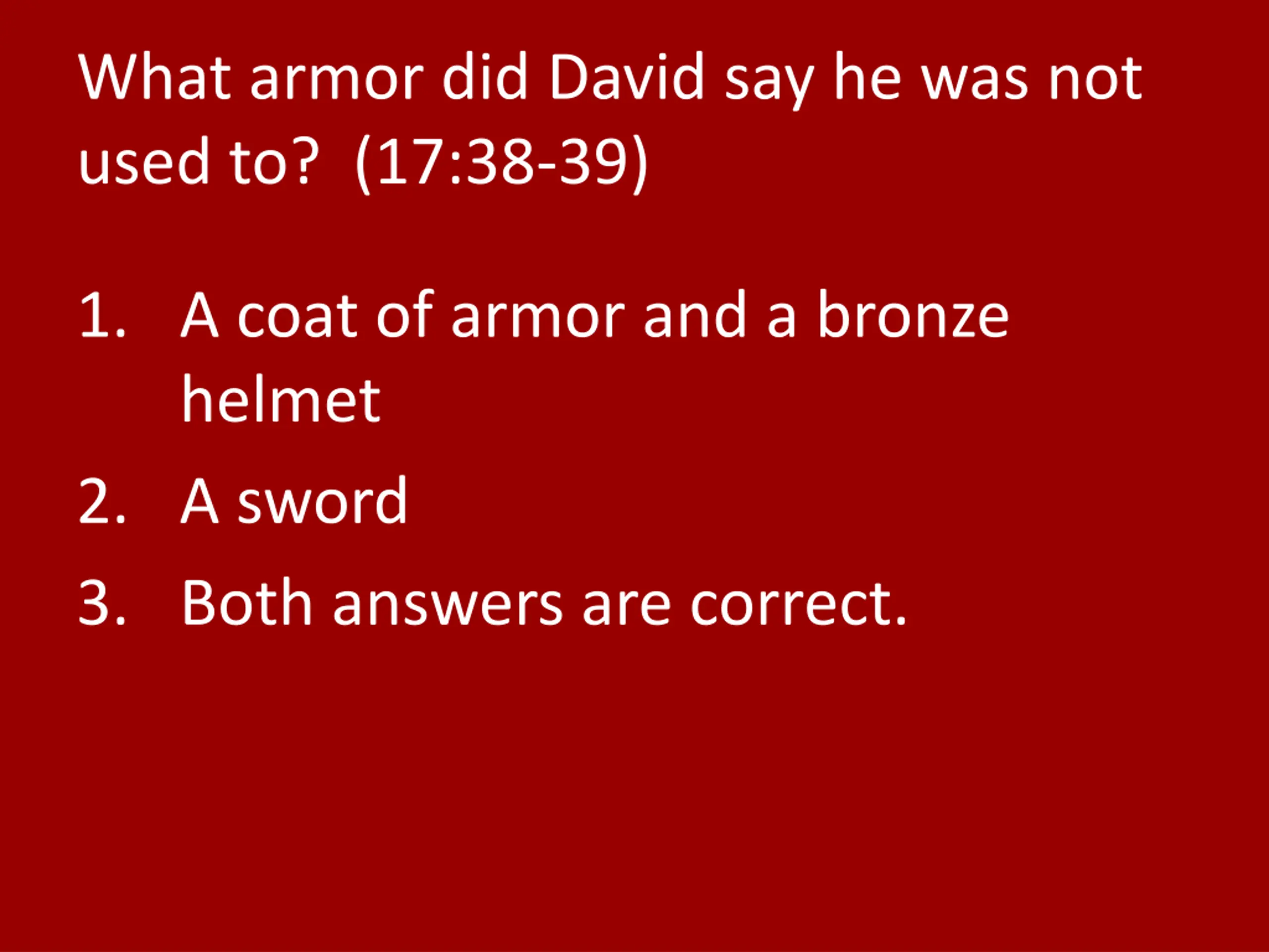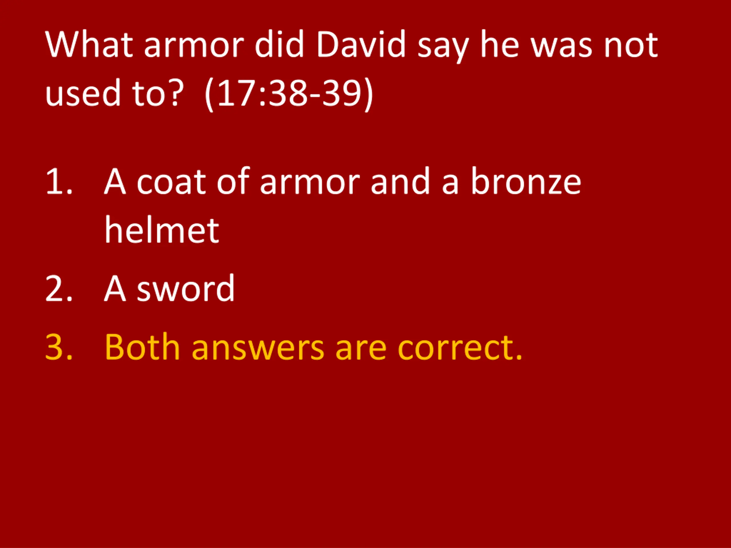 What armor did David say he was not used to? (17:38-39) 1. A coat of armor and a bronze helmet 2. A sword 3. Both answers are correct.