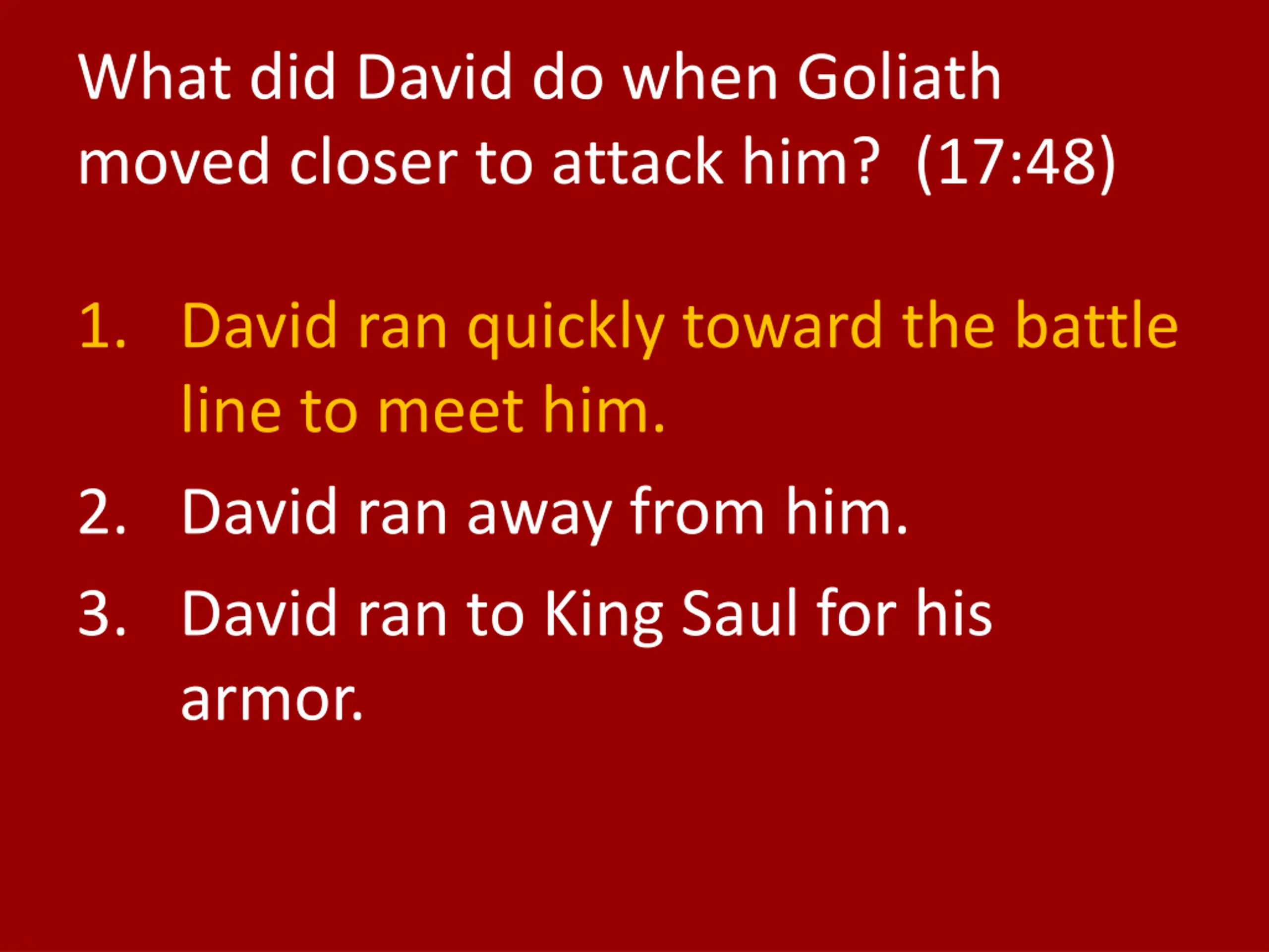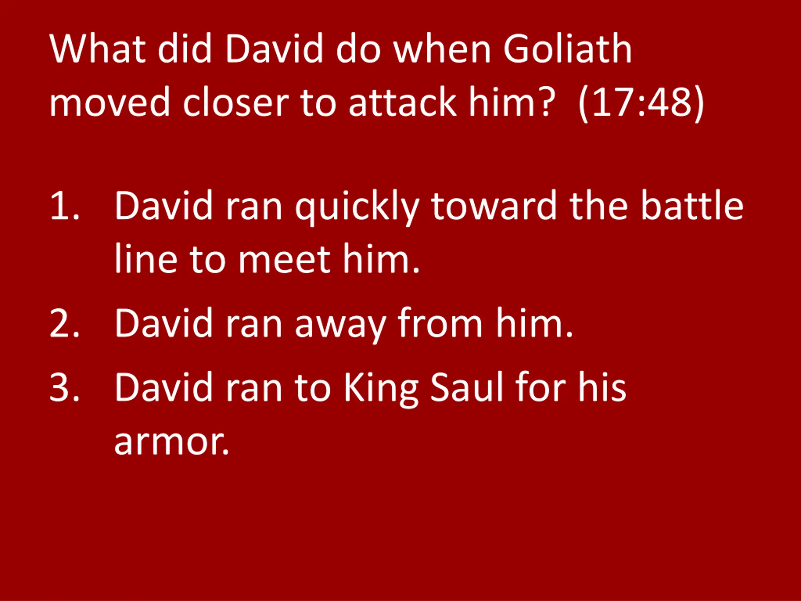 What did David do when Goliath moved closer to attack him? (17:48) 1. David ran quickly toward the battle line to meet him. 2. David ran away from him. 3. David ran to King Saul for his armor.