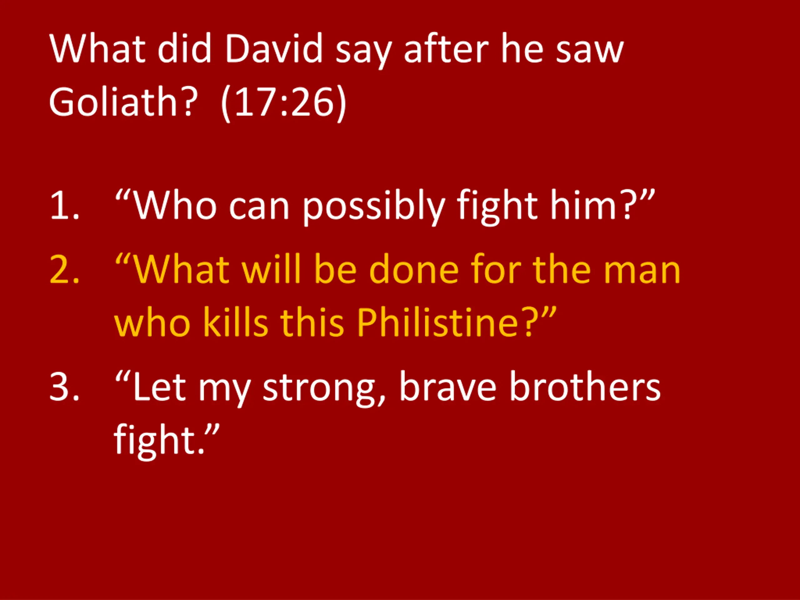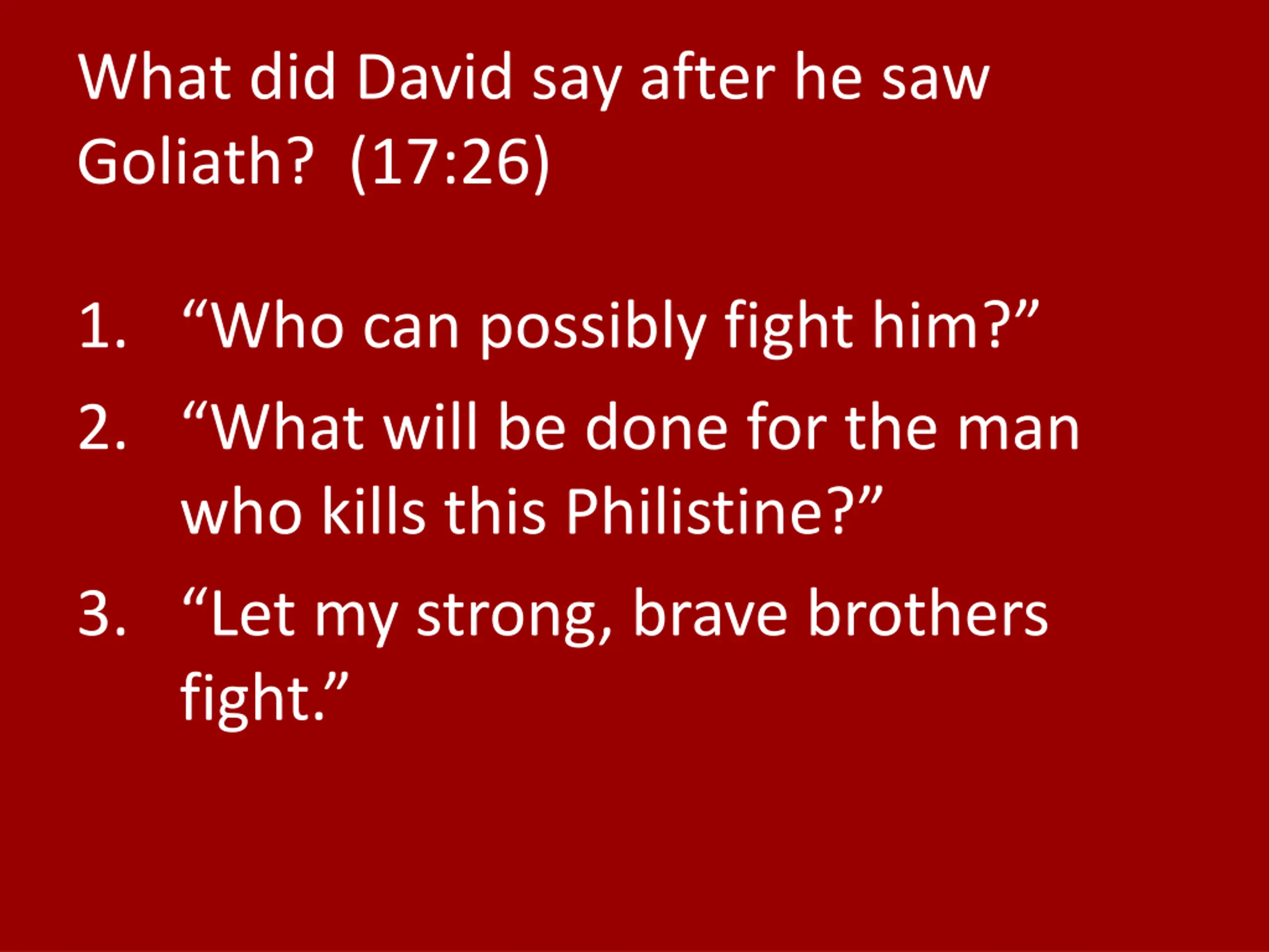 What did David say after he saw Goliath? (17:26) 1. Who can possibly fight him? 2. What will be done for the man who kills this Philistine? 3. Let my strong, brave brothers fight.
