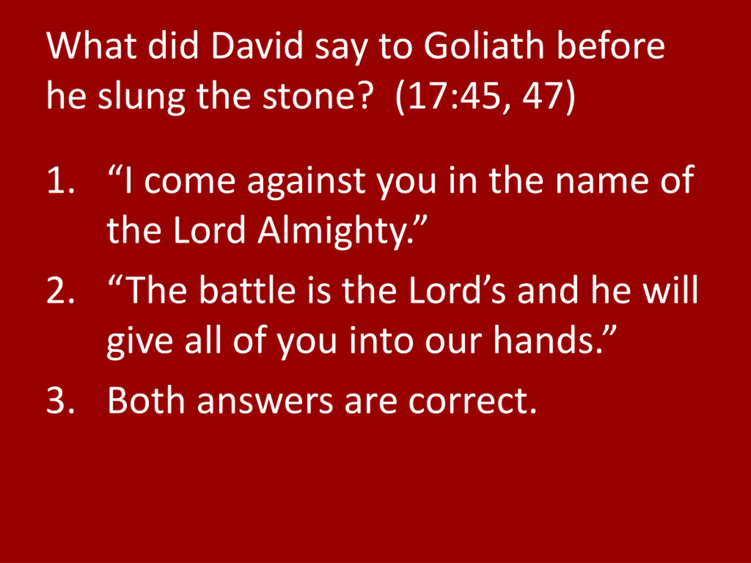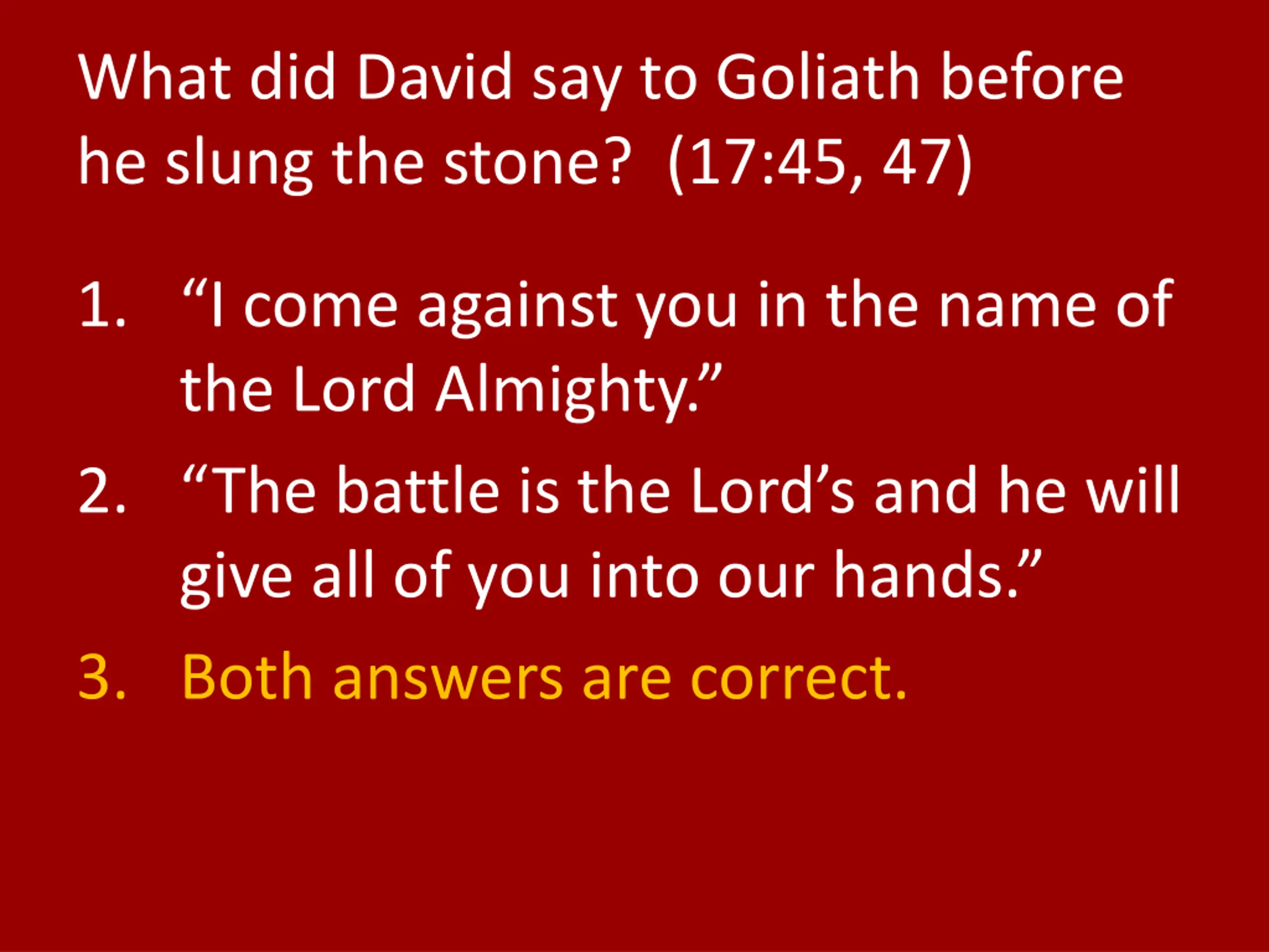 What did David say to Goliath before he slung the stone? (17:45, 47) 1. I come against you in the name of the Lord Almighty. 2. The battle is the Lord s and he will give all of you into our hands. 3. Both answers are correct.