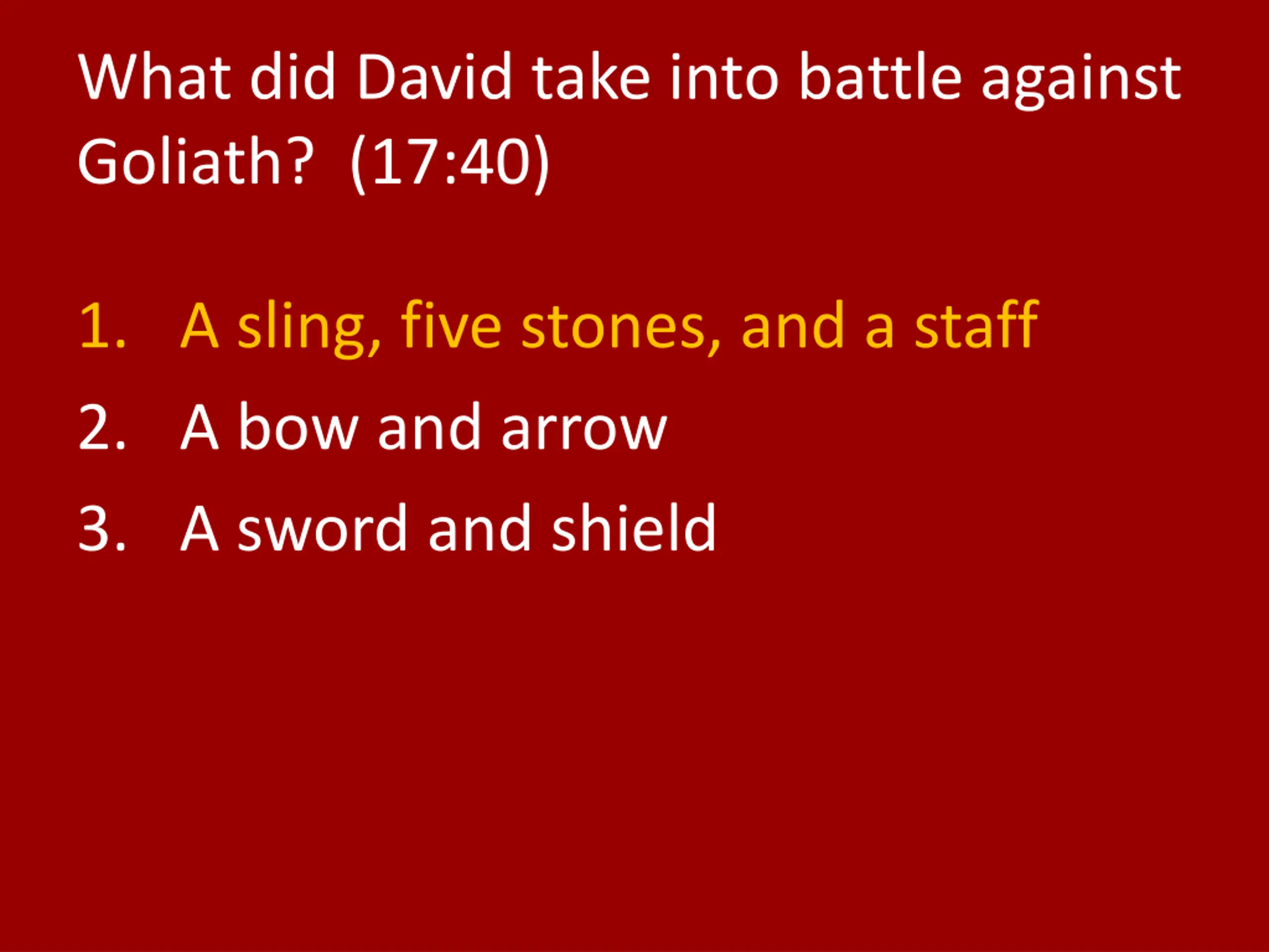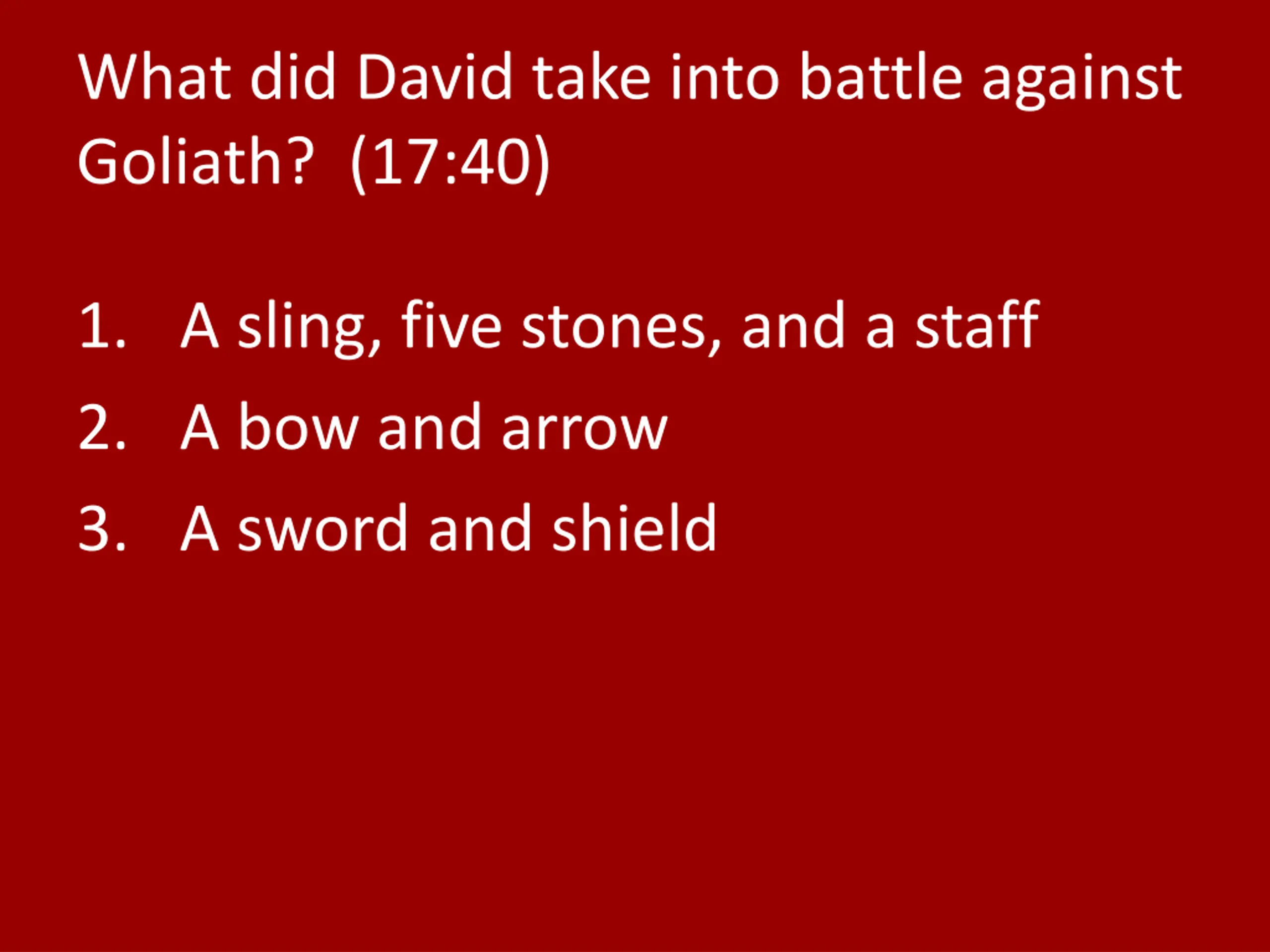 What did David take into battle against Goliath? (17:40) 1. A sling, five stones, and a staff 2. A bow and arrow 3. A sword and shield