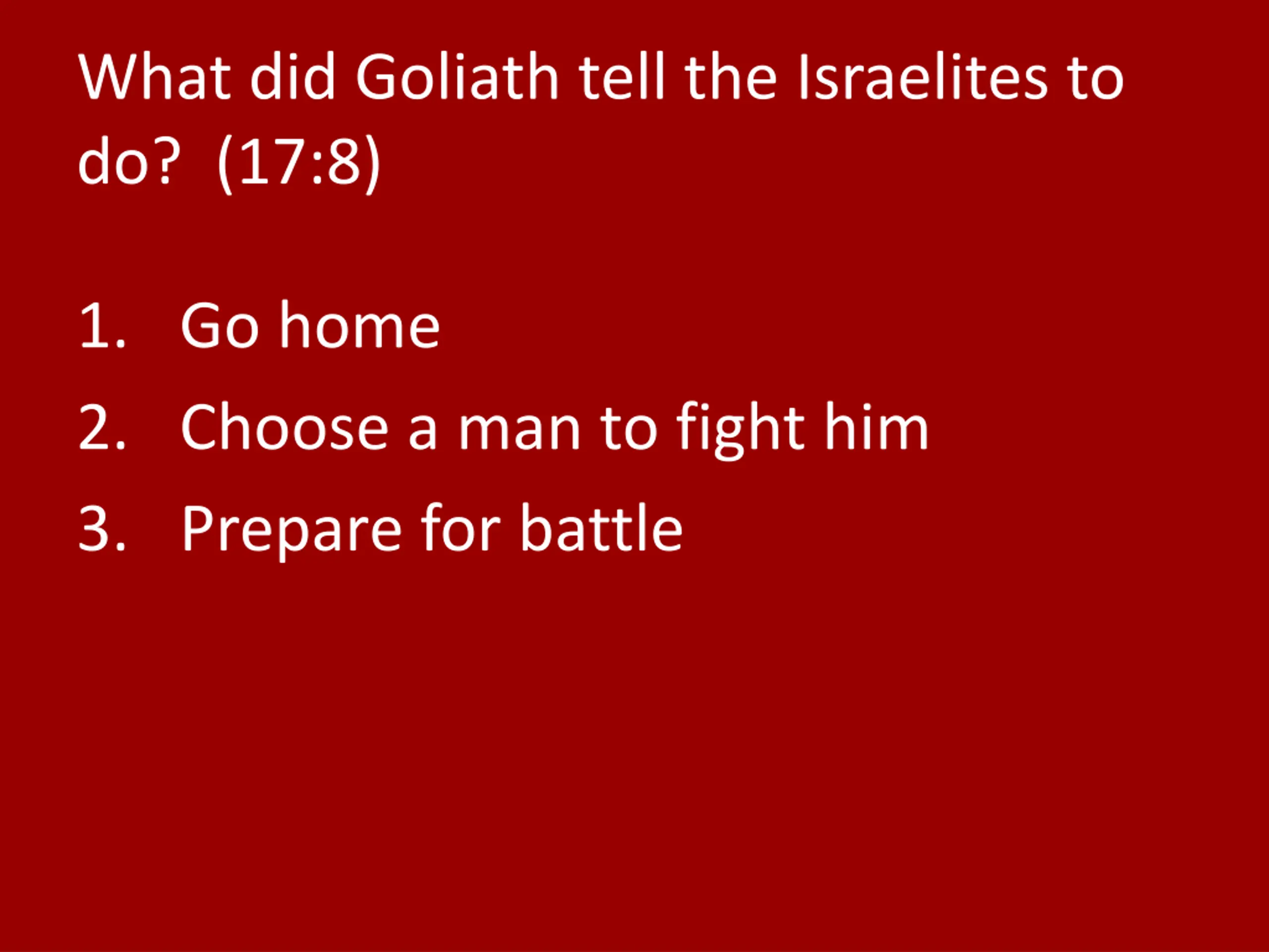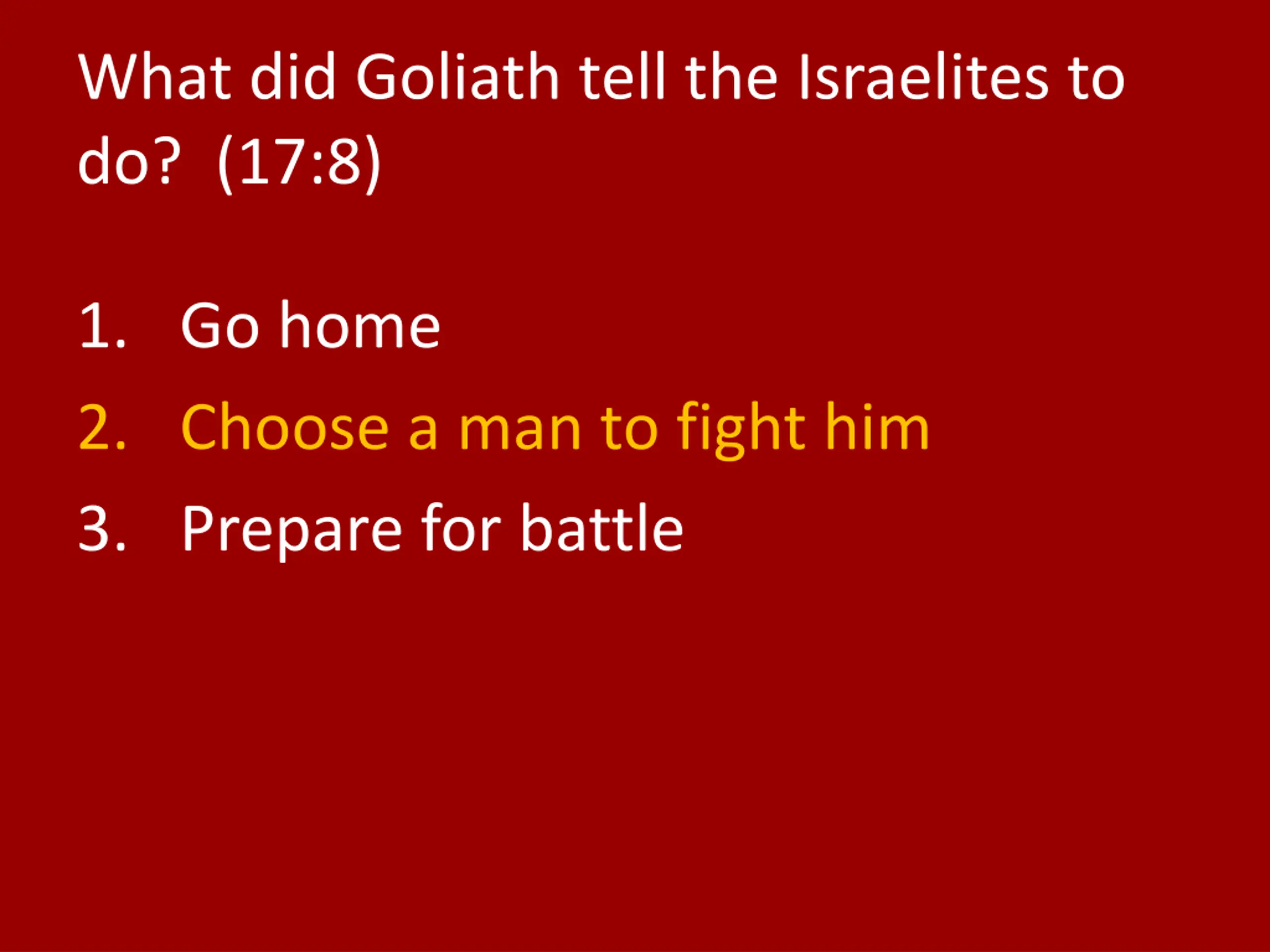 What did Goliath tell the Israelites to do? (17:8) 1. Go home 2. Choose a man to fight him 3. Prepare for battle
