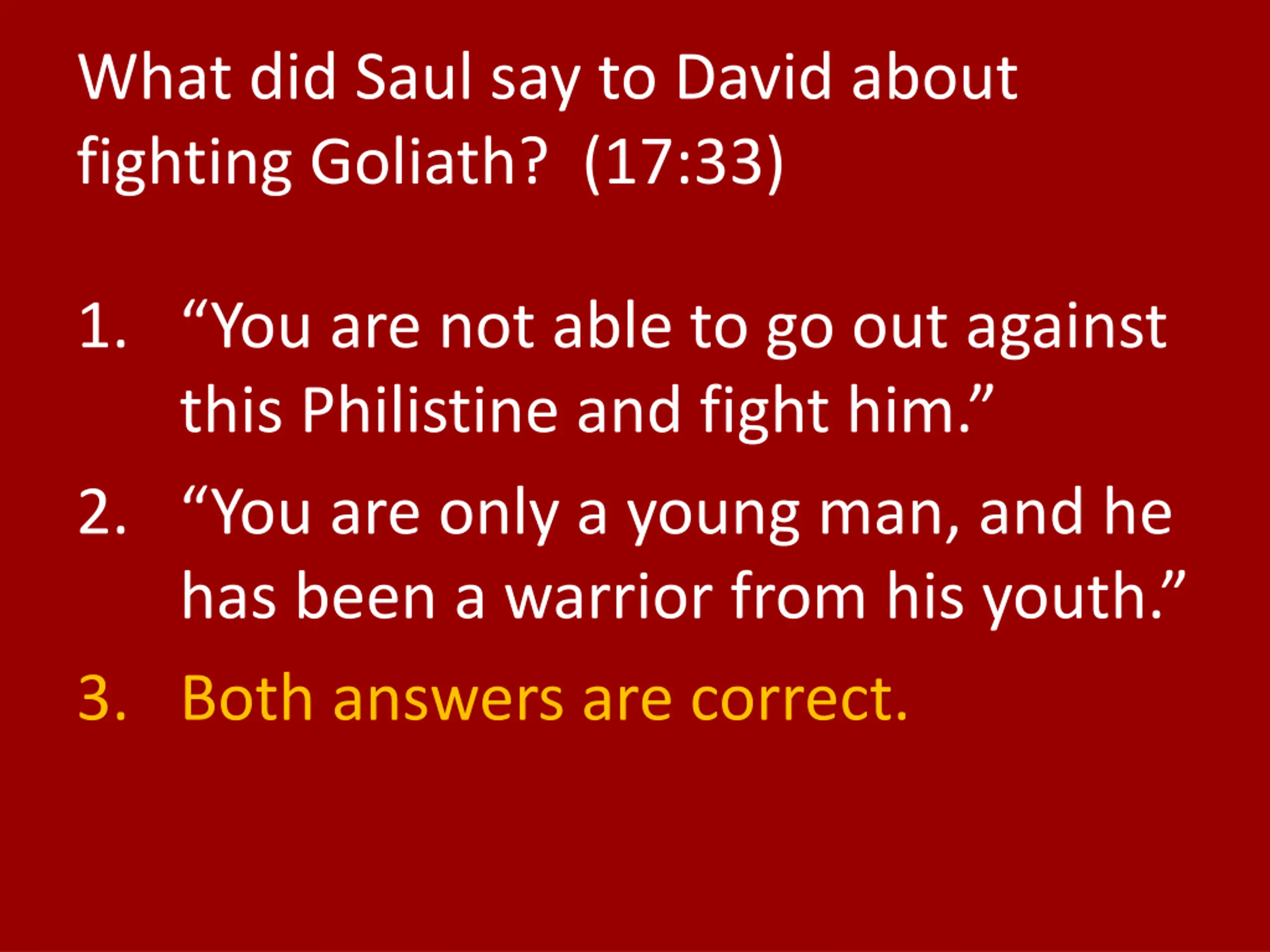 What did Saul say to David about fighting Goliath? (17:33) 1. You are not able to go out against this Philistine and fight him. 2. You are only a young man, and he has been a warrior from his youth. 3. Both answers are correct.