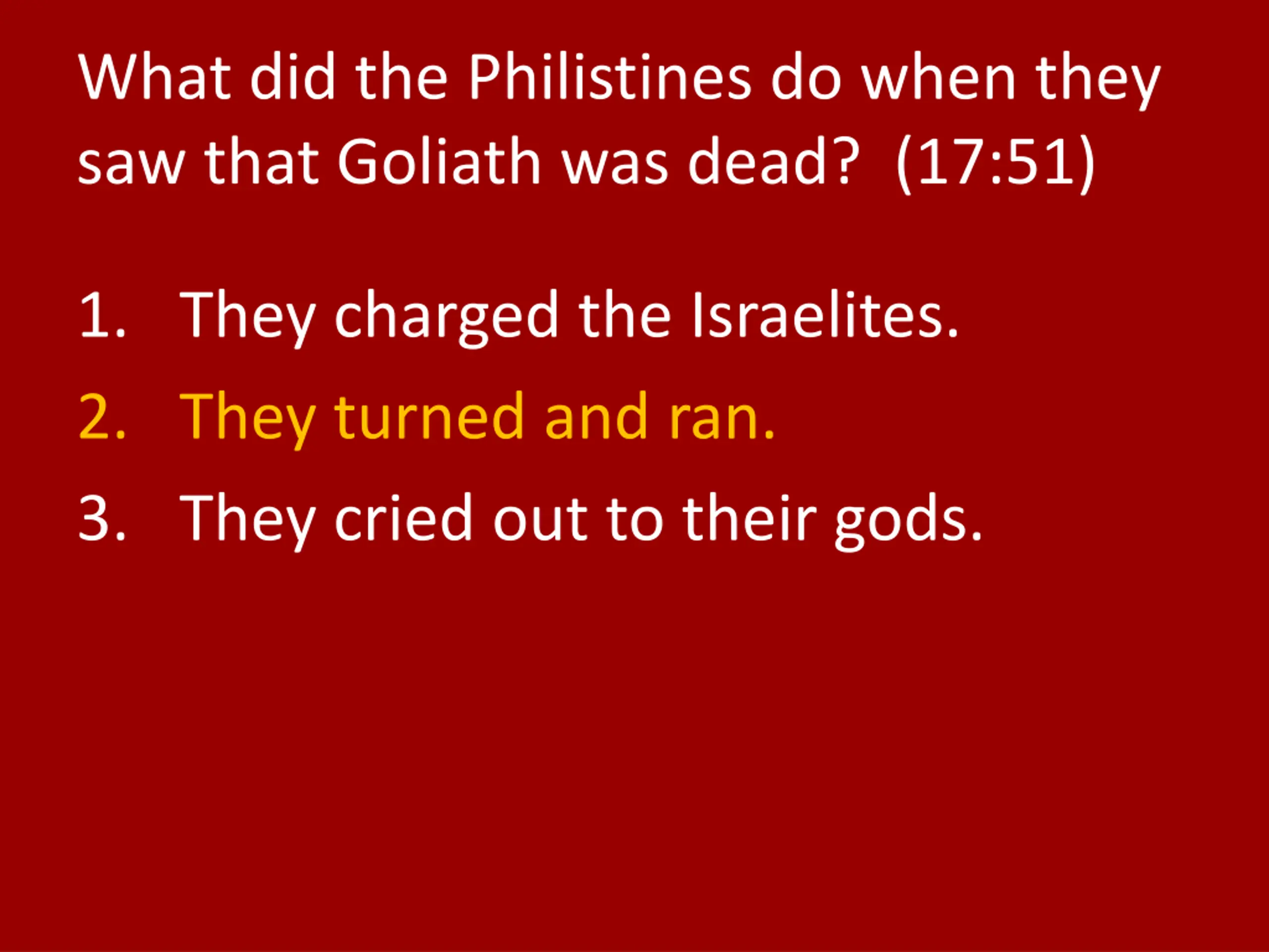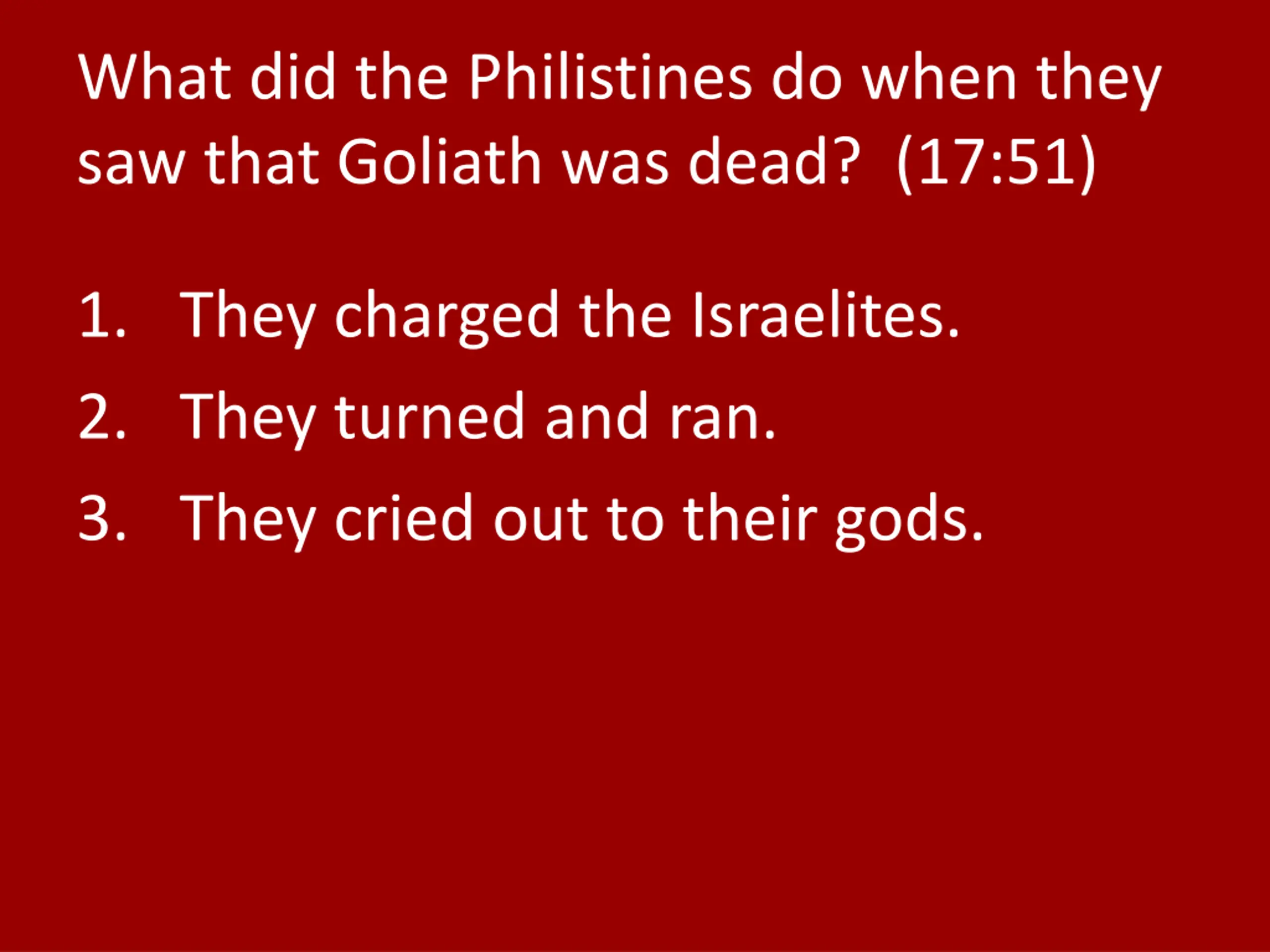 What did the Philistines do when they saw that Goliath was dead? (17:51) 1. They charged the Israelites. 2. They turned and ran. 3. They cried out to their gods.