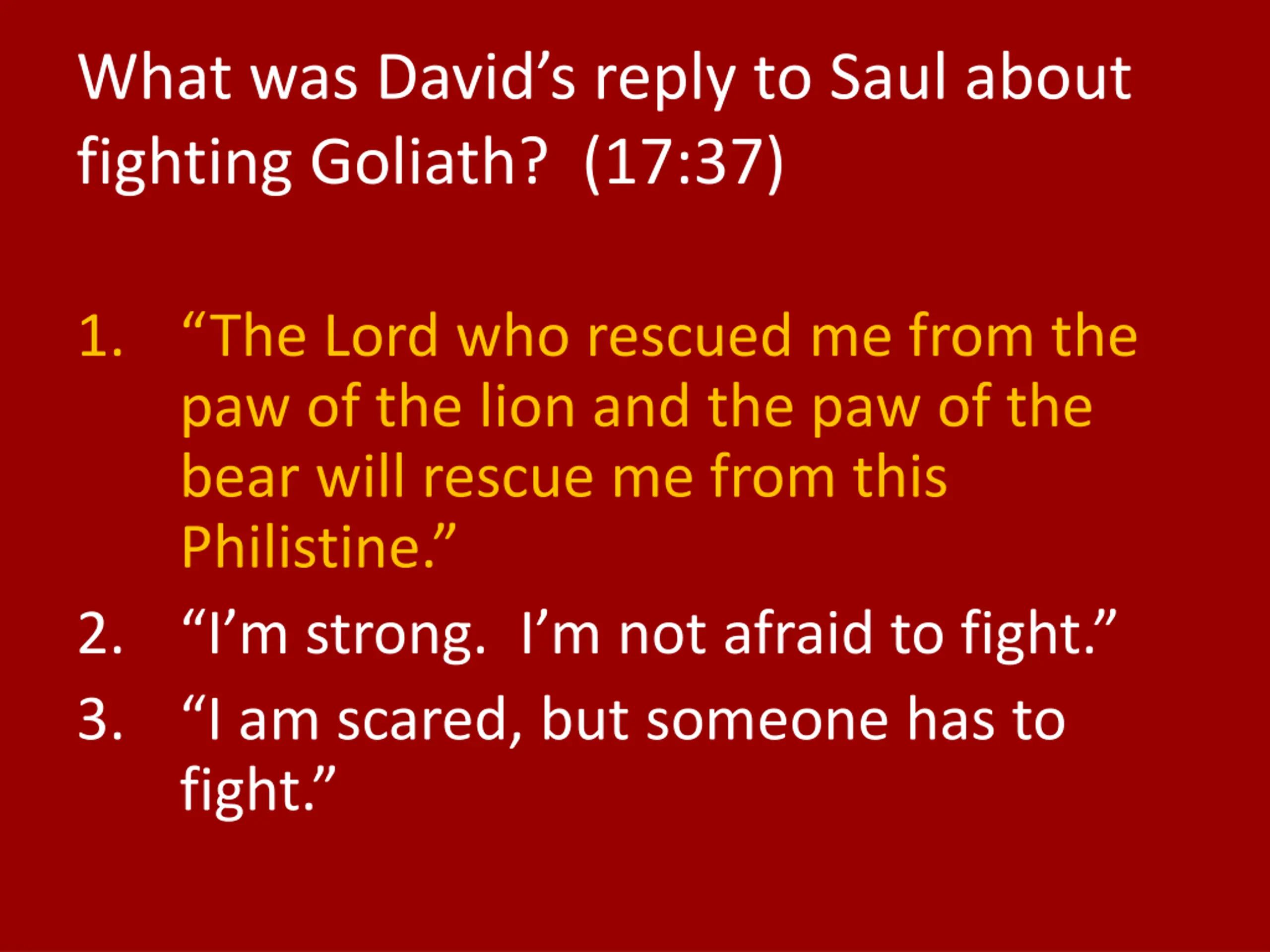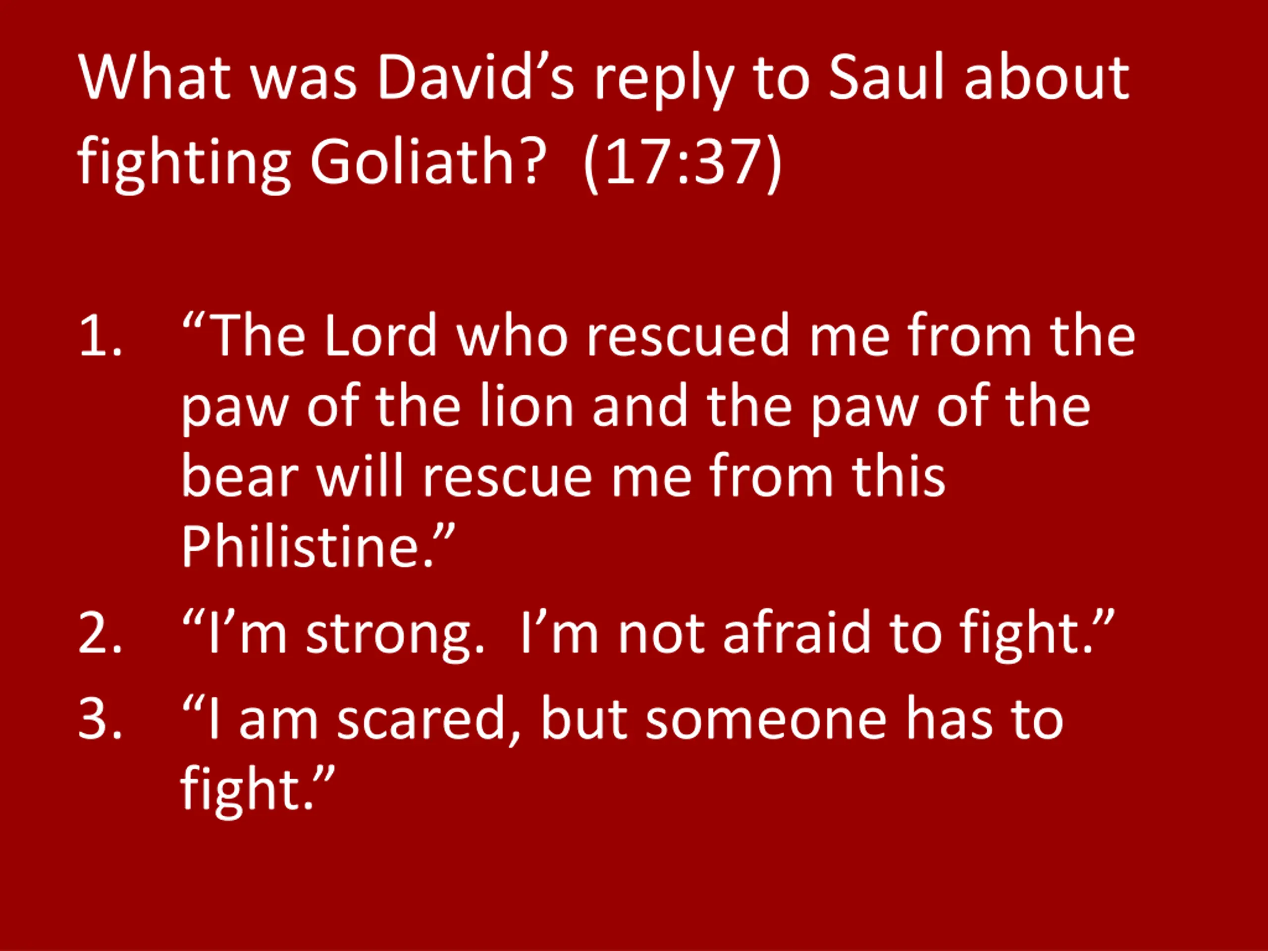 What was Davids reply to Saul about fighting Goliath? (17:37) 1. The Lord who rescued me from the paw of the lion and the paw of the bear will rescue me from this Philistine. 2. I m strong. I m not afraid to fight. 3. I am scared, but someone has to fight.