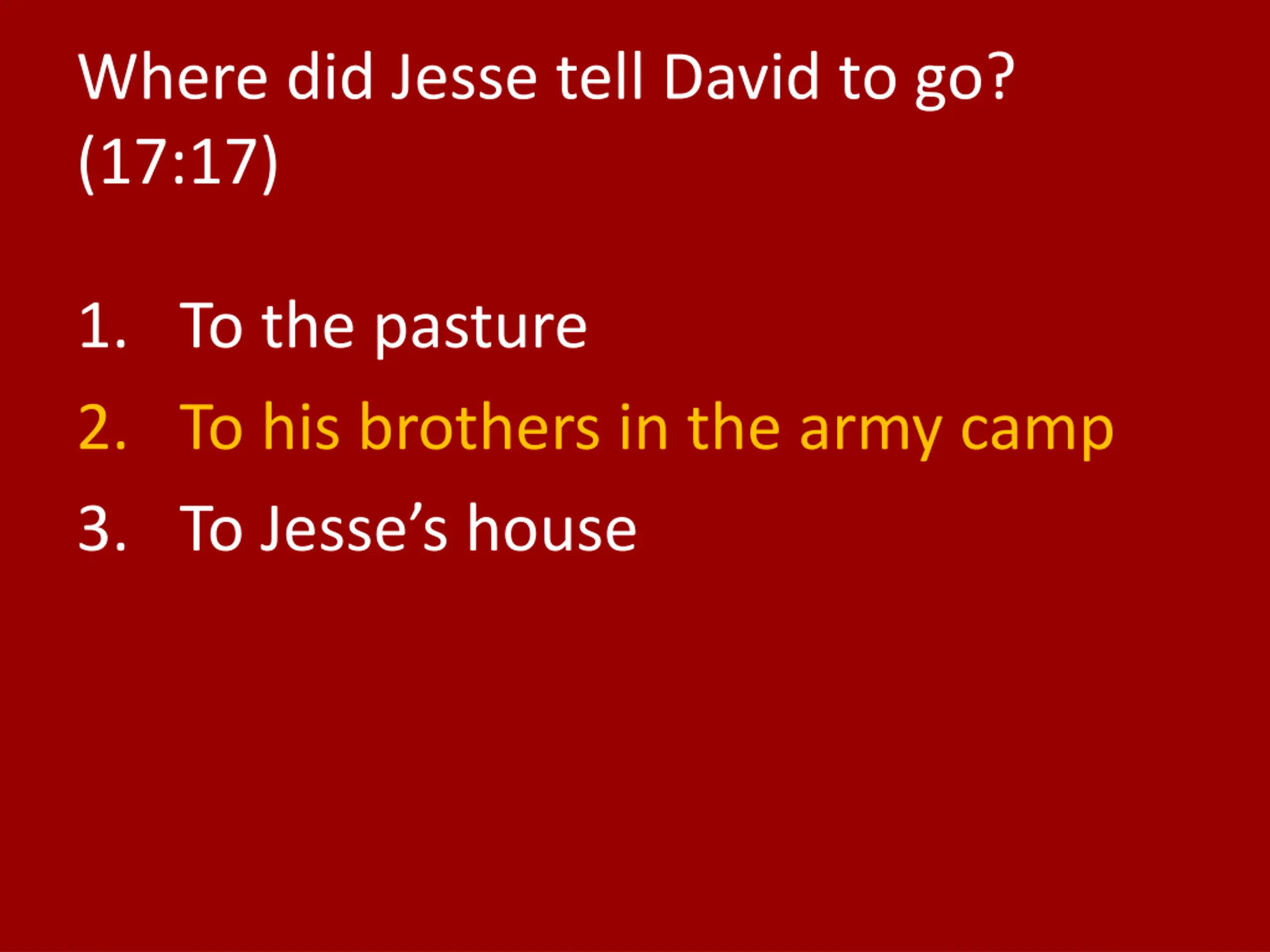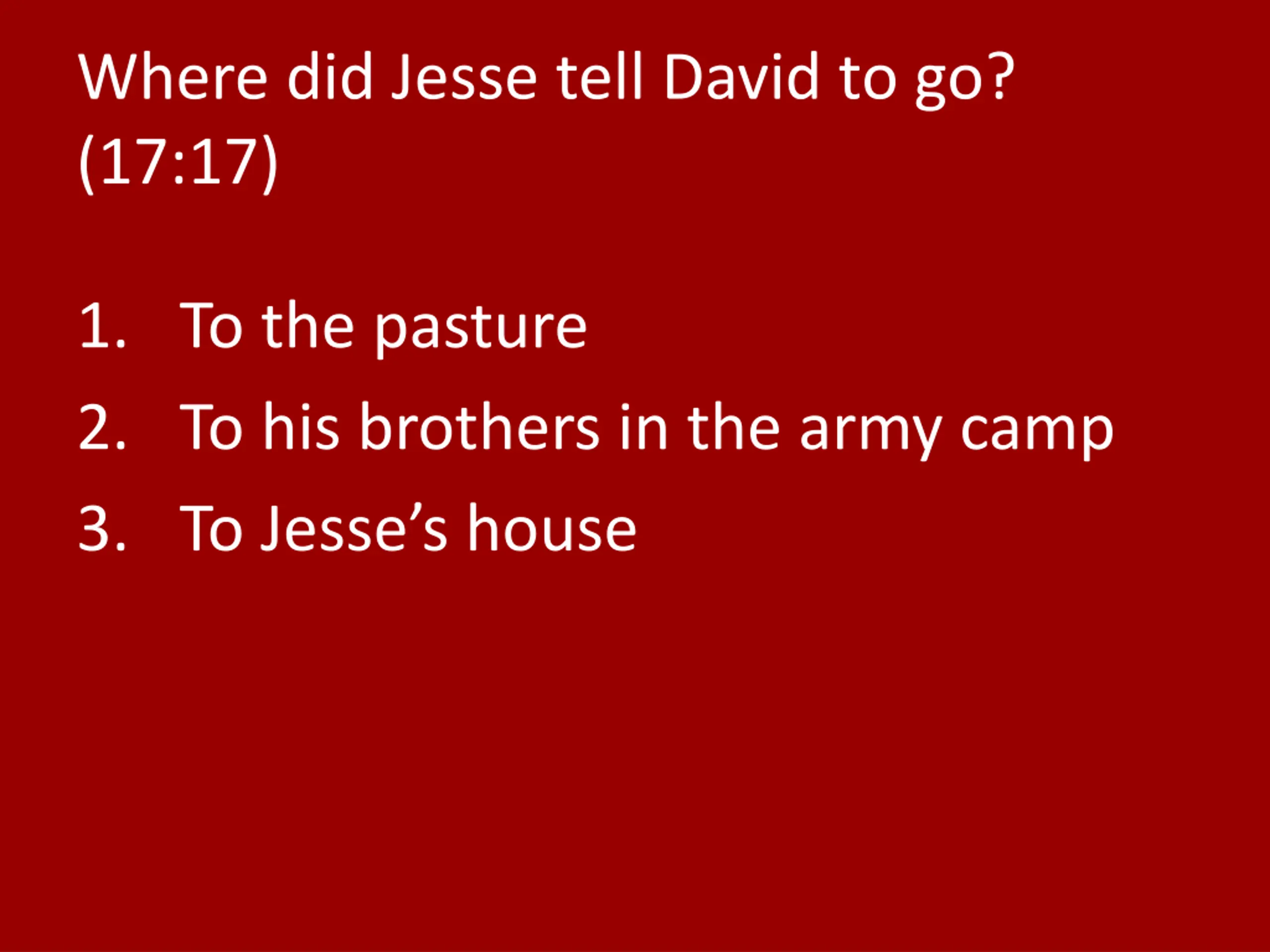 Where did Jesse tell David to go? (17:17) 1. To the pasture 2. To his brothers in the army camp 3. To Jesse s house