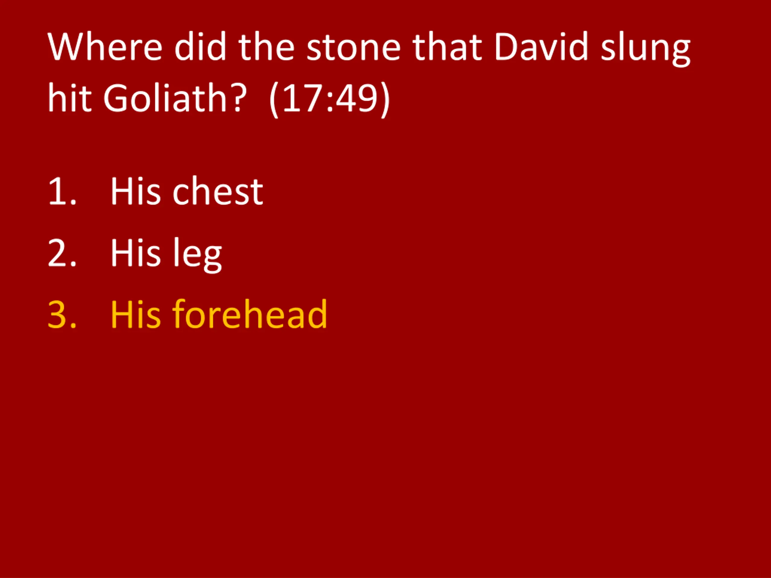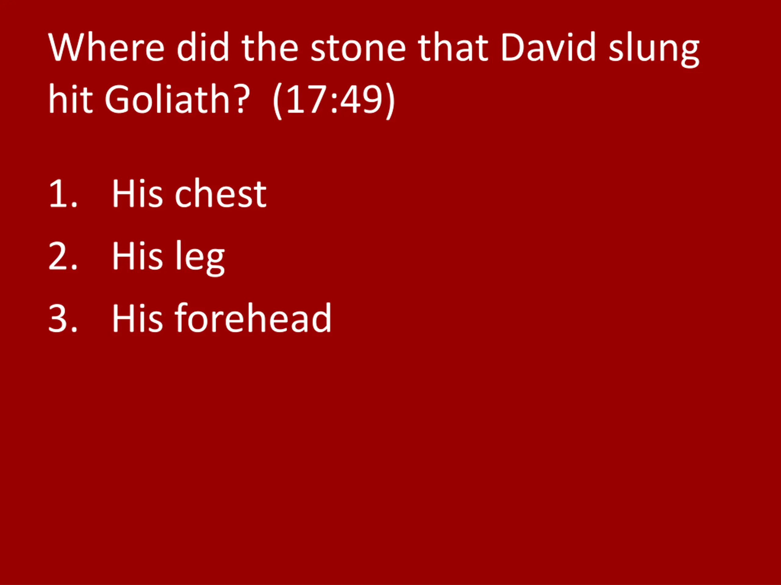 Where did the stone that David slung hit Goliath? (17:49) 1. His chest 2. His leg 3. His forehead