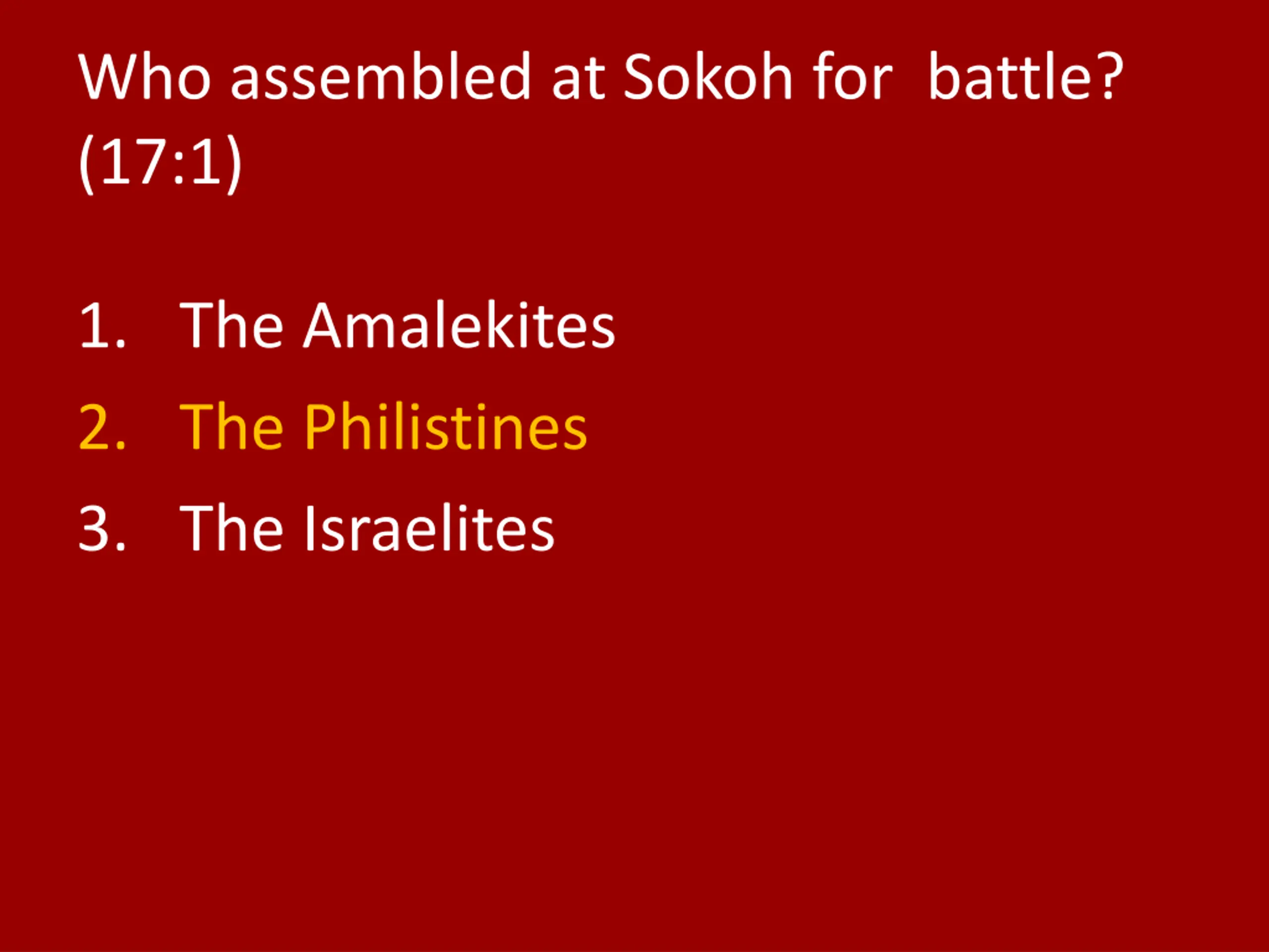 Who assembled at Sokoh for battle? (17:1) 1. The Amalekites 2. The Philistines 3. The Israelites