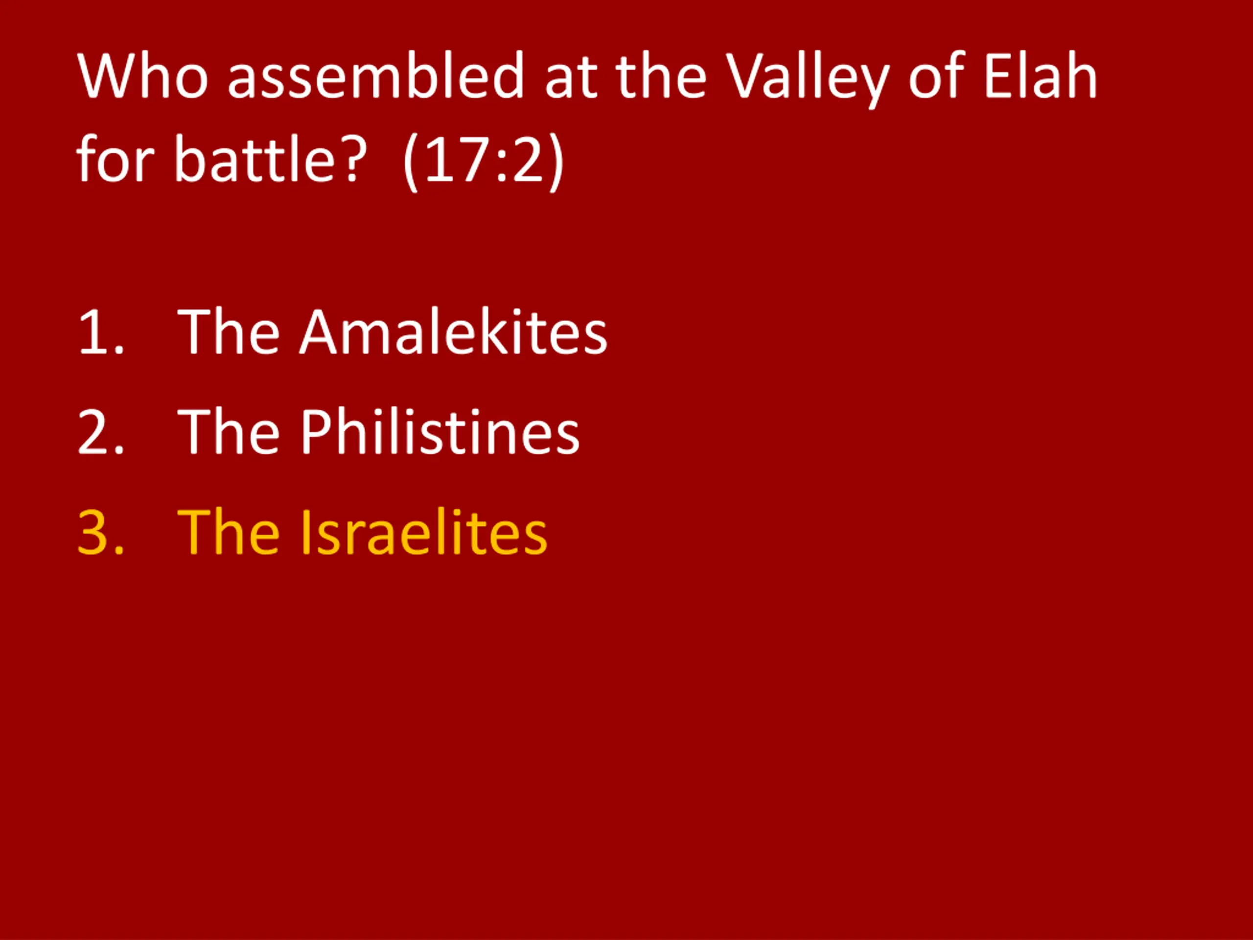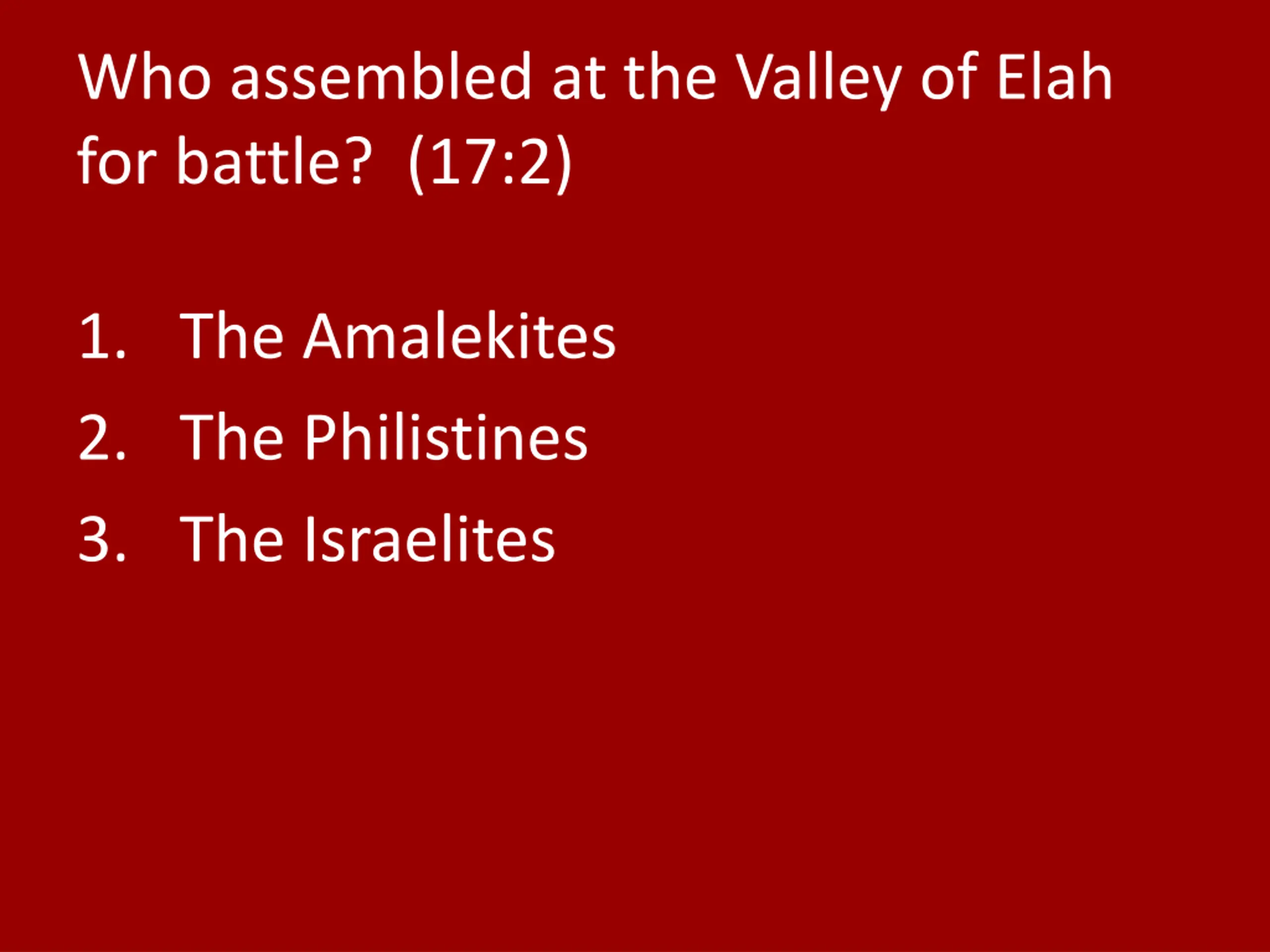 Who assembled at the Valley of Elah for battle? (17:2) 1. The Amalekites 2. The Philistines 3. The Israelites