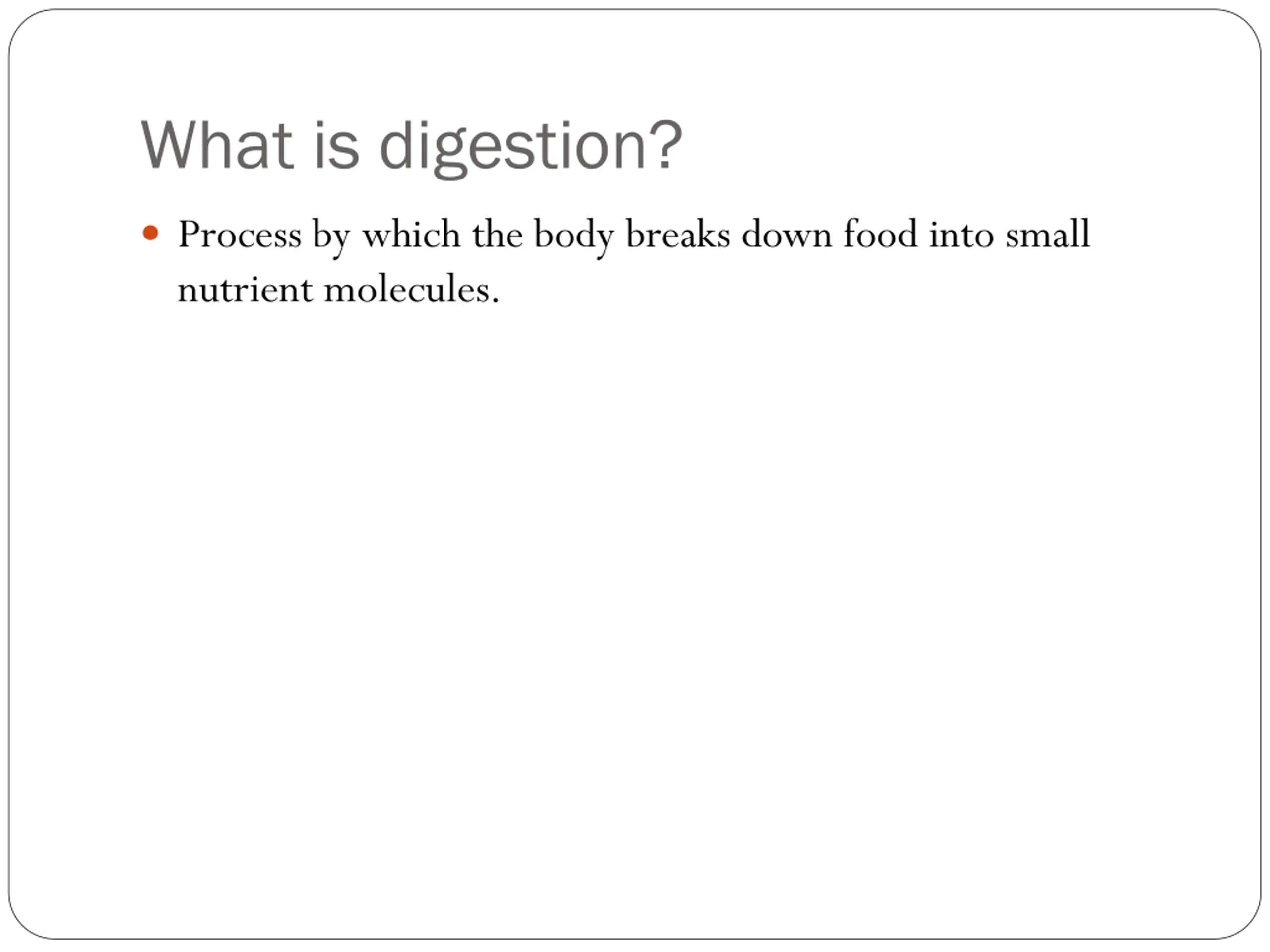 What is digestion? Process by which the body breaks down food into small nutrient molecules.