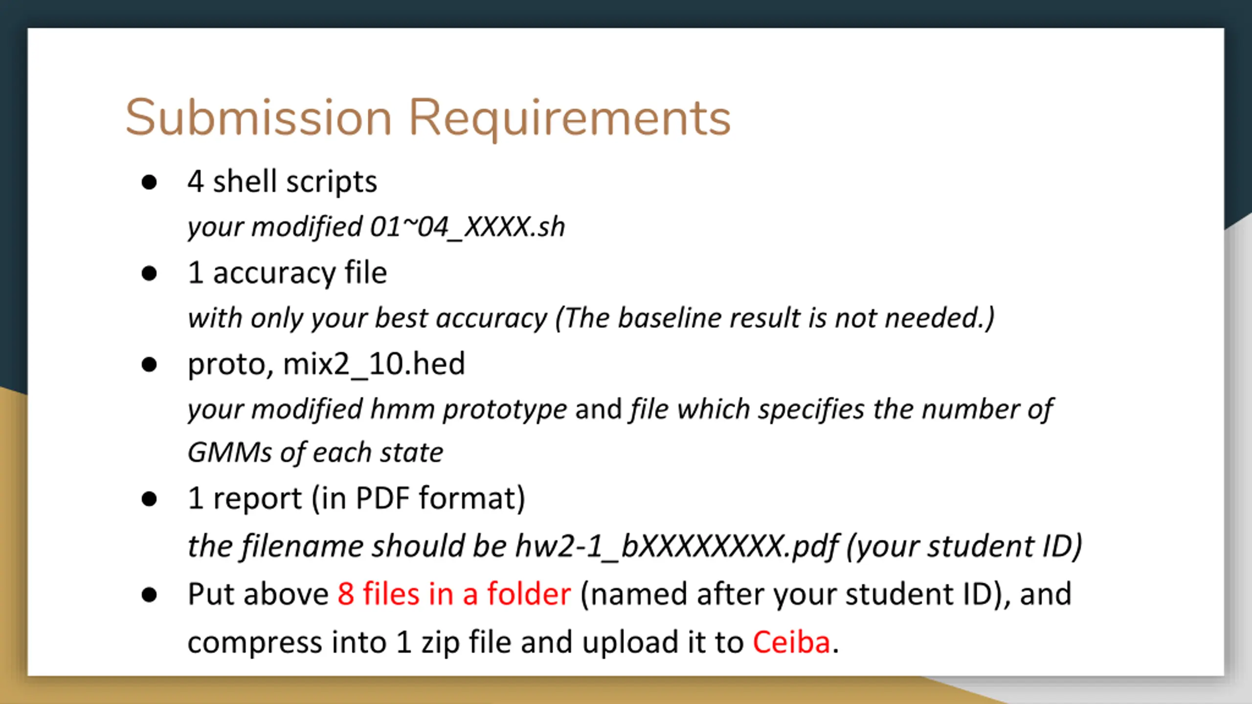 Submission Requirements 4 shell scripts your modified 01~04_XXXX.sh 1 accuracy file with only your best accuracy (The baseline result is not needed.) proto, mix2_10.hed your modified hmm prototype and file which specifies the number of GMMs of each state 1 report (in PDF format) the filename should be hw2-1_bXXXXXXXX.pdf (your student ID) Put above 8 files in a folder (named after your student ID), and compress into 1 zip file and upload it to Ceiba.