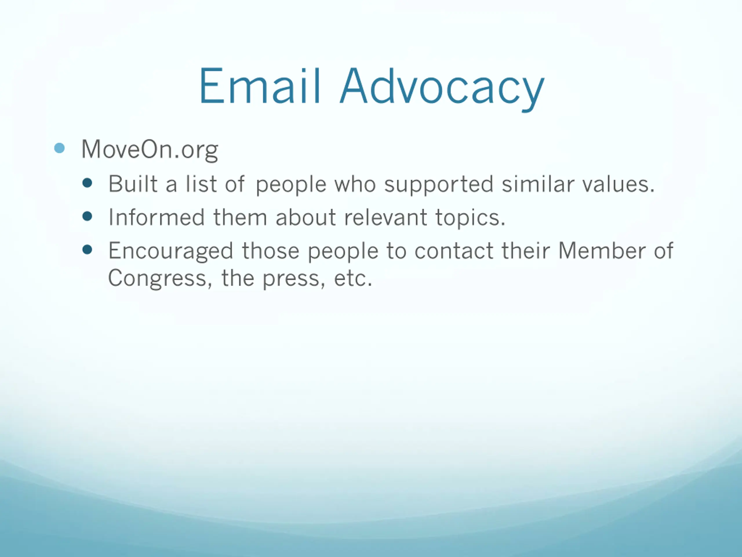 Email Advocacy MoveOn.org Built a list of people who supported similar values. Informed them about relevant topics. Encouraged those people to contact their Member of Congress, the press, etc.