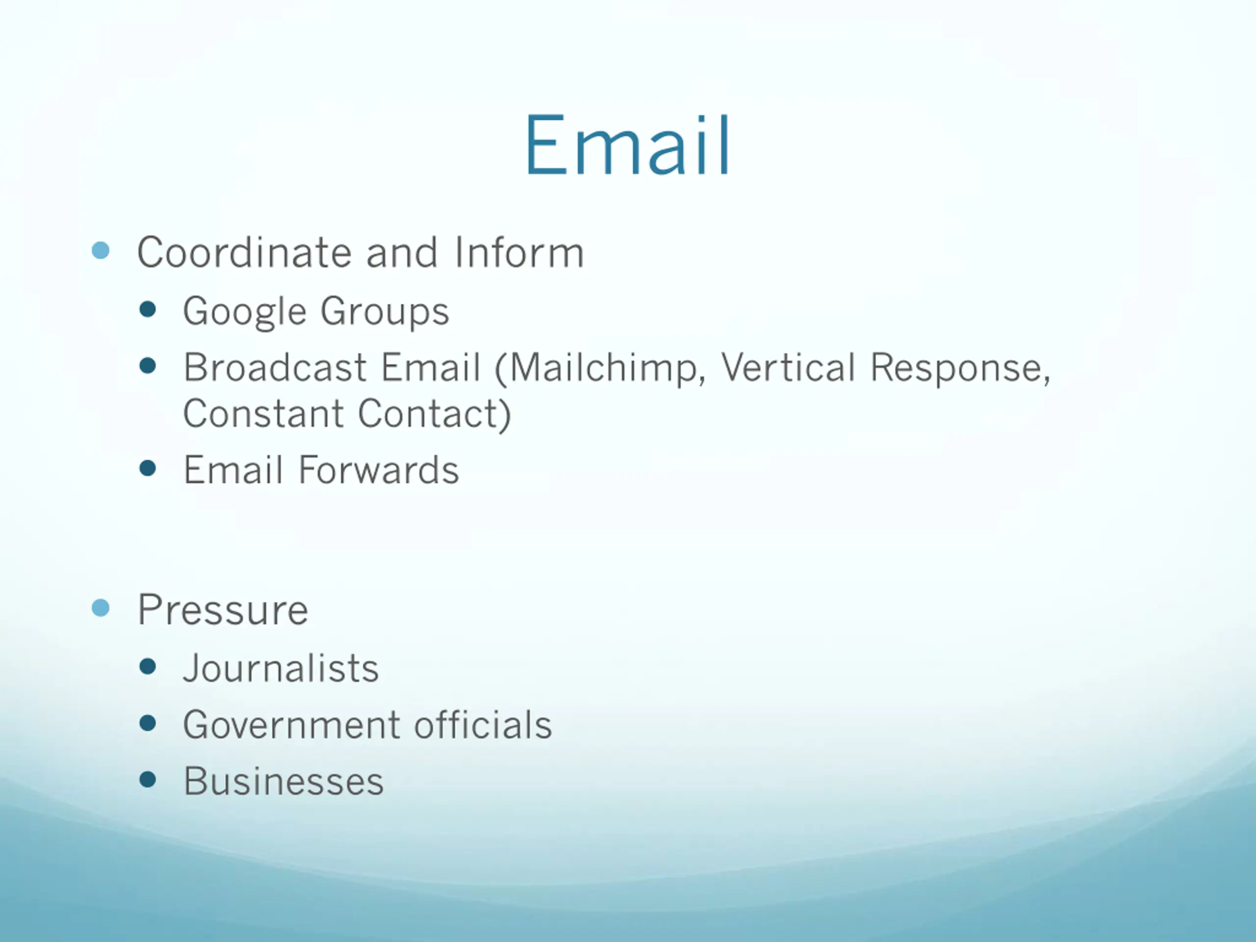 Email Coordinate and Inform Google Groups Broadcast Email (Mailchimp, Vertical Response, Constant Contact) Email Forwards Pressure Journalists Government officials Businesses