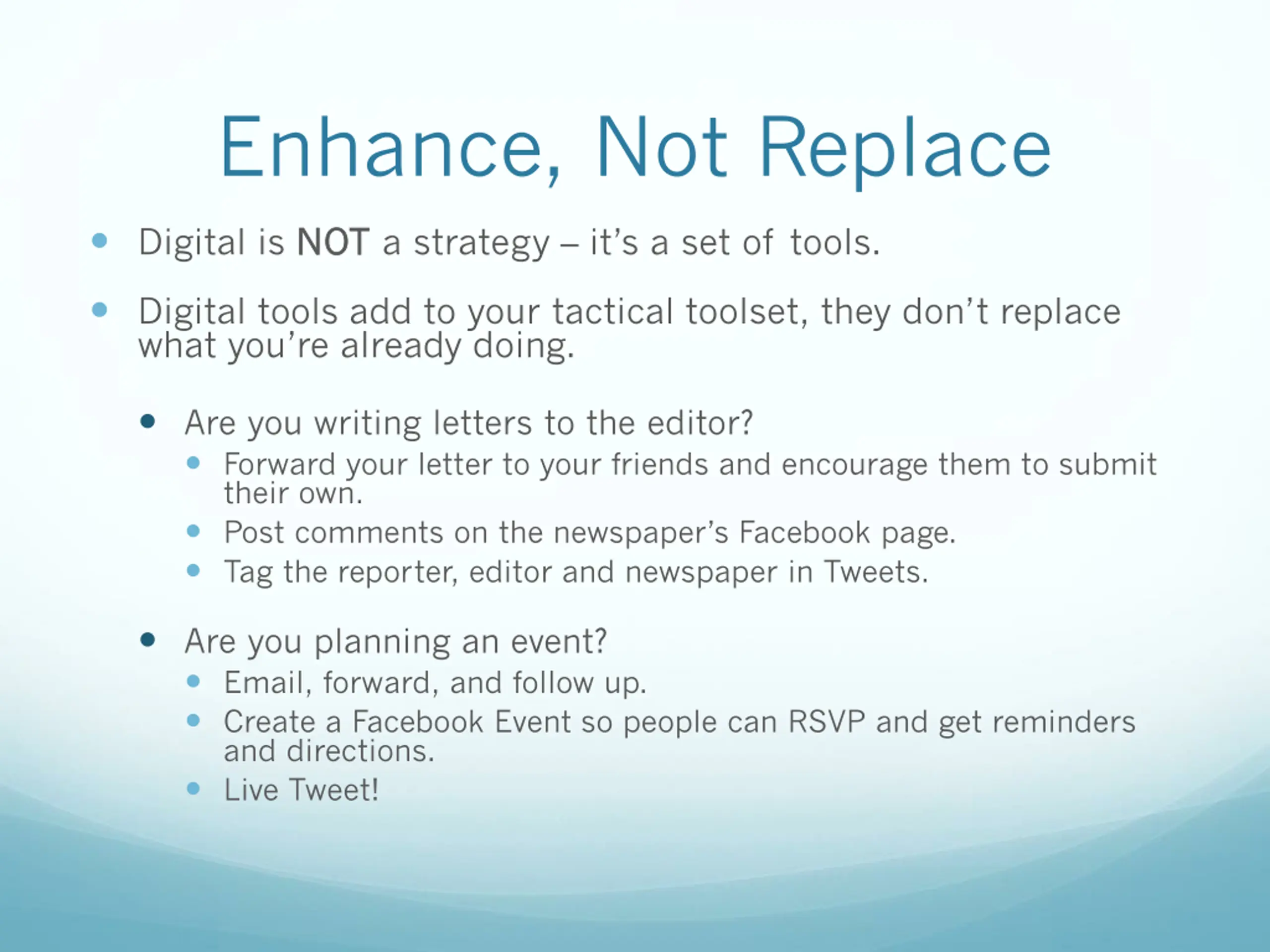 Enhance, Not Replace Digital is NOT NOT a strategy it s a set of tools. Digital tools add to your tactical toolset, they don t replace what you re already doing. Are you writing letters to the editor? Forward your letter to your friends and encourage them to submit their own. Post comments on the newspaper s Facebook page. Tag the reporter, editor and newspaper in Tweets. Are you planning an event? Email, forward, and follow up. Create a Facebook Event so people can RSVP and get reminders and directions. Live Tweet!