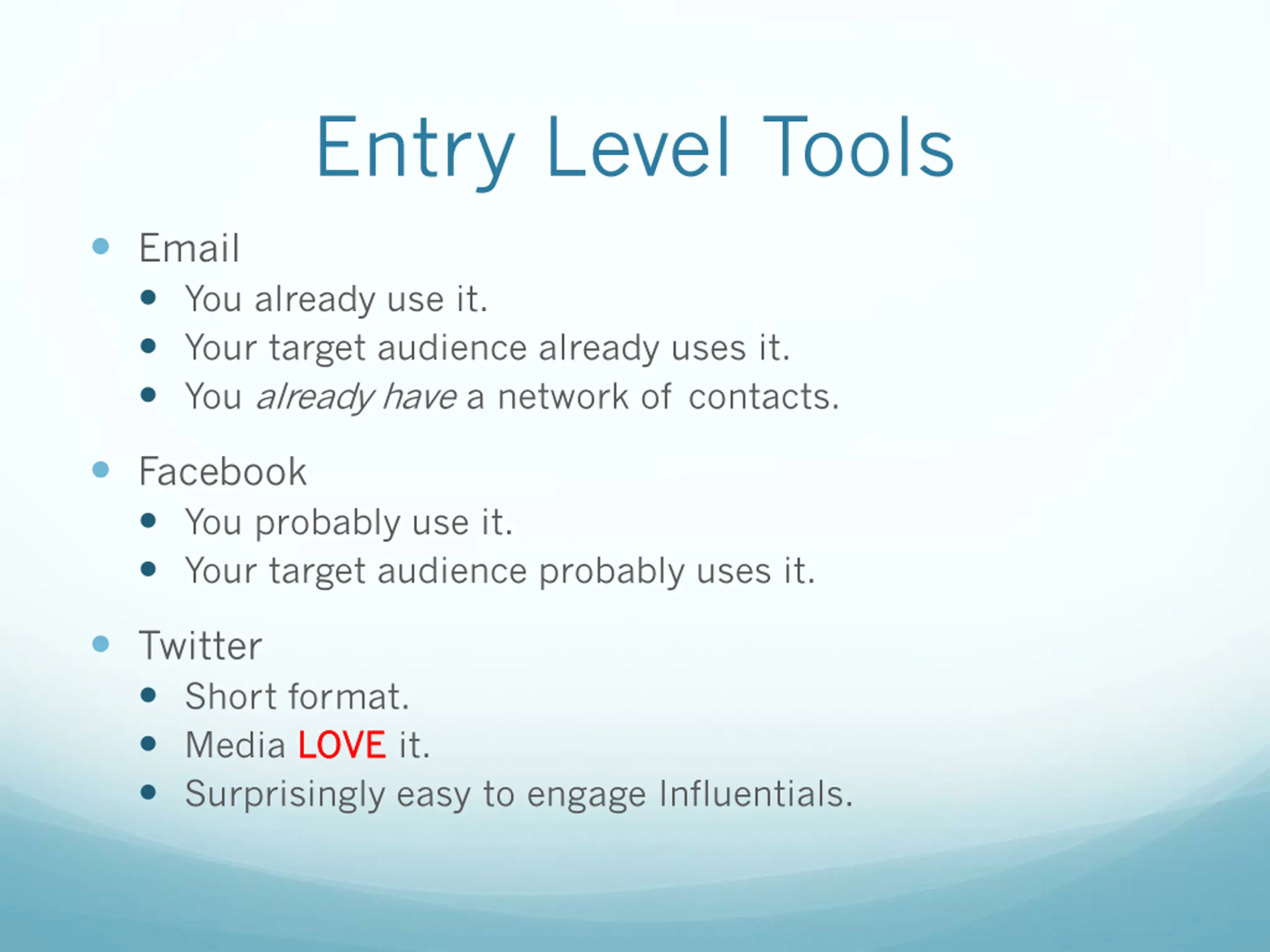 Entry Level Tools Email You already use it. Your target audience already uses it. You already have a network of contacts. Facebook You probably use it. Your target audience probably uses it. Twitter Short format. Media LOVE Surprisingly easy to engage Influentials. LOVE it.