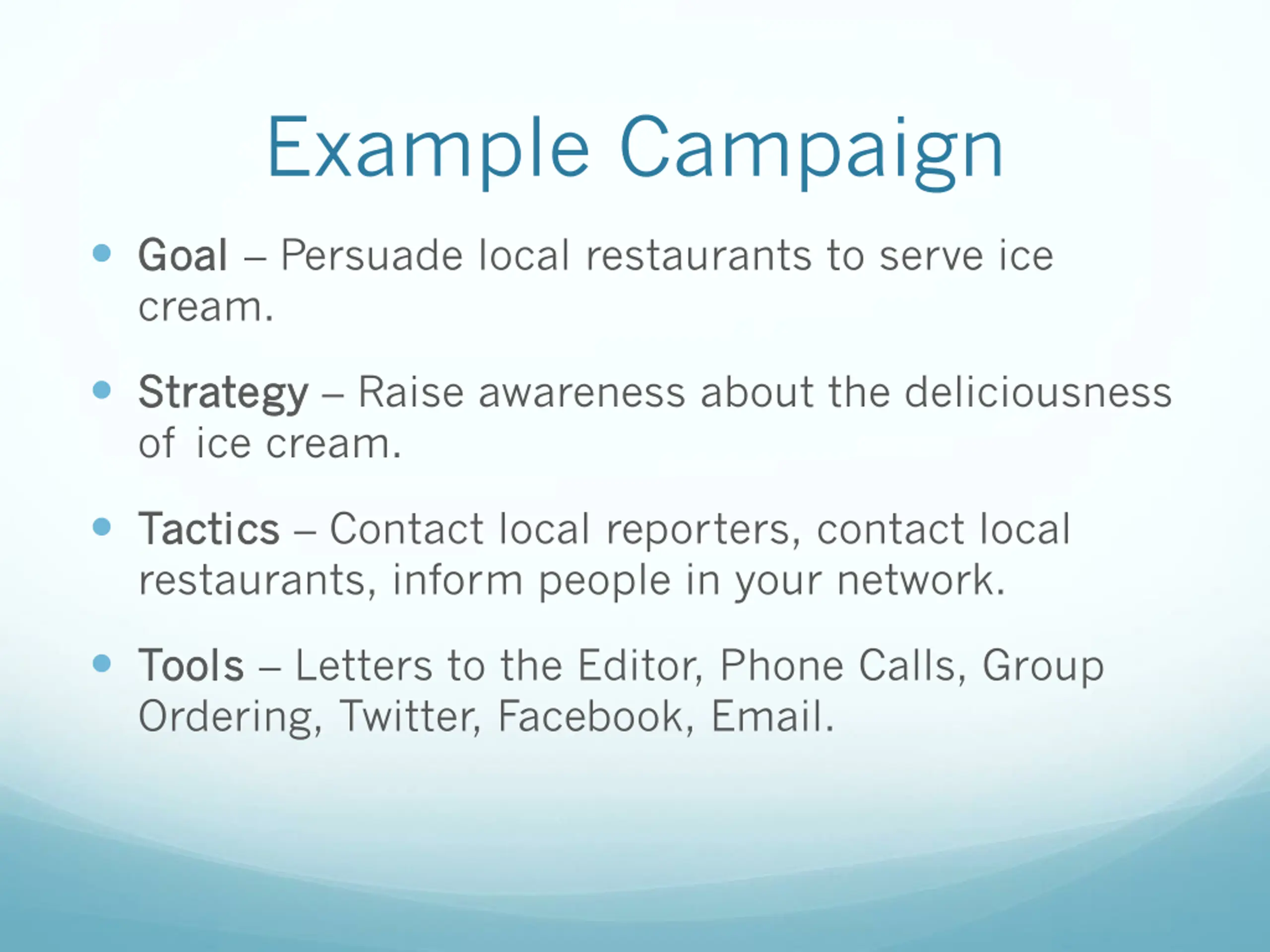 Example Campaign Goal Goal Persuade local restaurants to serve ice cream. Strategy Strategy Raise awareness about the deliciousness of ice cream. Tactics Tactics Contact local reporters, contact local restaurants, inform people in your network. Tools Tools Letters to the Editor, Phone Calls, Group Ordering, Twitter, Facebook, Email.