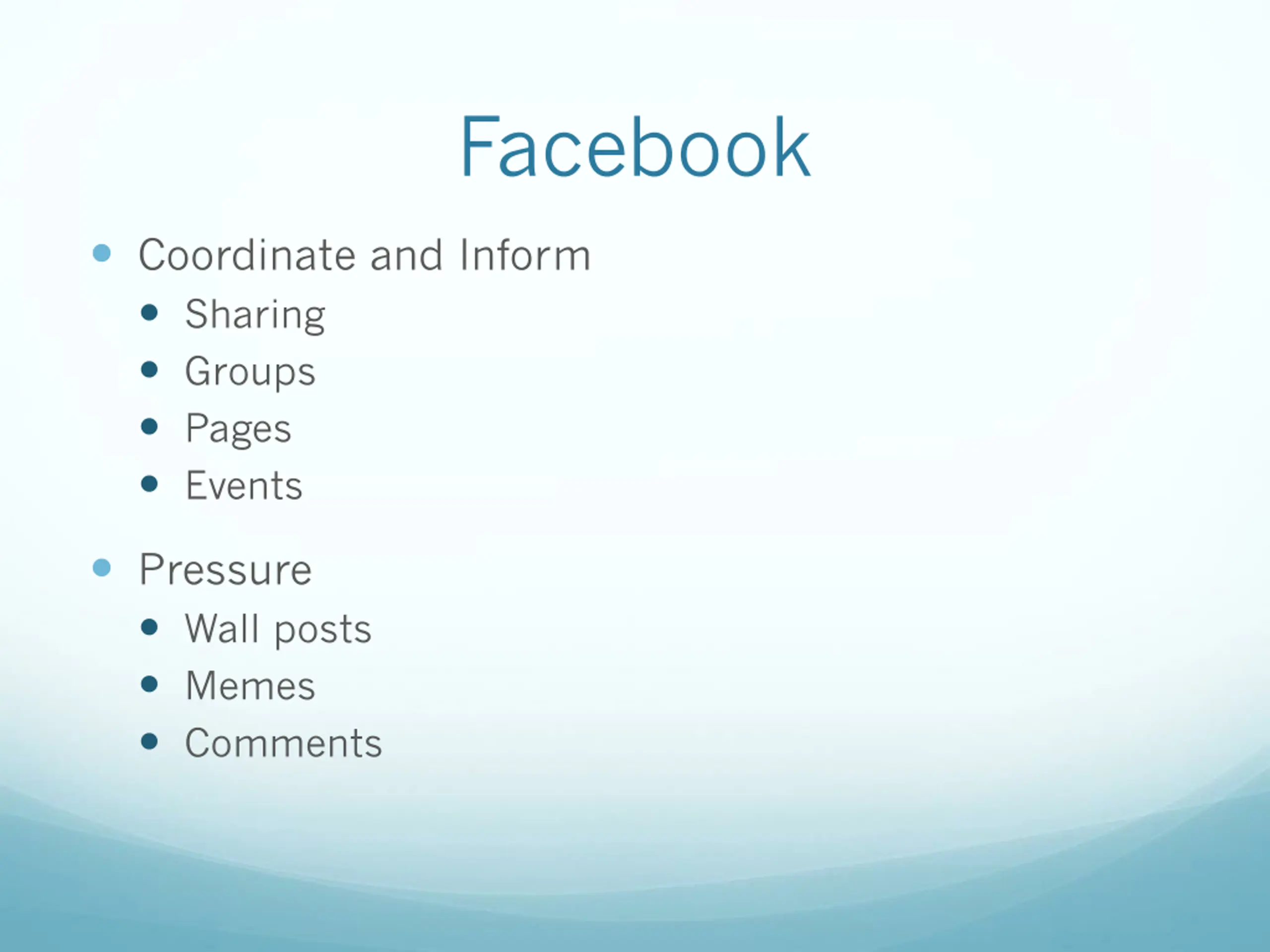Facebook Coordinate and Inform Sharing Groups Pages Events Pressure Wall posts Memes Comments