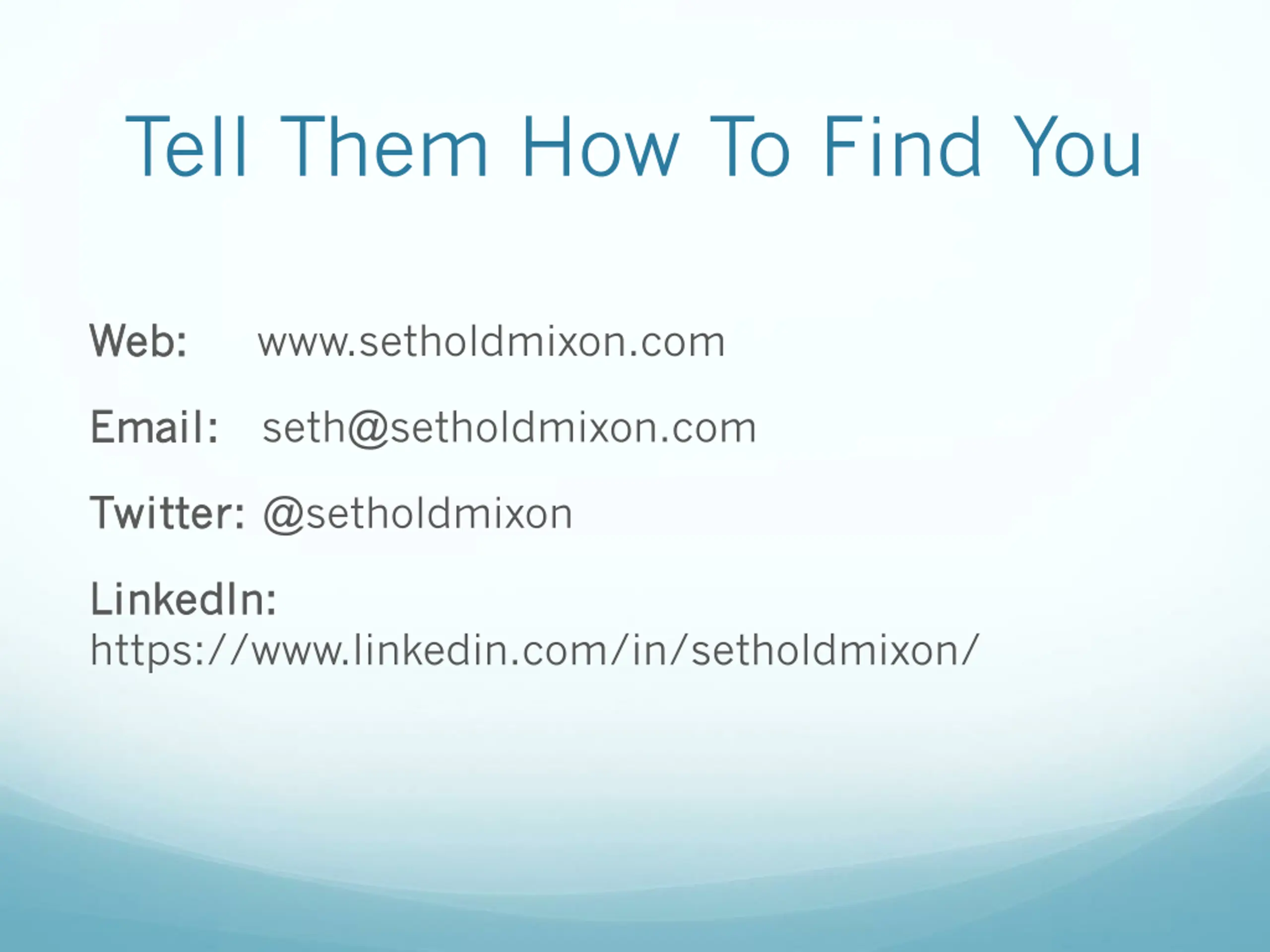 Tell Them How To Find You Web: Web: www.setholdmixon.com Email: Email: seth@setholdmixon.com Twitter: Twitter: @setholdmixon LinkedIn: LinkedIn: https://www.linkedin.com/in/setholdmixon/
