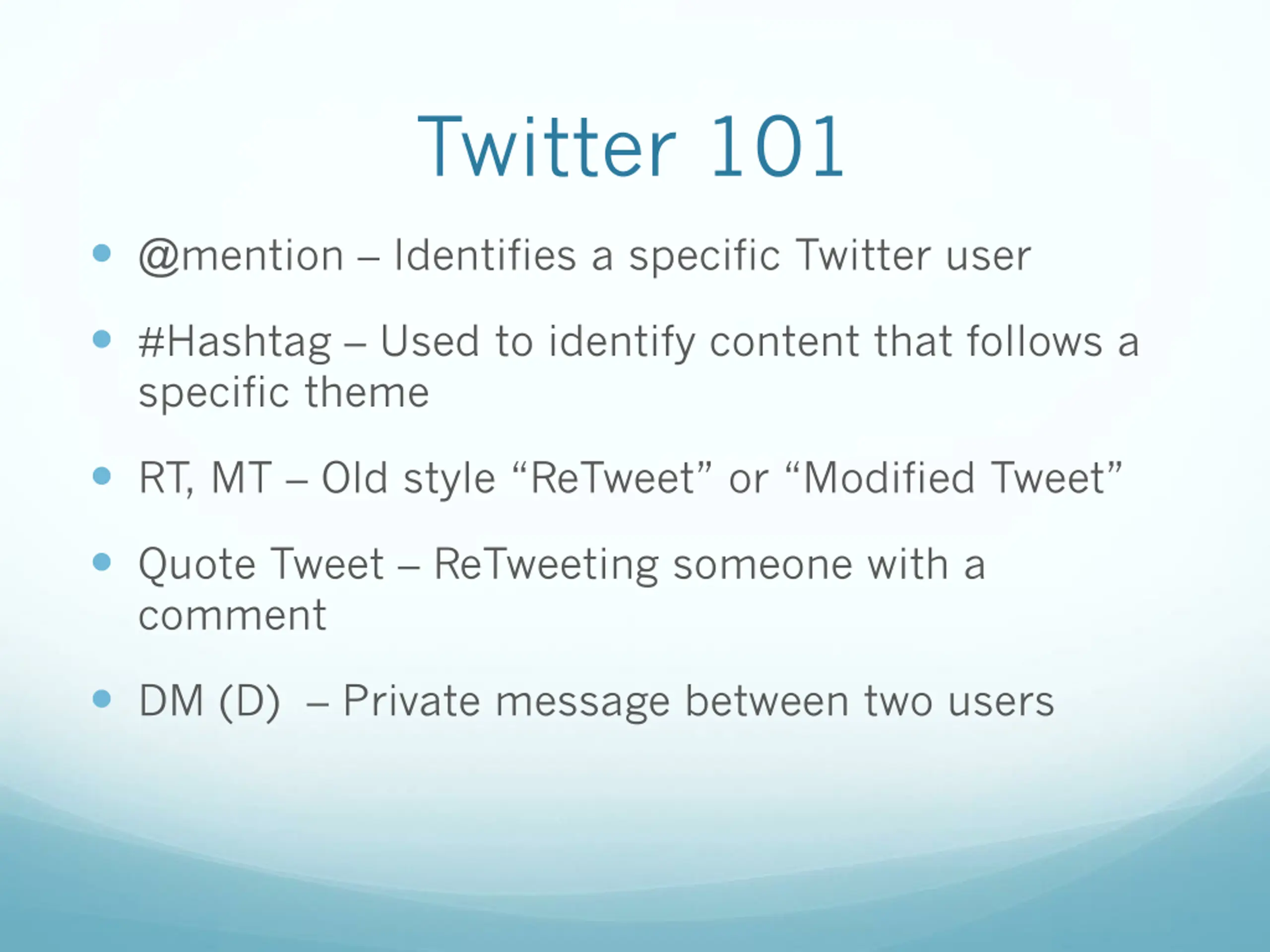 Twitter 101 @mention Identifies a specific Twitter user #Hashtag Used to identify content that follows a specific theme RT, MT Old style ReTweet or Modified Tweet Quote Tweet ReTweeting someone with a comment DM (D) Private message between two users