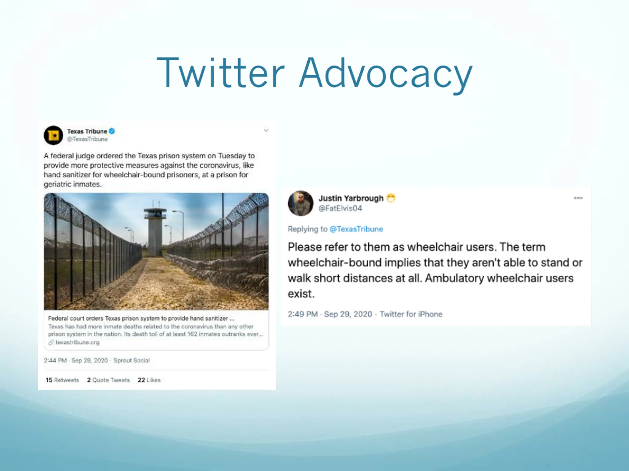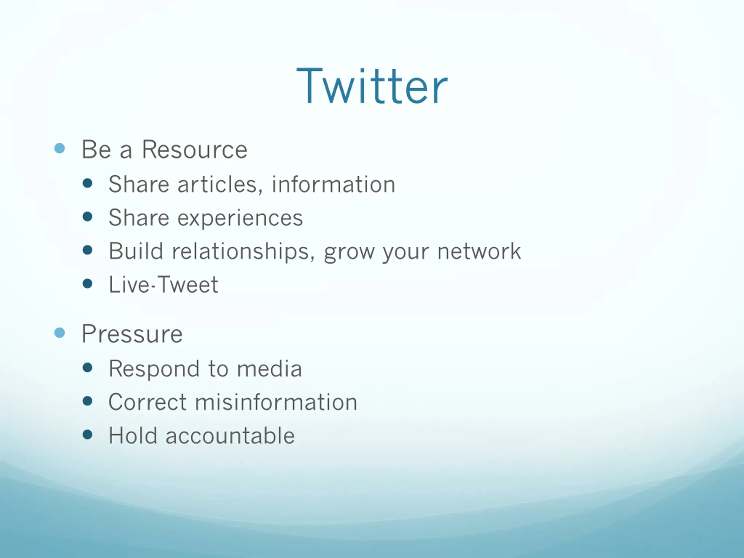 Twitter Be a Resource Share articles, information Share experiences Build relationships, grow your network Live-Tweet Pressure Respond to media Correct misinformation Hold accountable