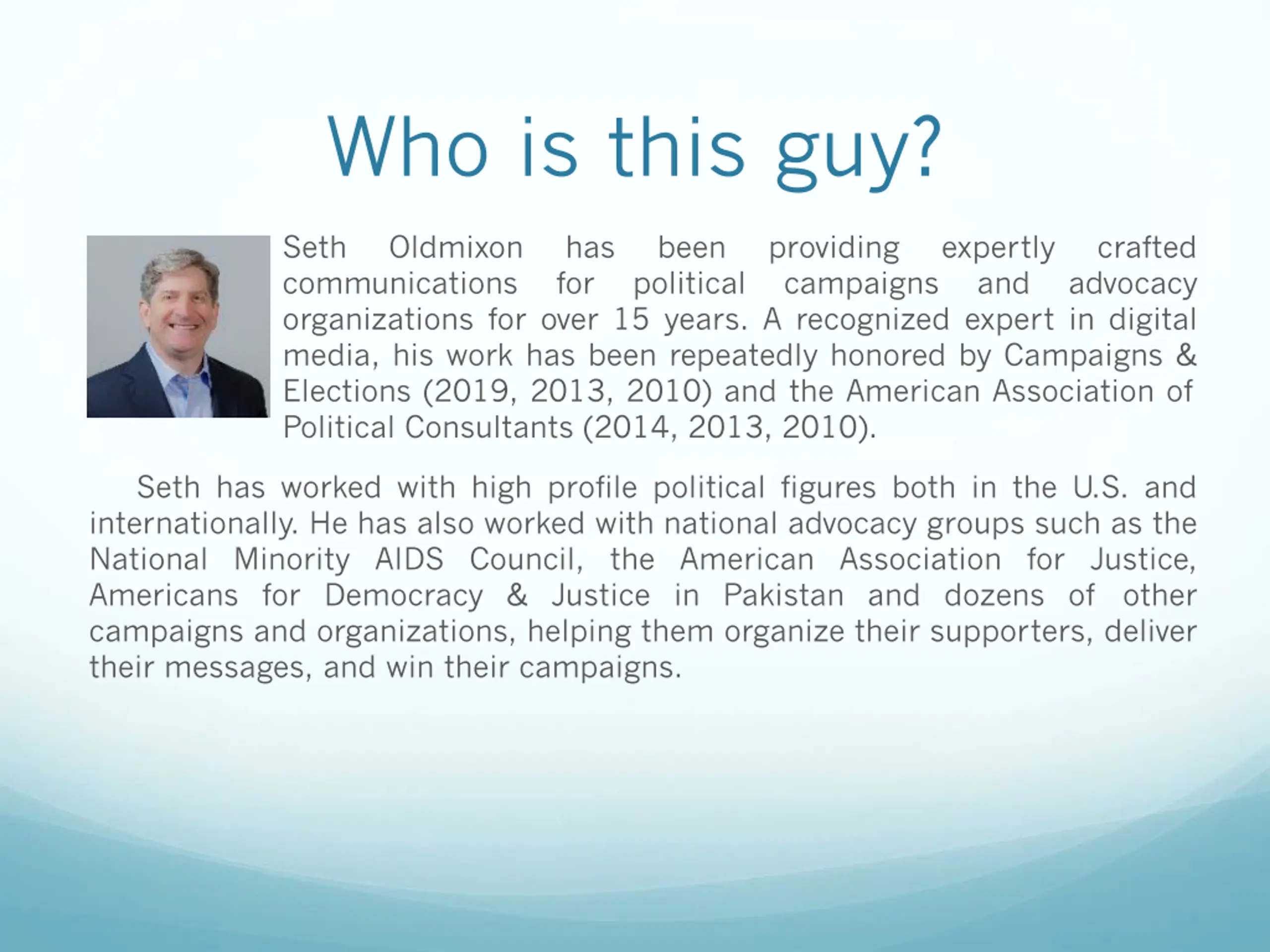 Who is this guy? Seth communications organizations for over 15 years. A recognized expert in digital media, his work has been repeatedly honored by Campaigns & Elections (2019, 2013, 2010) and the American Association of Political Consultants (2014, 2013, 2010). Oldmixon has for been political providing campaigns expertly and crafted advocacy Seth has worked with high profile political figures both in the U.S. and internationally. He has also worked with national advocacy groups such as the National Minority AIDS Council, the American Association for Justice, Americans for Democracy & Justice in Pakistan and dozens of other campaigns and organizations, helping them organize their supporters, deliver their messages, and win their campaigns.