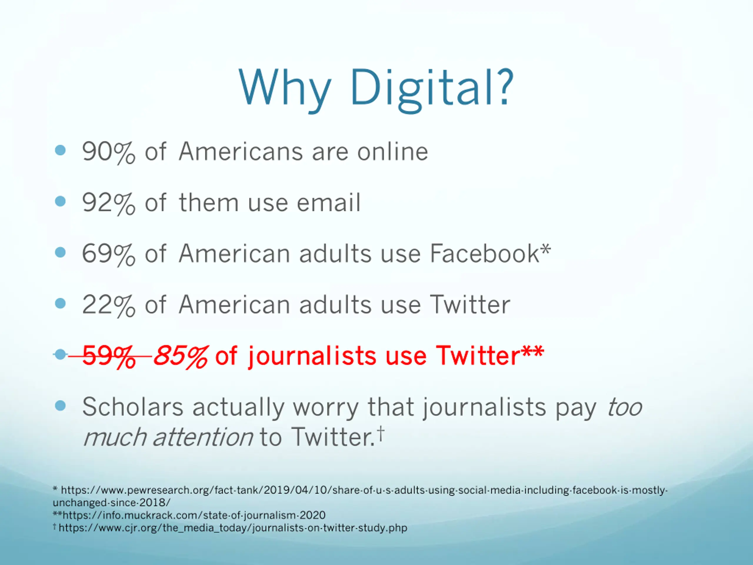 Why Digital? 90% of Americans are online 92% of them use email 69% of American adults use Facebook* 22% of American adults use Twitter 59% 59% 85% 85% of journalists use Twitter** of journalists use Twitter** Scholars actually worry that journalists pay too much attention to Twitter. * https://www.pewresearch.org/fact-tank/2019/04/10/share-of-u-s-adults-using-social-media-including-facebook-is-mostly- unchanged-since-2018/ **https://info.muckrack.com/state-of-journalism-2020 https://www.cjr.org/the_media_today/journalists-on-twitter-study.php