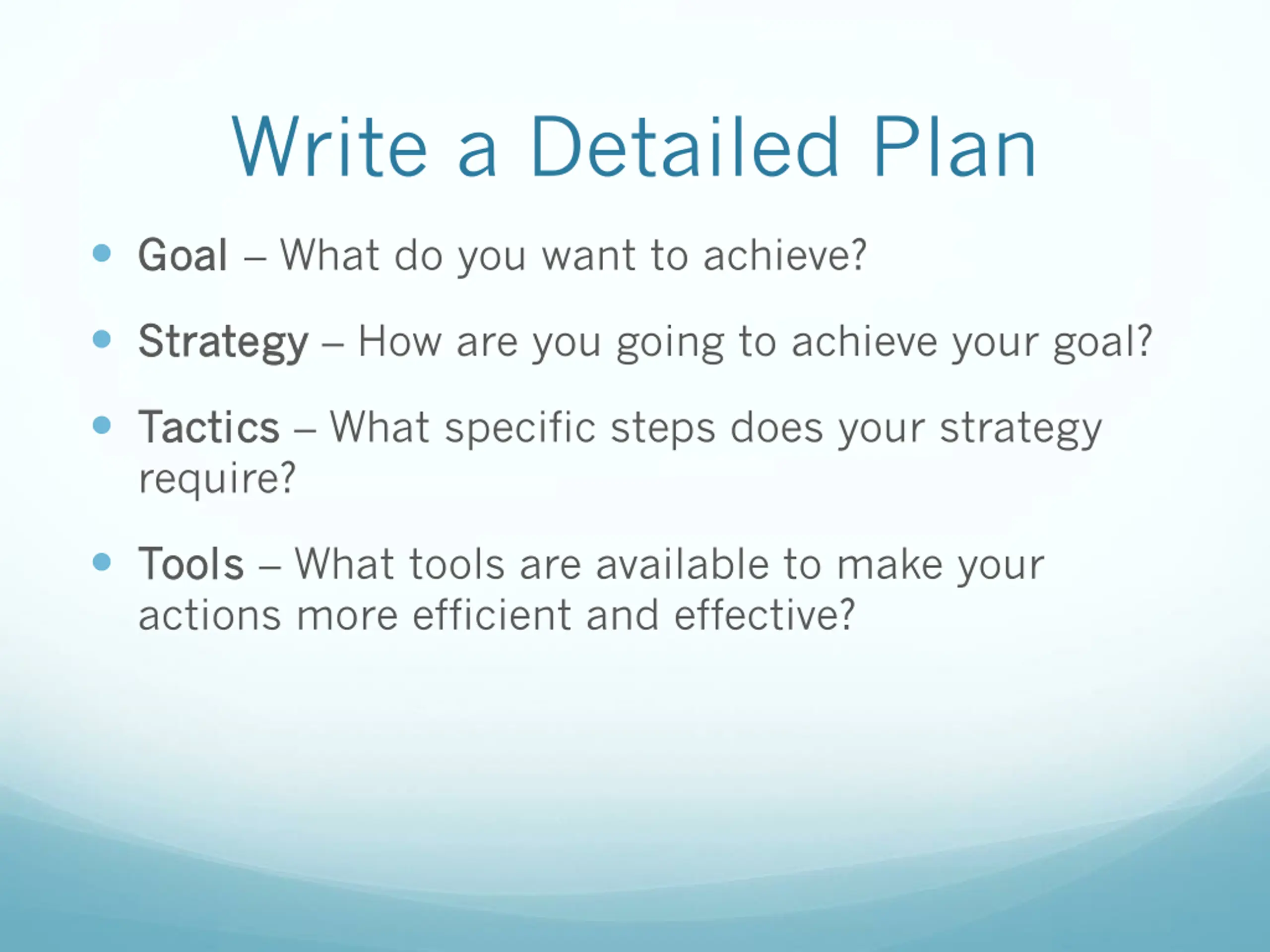 Write a Detailed Plan Goal Goal What do you want to achieve? Strategy Strategy How are you going to achieve your goal? Tactics Tactics What specific steps does your strategy require? Tools Tools What tools are available to make your actions more efficient and effective?