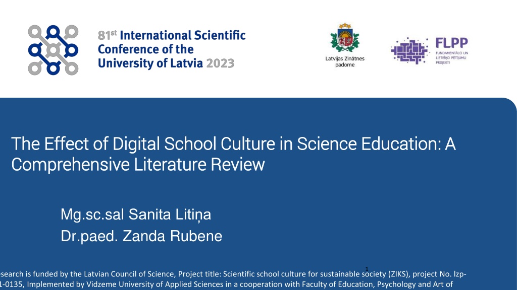 The The Effect Effect of of Digital Comprehensive Comprehensive Literature Digital School Culture School Culture i in n Science Literature Review Review Science Education Education: A : A Mg.sc.sal Sanita Liti a Dr.paed. Zanda Rubene 1 This research is funded by the Latvian Council of Science, Project title: Scientific school culture for sustainable society (ZIKS), project No. lzp- 2021/1-0135, Implemented by Vidzeme University of Applied Sciences in a cooperation with Faculty of Education, Psychology and Art of University of Latvia.