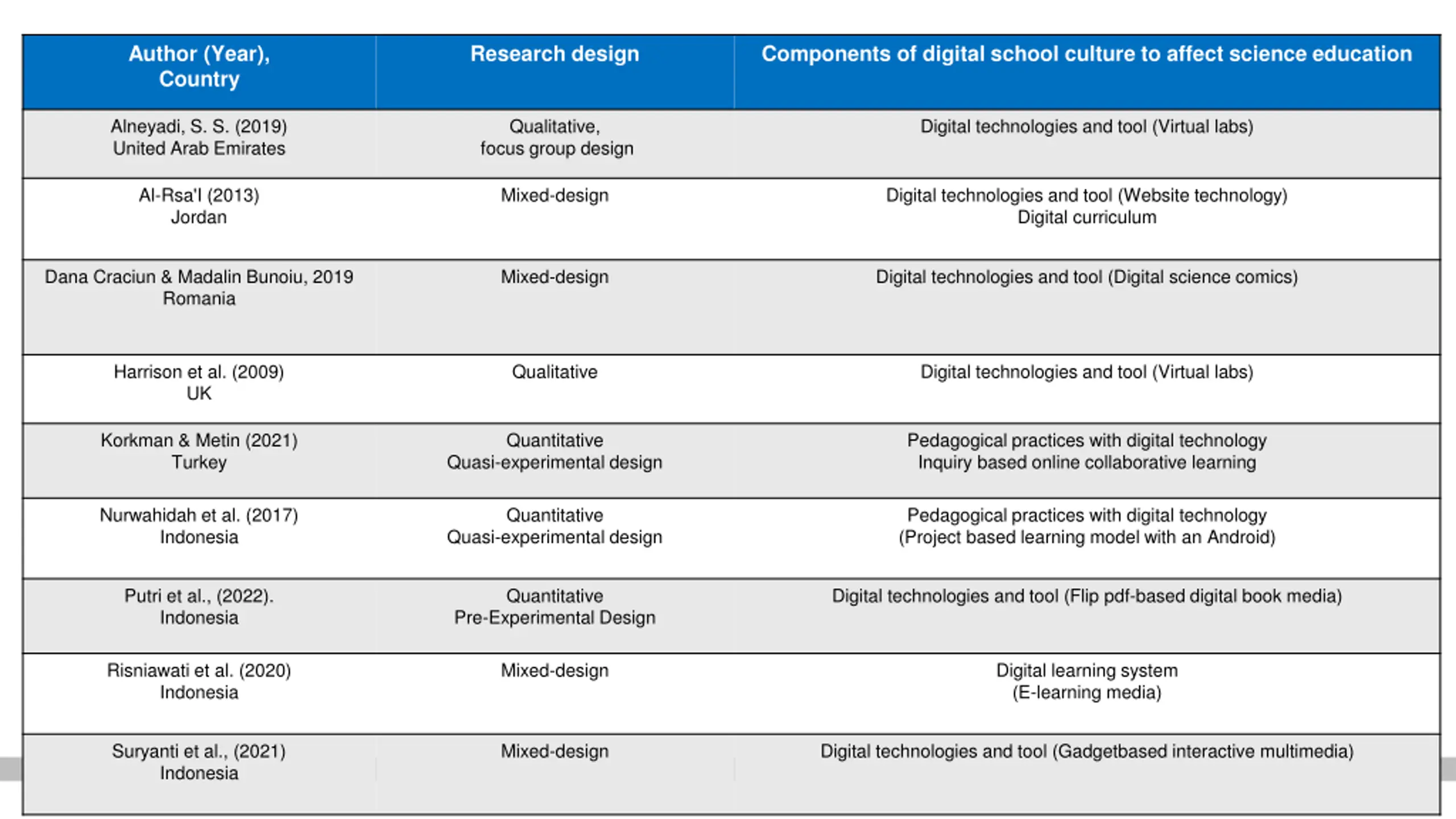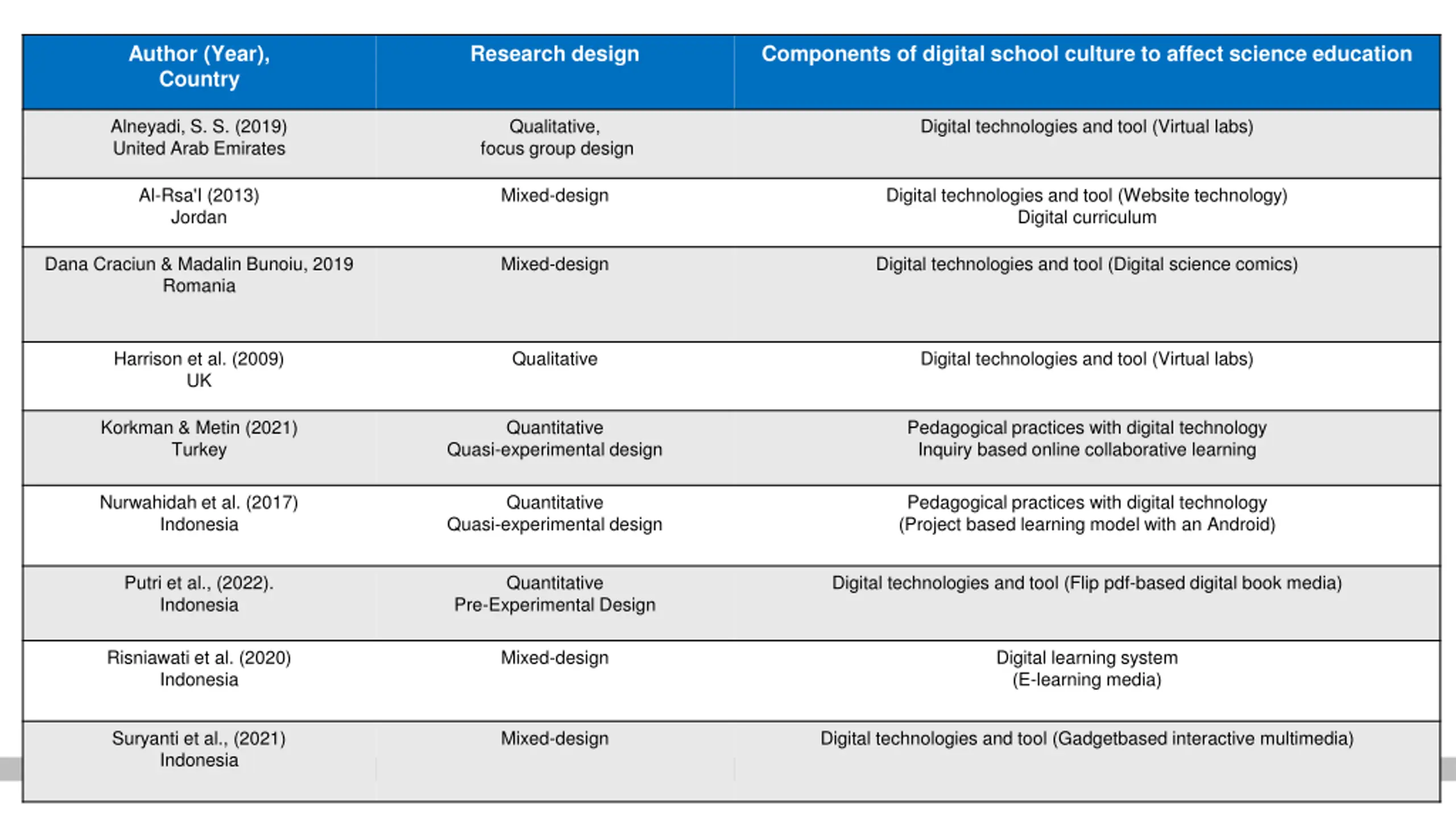 Author (Year), Country Research design Components of digital school culture to affect science education Alneyadi, S. S. (2019) United Arab Emirates Qualitative, focus group design Digital technologies and tool (Virtual labs) Al-Rsa'I (2013) Jordan Mixed-design Digital technologies and tool (Website technology) Digital curriculum Dana Craciun & Madalin Bunoiu, 2019 Romania Mixed-design Digital technologies and tool (Digital science comics) Harrison et al. (2009) UK Qualitative Digital technologies and tool (Virtual labs) Korkman & Metin (2021) Turkey Quantitative Pedagogical practices with digital technology Inquiry based online collaborative learning Quasi-experimental design Nurwahidah et al. (2017) Indonesia Quantitative Pedagogical practices with digital technology (Project based learning model with an Android) Quasi-experimental design Putri et al., (2022). Indonesia Quantitative Digital technologies and tool (Flip pdf-based digital book media) Pre-Experimental Design Risniawati et al. (2020) Indonesia Mixed-design Digital learning system (E-learning media) Suryanti et al., (2021) Indonesia Mixed-design Digital technologies and tool (Gadgetbased interactive multimedia) 10
