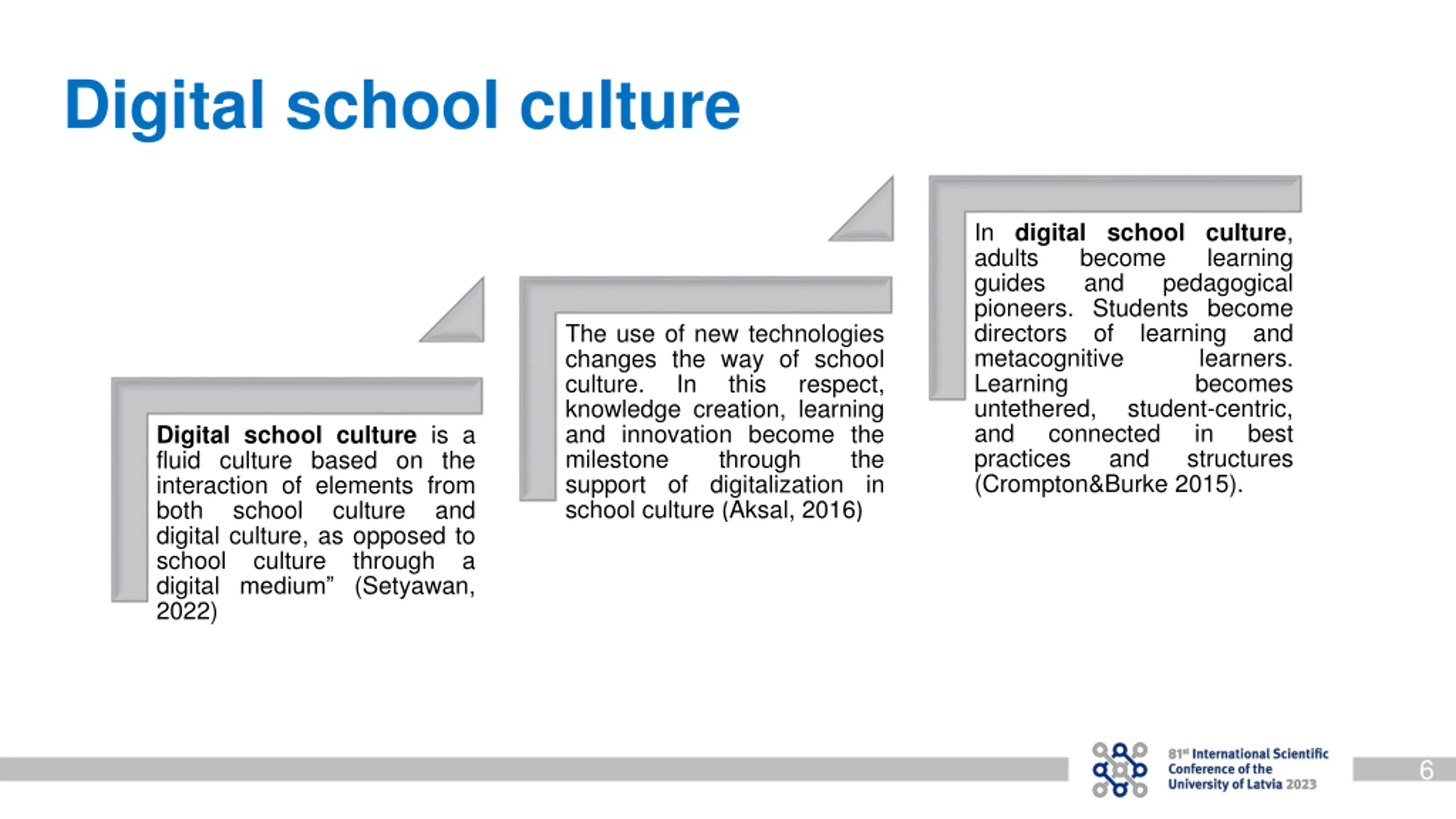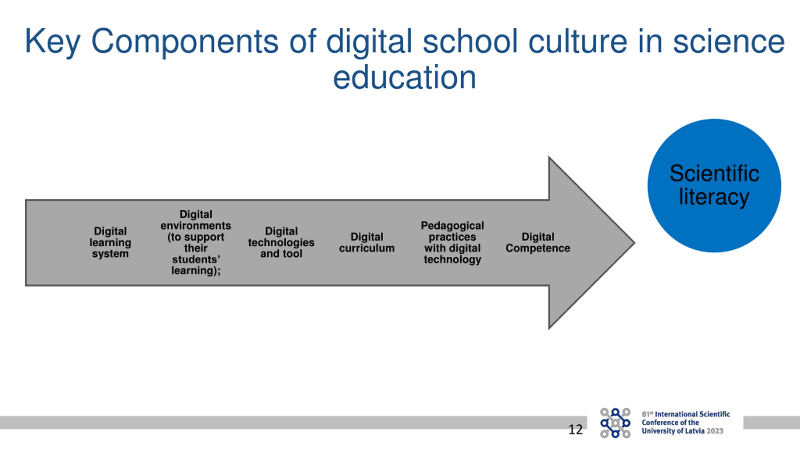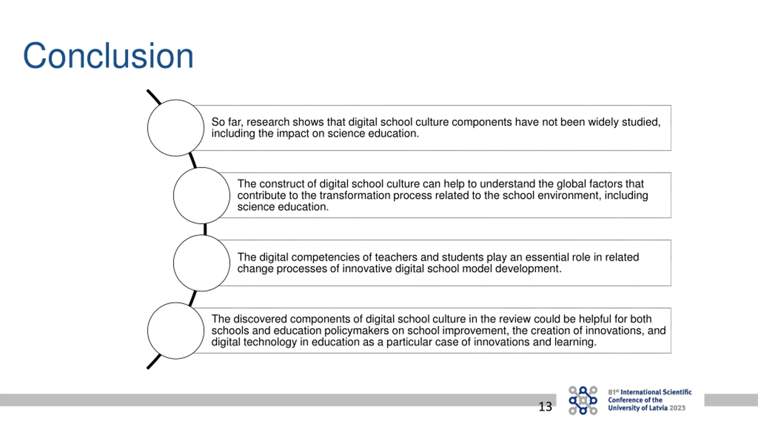 Conclusion So far, research shows that digital school culture components have not been widely studied, including the impact on science education. The construct of digital school culture can help to understand the global factors that contribute to the transformation process related to the school environment, including science education. The digital competencies of teachers and students play an essential role in related change processes of innovative digital school model development. The discovered components of digital school culture in the review could be helpful for both schools and education policymakers on school improvement, the creation of innovations, and digital technology in education as a particular case of innovations and learning. 13