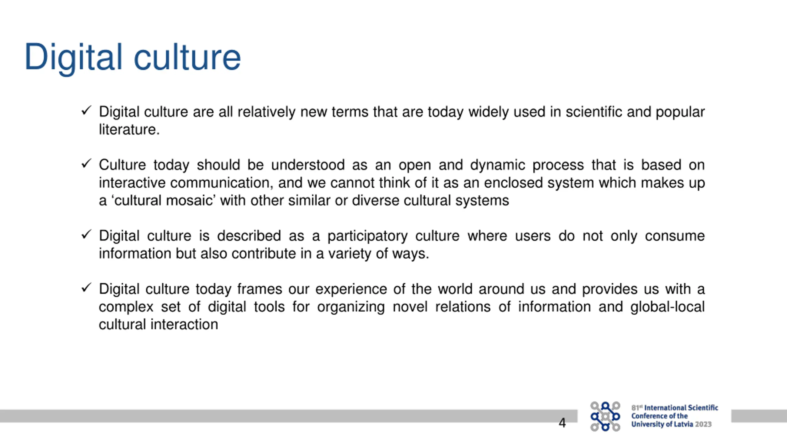 Digital culture Digital culture are all relatively new terms that are today widely used in scientific and popular literature. Culture today should be understood as an open and dynamic process that is based on interactive communication, and we cannot think of it as an enclosed system which makes up a cultural mosaic with other similar or diverse cultural systems Digital culture is described as a participatory culture where users do not only consume information but also contribute in a variety of ways. Digital culture today frames our experience of the world around us and provides us with a complex set of digital tools for organizing novel relations of information and global-local cultural interaction 4