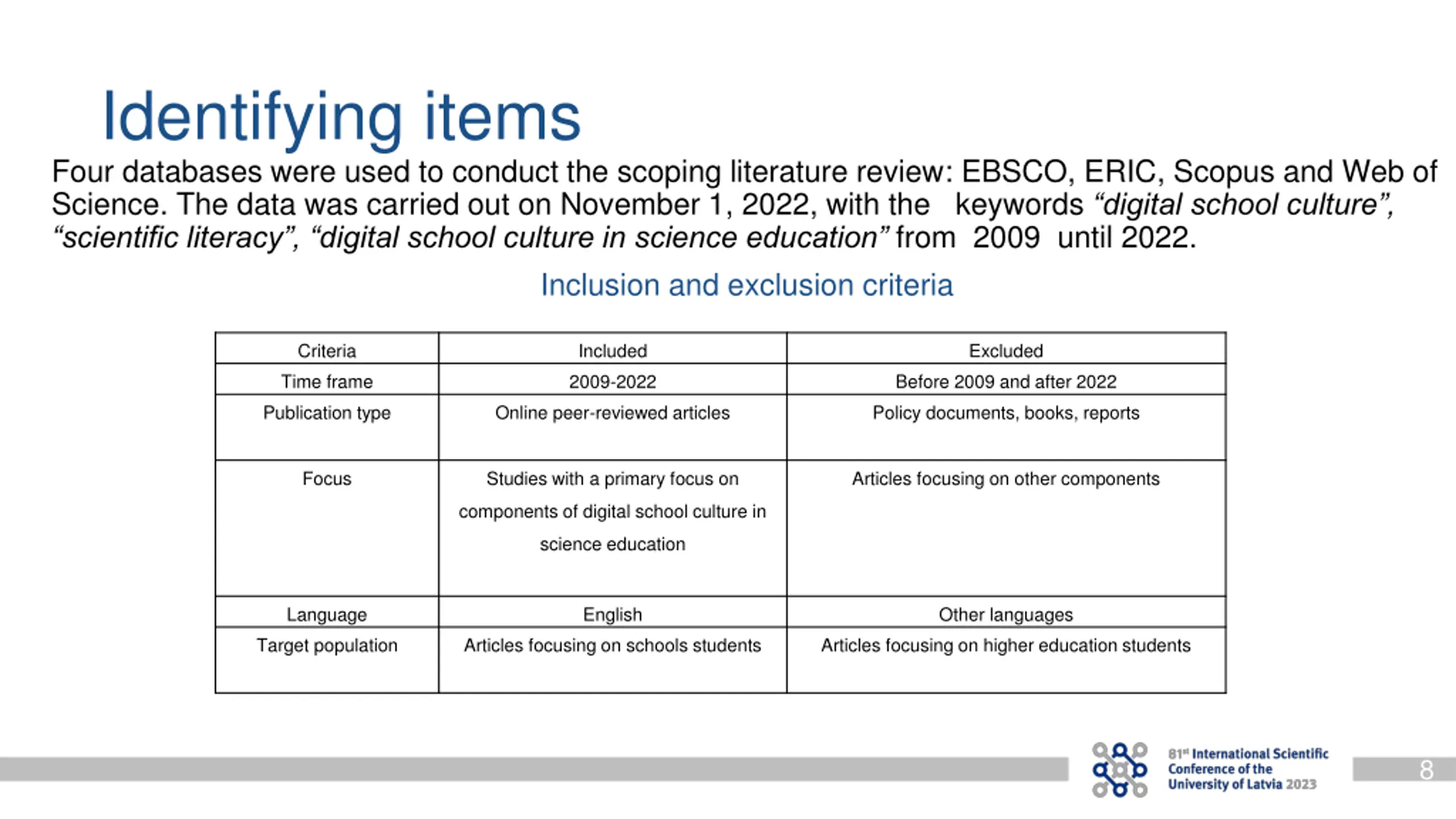 Identifying items Four databases were used to conduct the scoping literature review: EBSCO, ERIC, Scopus and Web of Science. The data was carried out on November 1, 2022, with the keywords digital school culture , scientific literacy , digital school culture in science education from 2009 until 2022. Inclusion and exclusion criteria Criteria Included Excluded Time frame 2009-2022 Before 2009 and after 2022 Publication type Online peer-reviewed articles Policy documents, books, reports Focus Studies with a primary focus on Articles focusing on other components components of digital school culture in science education Language English Other languages Target population Articles focusing on schools students Articles focusing on higher education students 8