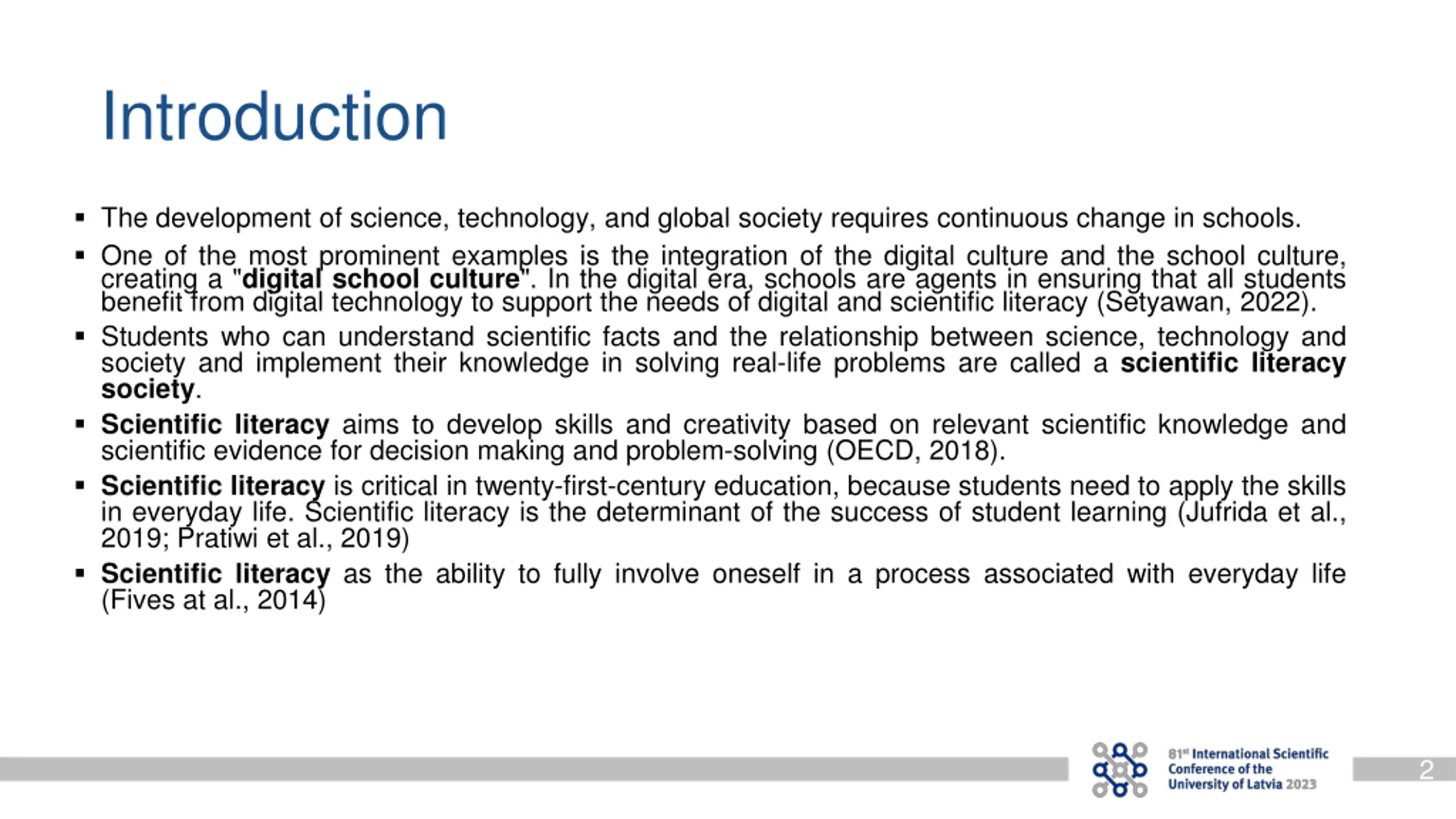 Introduction The development of science, technology, and global society requires continuous change in schools. One of the most prominent examples is the integration of the digital culture and the school culture, creating a "digital school culture". In the digital era, schools are agents in ensuring that all students benefit from digital technology to support the needs of digital and scientific literacy (Setyawan, 2022). Students who can understand scientific facts and the relationship between science, technology and society and implement their knowledge in solving real-life problems are called a scientific literacy society. Scientific literacy aims to develop skills and creativity based on relevant scientific knowledge and scientific evidence for decision making and problem-solving (OECD, 2018). Scientific literacy is critical in twenty-first-century education, because students need to apply the skills in everyday life. Scientific literacy is the determinant of the success of student learning (Jufrida et al., 2019; Pratiwi et al., 2019) Scientific literacy as the ability to fully involve oneself in a process associated with everyday life (Fives at al., 2014) 2