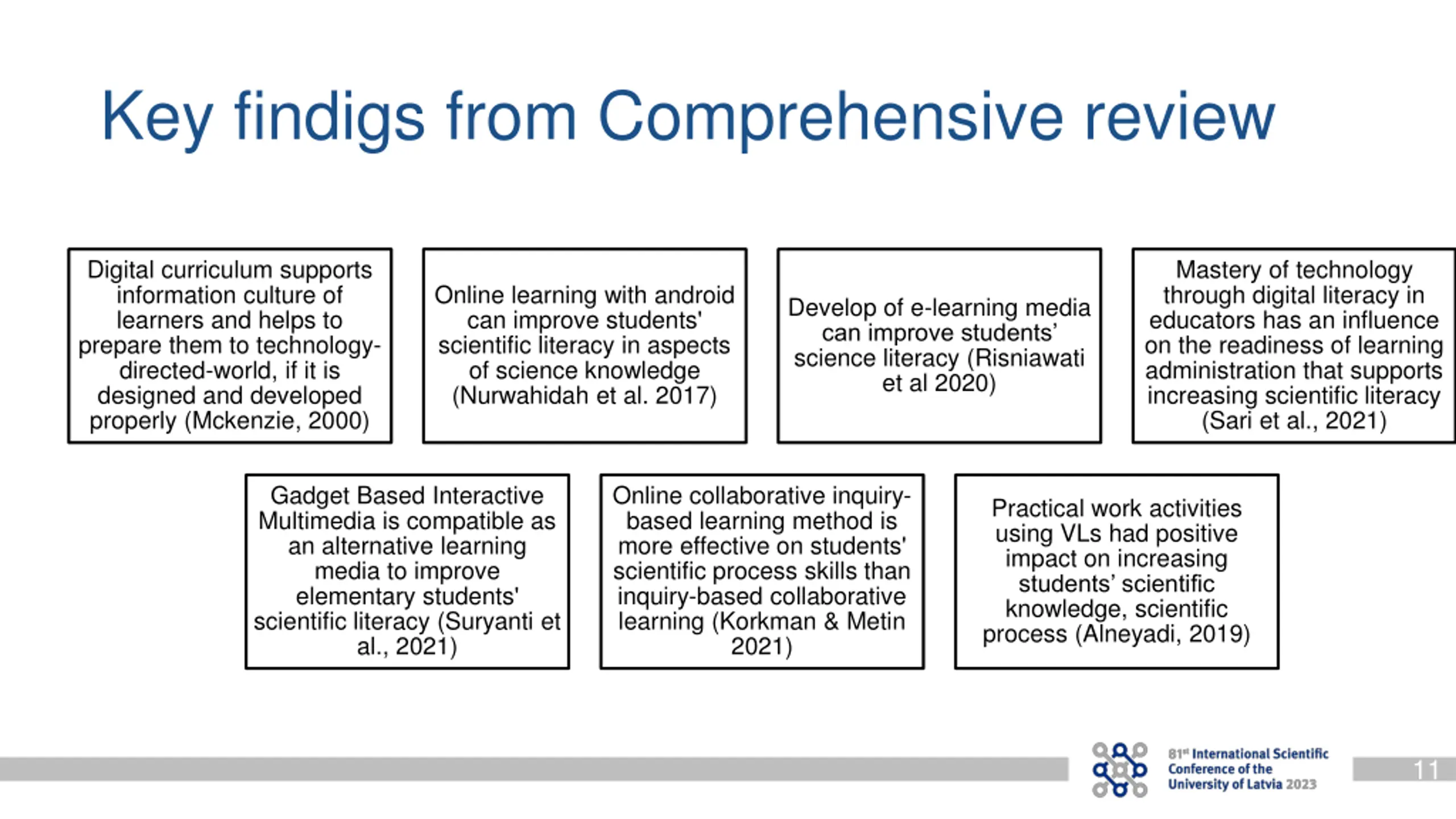 Key findigs from Comprehensive review Digital curriculum supports information culture of learners and helps to prepare them to technology- directed-world, if it is designed and developed properly (Mckenzie, 2000) Mastery of technology through digital literacy in educators has an influence on the readiness of learning administration that supports increasing scientific literacy (Sari et al., 2021) Online learning with android can improve students' scientific literacy in aspects of science knowledge (Nurwahidah et al. 2017) Develop of e-learning media can improve students science literacy (Risniawati et al 2020) Gadget Based Interactive Multimedia is compatible as an alternative learning media to improve elementary students' scientific literacy (Suryanti et al., 2021) Online collaborative inquiry- based learning method is more effective on students' scientific process skills than inquiry-based collaborative learning (Korkman & Metin 2021) Practical work activities using VLs had positive impact on increasing students scientific knowledge, scientific process (Alneyadi, 2019) 11
