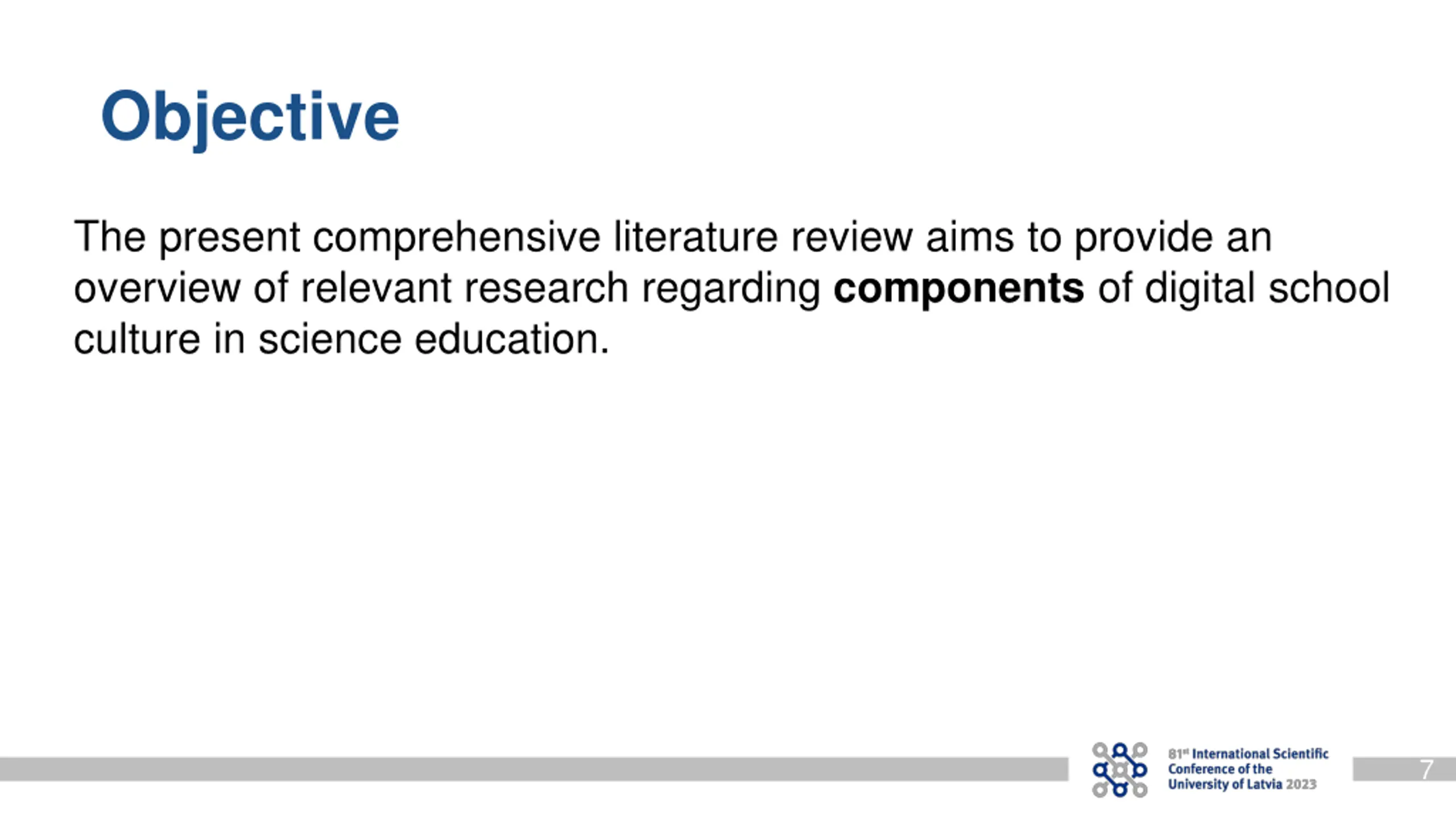 Objective The present comprehensive literature review aims to provide an overview of relevant research regarding components of digital school culture in science education. 7