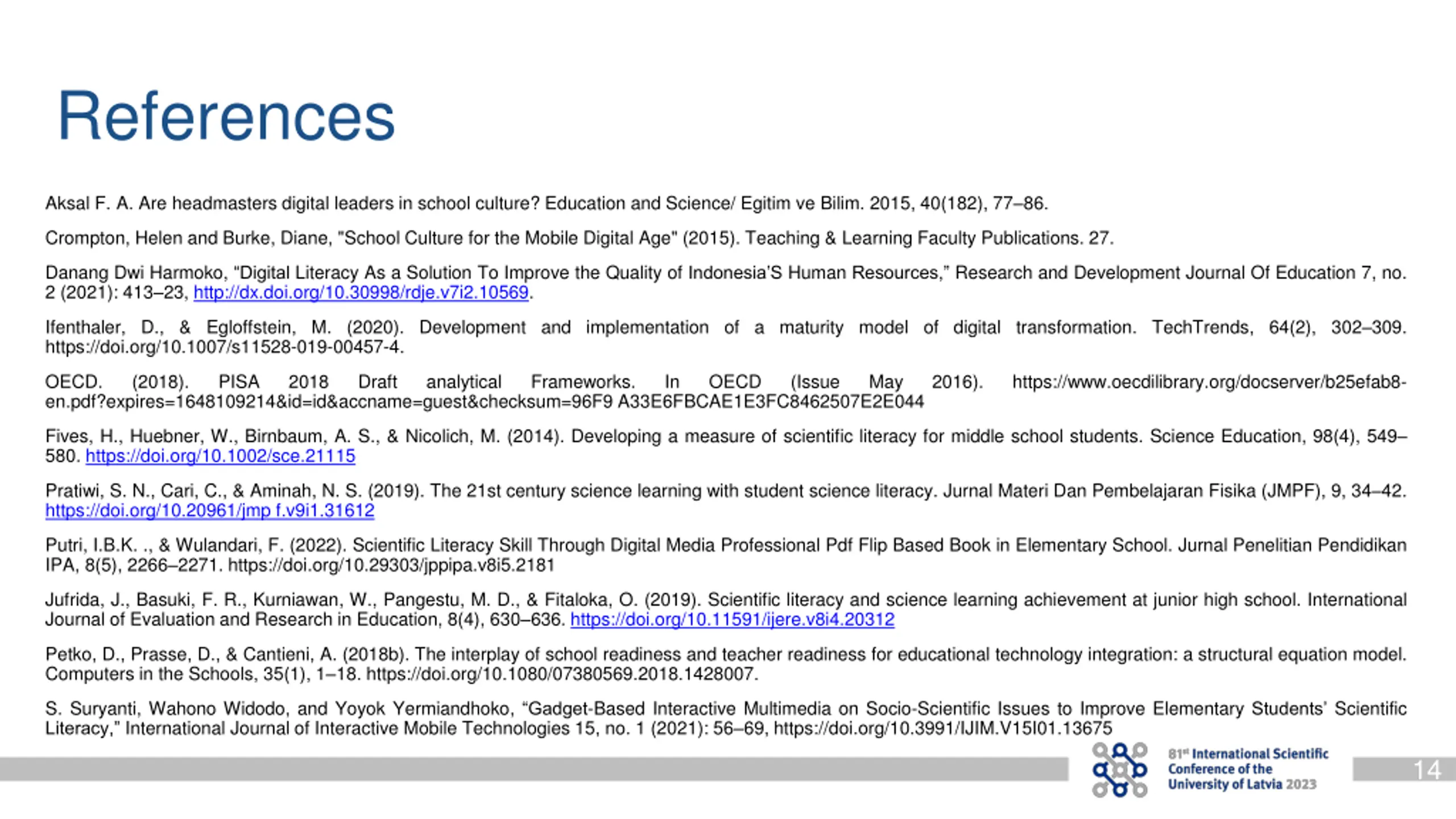 References Aksal F. A. Are headmasters digital leaders in school culture? Education and Science/ Egitim ve Bilim. 2015, 40(182), 77 86. Crompton, Helen and Burke, Diane, "School Culture for the Mobile Digital Age" (2015). Teaching & Learning Faculty Publications. 27. Danang Dwi Harmoko, Digital Literacy As a Solution To Improve the Quality of Indonesia S Human Resources, Research and Development Journal Of Education 7, no. 2 (2021): 413 23, http://dx.doi.org/10.30998/rdje.v7i2.10569. Ifenthaler, D., & Egloffstein, M. (2020). Development and implementation of a maturity model of digital transformation. TechTrends, 64(2), 302 309. https://doi.org/10.1007/s11528-019-00457-4. OECD. en.pdf?expires=1648109214&id=id&accname=guest&checksum=96F9 A33E6FBCAE1E3FC8462507E2E044 (2018). PISA 2018 Draft analytical Frameworks. In OECD (Issue May 2016). https://www.oecdilibrary.org/docserver/b25efab8- Fives, H., Huebner, W., Birnbaum, A. S., & Nicolich, M. (2014). Developing a measure of scientific literacy for middle school students. Science Education, 98(4), 549 580. https://doi.org/10.1002/sce.21115 Pratiwi, S. N., Cari, C., & Aminah, N. S. (2019). The 21st century science learning with student science literacy. Jurnal Materi Dan Pembelajaran Fisika (JMPF), 9, 34 42. https://doi.org/10.20961/jmp f.v9i1.31612 Putri, I.B.K. ., & Wulandari, F. (2022). Scientific Literacy Skill Through Digital Media Professional Pdf Flip Based Book in Elementary School. Jurnal Penelitian Pendidikan IPA, 8(5), 2266 2271. https://doi.org/10.29303/jppipa.v8i5.2181 Jufrida, J., Basuki, F. R., Kurniawan, W., Pangestu, M. D., & Fitaloka, O. (2019). Scientific literacy and science learning achievement at junior high school. International Journal of Evaluation and Research in Education, 8(4), 630 636. https://doi.org/10.11591/ijere.v8i4.20312 Petko, D., Prasse, D., & Cantieni, A. (2018b). The interplay of school readiness and teacher readiness for educational technology integration: a structural equation model. Computers in the Schools, 35(1), 1 18. https://doi.org/10.1080/07380569.2018.1428007. S. Suryanti, Wahono Widodo, and Yoyok Yermiandhoko, Gadget-Based Interactive Multimedia on Socio-Scientific Issues to Improve Elementary Students Scientific Literacy, International Journal of Interactive Mobile Technologies 15, no. 1 (2021): 56 69, https://doi.org/10.3991/IJIM.V15I01.13675 14