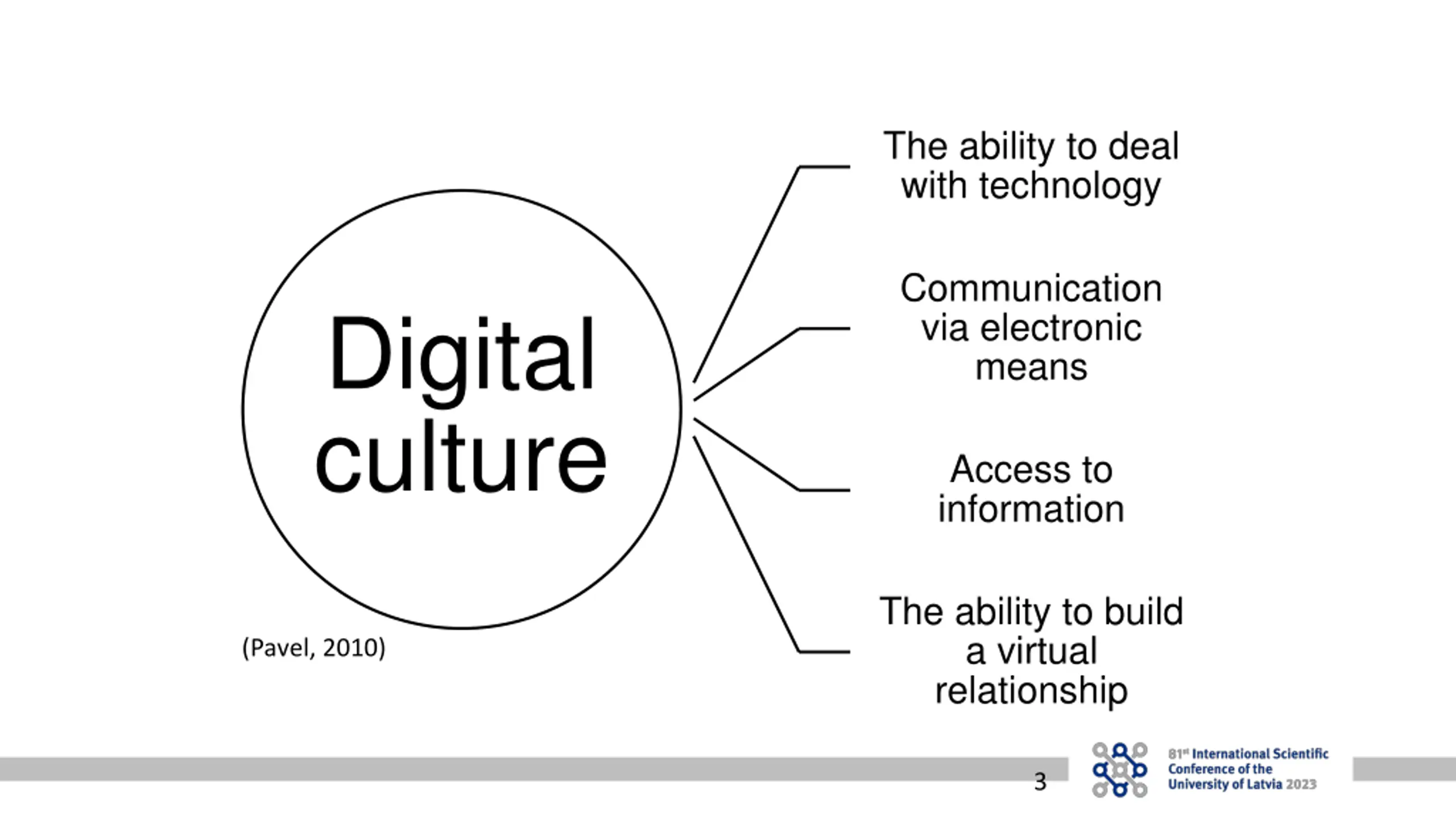 The ability to deal with technology Communication via electronic means Digital culture Access to information The ability to build a virtual relationship (Pavel, 2010) 3