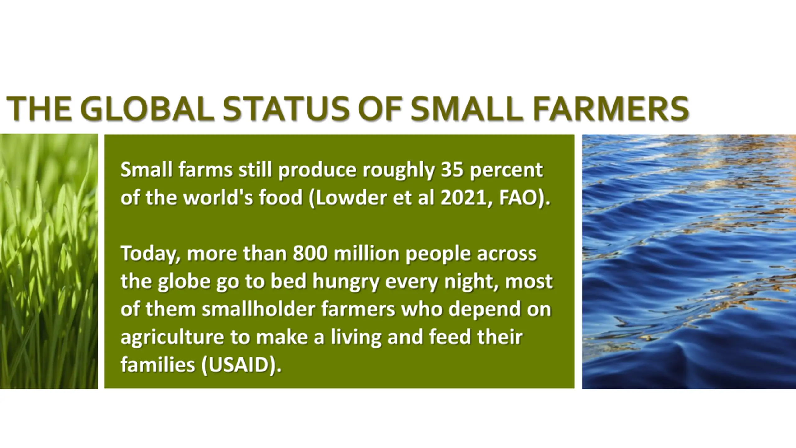 THE GLOBAL STATUS OF SMALL FARMERS Small farms still produce roughly 35 percent of the world's food (Lowder et al 2021, FAO). Today, more than 800 million people across the globe go to bed hungry every night, most of them smallholder farmers who depend on agriculture to make a living and feed their families (USAID).
